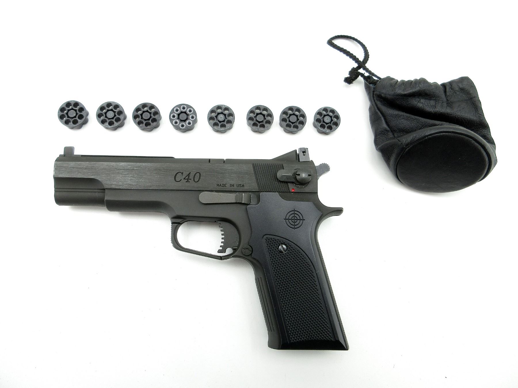 (1) .177 CAL. (4.5MM) PELLET, CO2 REPEATER, STEEL CONSTRUCTION, BLACK POLYMER GRIPS, MARKED: "C40", "CROSMAN", "177 CAL", ETC., NOT FULLY TESTED, SHOWS SOME WEAR & TEAR / USE MARKINGS, WITH HARD PADDED CASE AND ACCESSORIES. SEE PHOTOS.