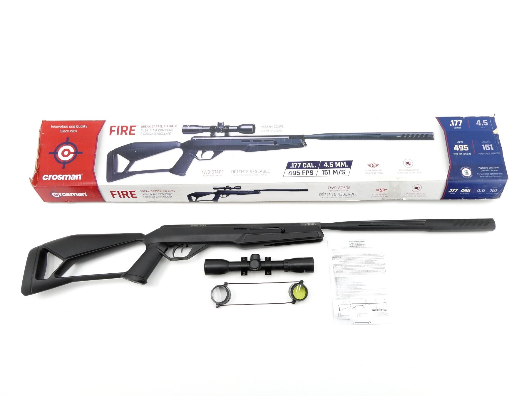 LOT INCLUDES; (1) CROSMAN AIR RIFLE, .177 CAL. (4.5MM) PELLET, BREAK ACTION, UP TO 495 FPS, STEEL & BLACK POLYMER CONSTRUCTION, SPRING POWERED, MODEL #: 7-CF7SXS, SERIAL #: O21X15343, UNTESTED, IN ORIGINAL PACKAGING & (1) CENTER POINT 4 X 32 RIFLE SCOPE, CLEAR OPTICS, DUPLEX RETICLE, 1" TUBE DIAMETER, WINDAGE & ELEVATION KNOBS TURN, MARKED "S 200701", ETC., WITH LENS COVERS & ATTACHED RINGS, SHOWS WEAR & TEAR / USE MARKS. MAY REQUIRE FITTING. SEE PHOTOS.