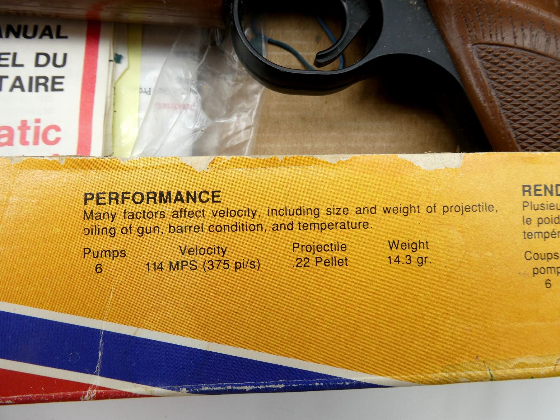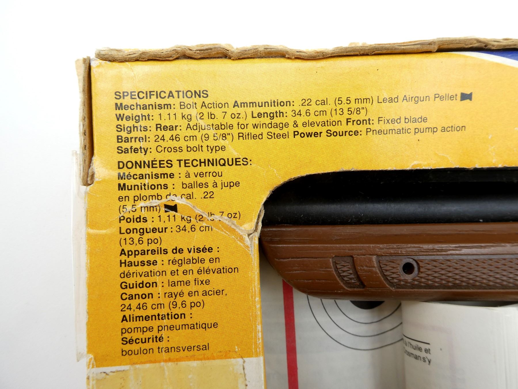 (1) .22 CAL. (5.5MM) PELLET, AIR / SPRING POWERED, SINGLE SHOT, PNEUMATIC PUMP ACTION, SERIAL #: 293302680, NO COCKING ISSUES, NOT FULLY TESTED, SHOWS WEAR & TEAR / USE MARKS, IN ORIGINAL PACKAGING, ETC. SEE PHOTOS.