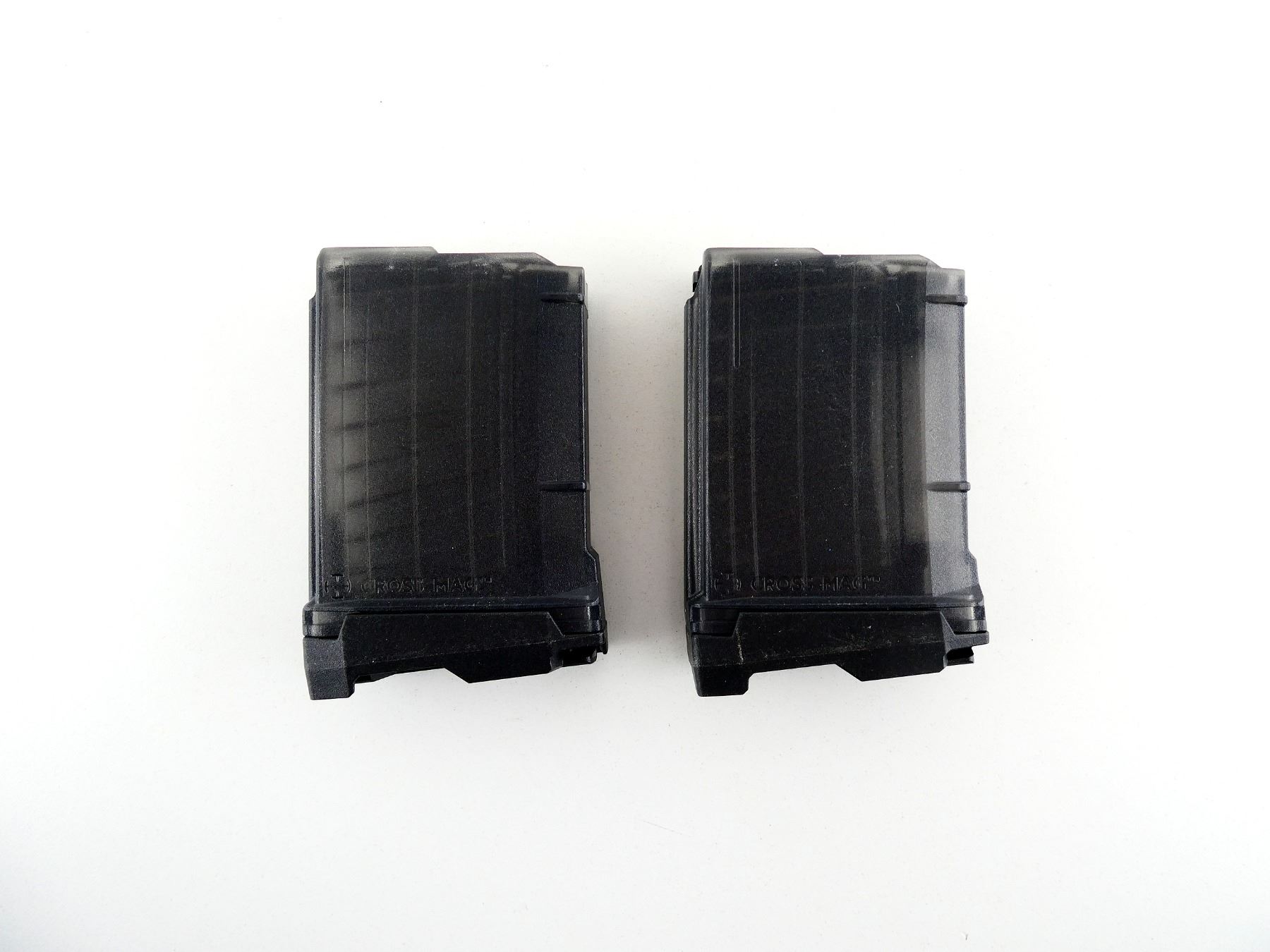 LOT INCLUDES; (2) 5.56MM / .223 REM MAGS, 10 RNDS, SMOKE GREY POLYMER CONSTRUCTION, MARKED: "CROSS INDUSTRIES, AR-15 PISTOL MAGAZINE, 5.56X45 - 10 ROUNDS", ETC. SEE PHOTOS. PAL REQUIRED.