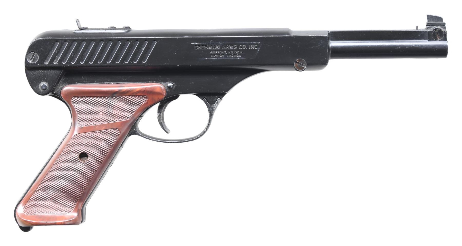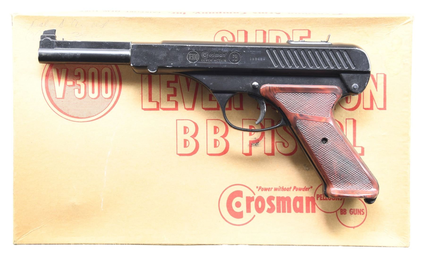 Cal. .177. S# 1230324. Bbl. 4 1/2". Blade front sight. Adjustable rear sight. Vintage Crossman V300 air pistol. Black enamel finish. Checkered brown plastic grips. UNATTACHED ACCESSORIES: original box that shows writing & scattered wear with manual. CONDITION: grips show a few handling marks & scratches. Metal shows scattered edge wear & flaking enamel. (02-24582/MJC). $100-200.