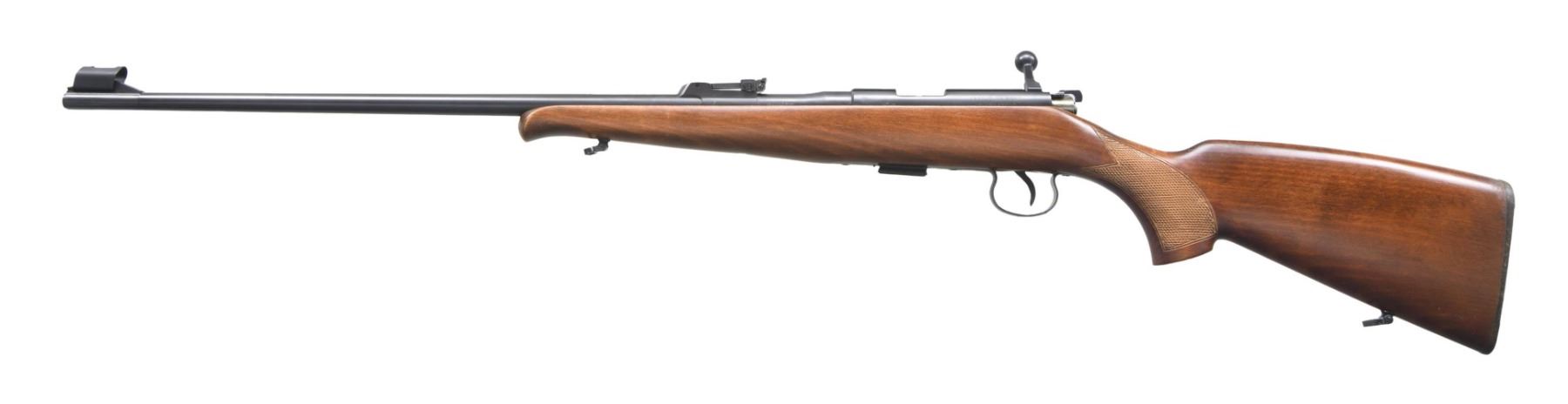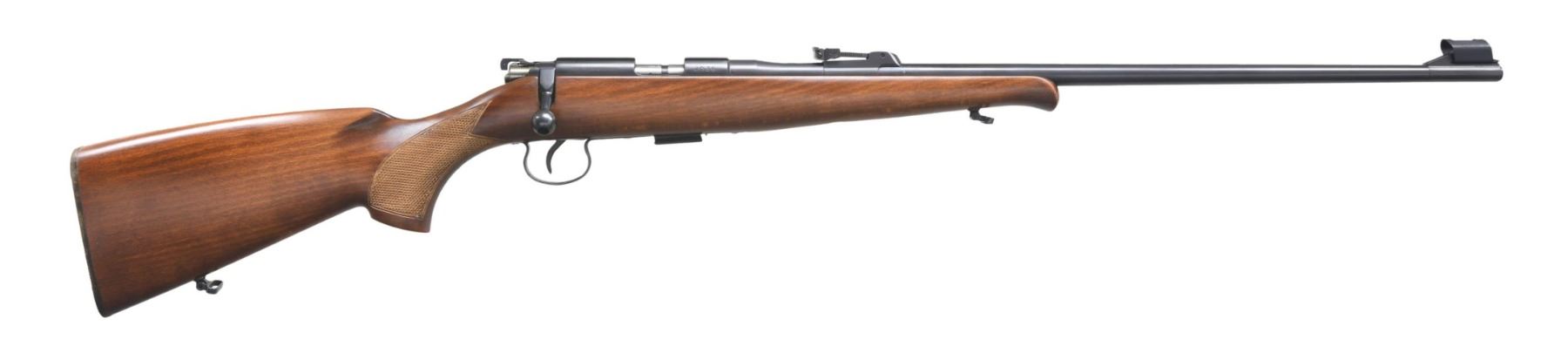 Cal. 22 LR. S# 2036 (proofed 1956 & 1997). While originally a BRNO Model 1 rifle, later replacement parts include hooded blade front sight, tangent rear sight & Checkered beech stock. MAGS: 1 - 5 rd. UNATTACHED ACCESSORIES: box. CONDITION: metal has export reblued finish. Very good stock finish. Bright bore. (24-4992/MD). MODERN. $300-500.