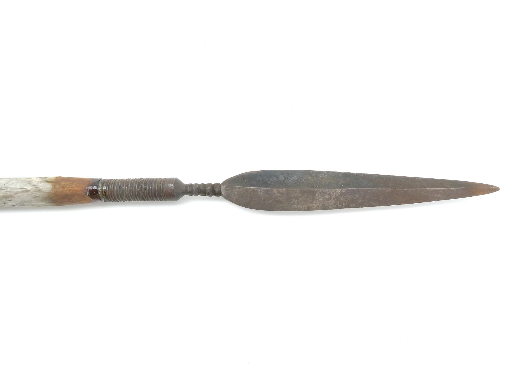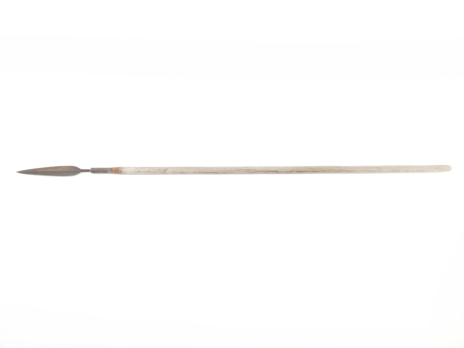 (1) METAL TIP, WOODEN HANDLE, UNMARKED, TIP OVERALL LENGTH APPROX. 14", OVERALL LENGTH APPROX. 66". SEE PHOTOS.