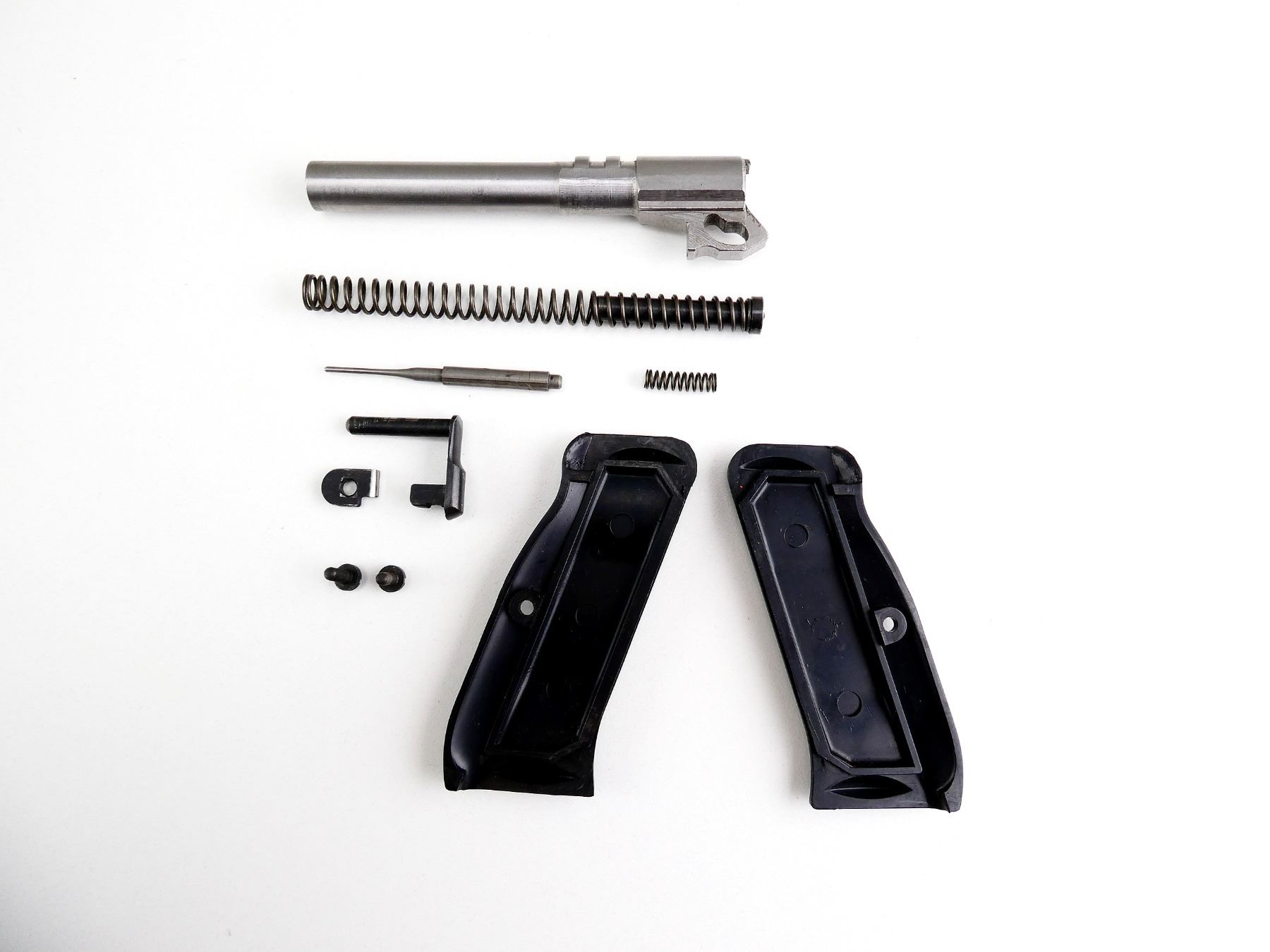 LOT INCLUDES; (1) BARREL, IN THE WHITE STEEL CONSTRUCTION, 9MM LUGER, BORE IS VERY GOOD, MARKED: "G0353", OAL APPROX. 4.5", (1) SET OF GRIPS WITH SCREWS, TAKE-DOWN LEVER, RETURN SPRING, FIRING PIN ASSEMBLY, ETC. MAY REQUIRE FITTING. SEE PHOTOS. PAL REQUIRED.