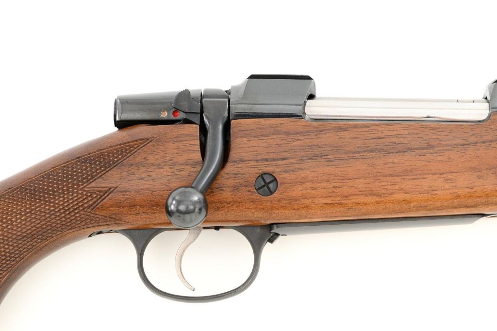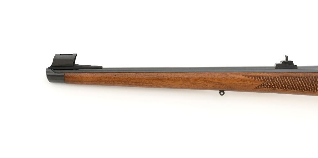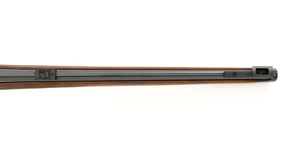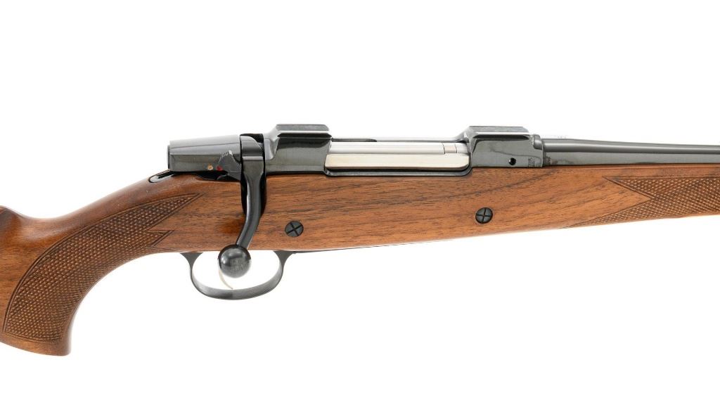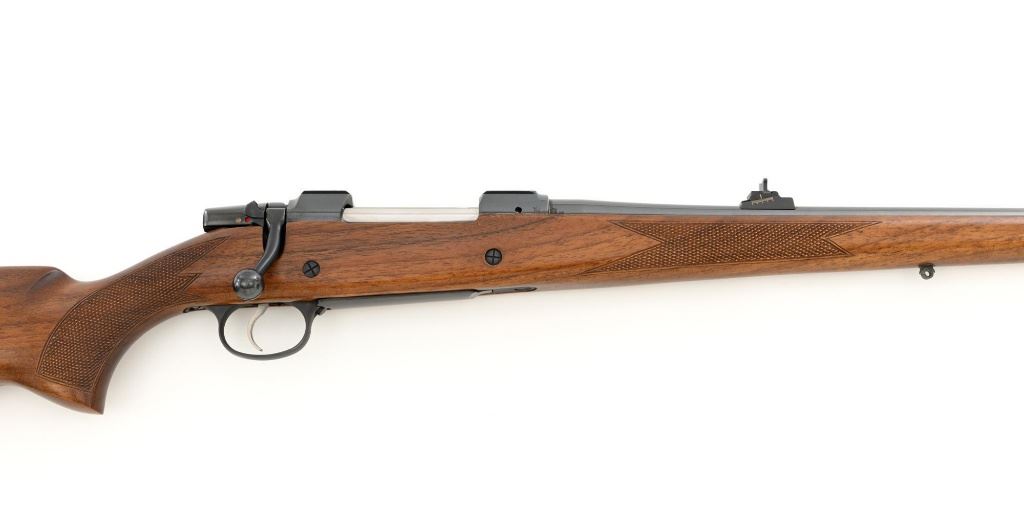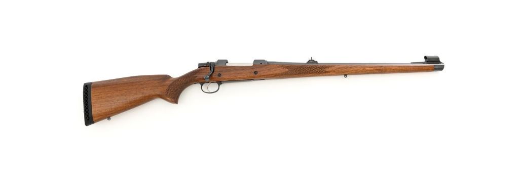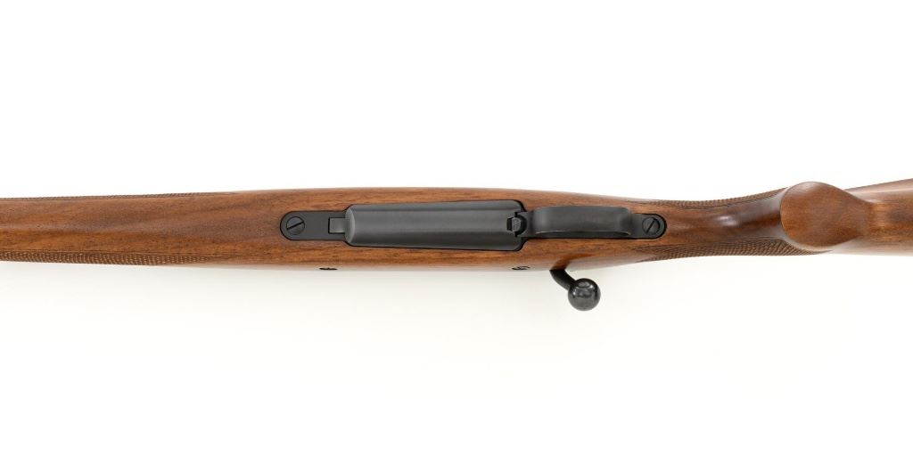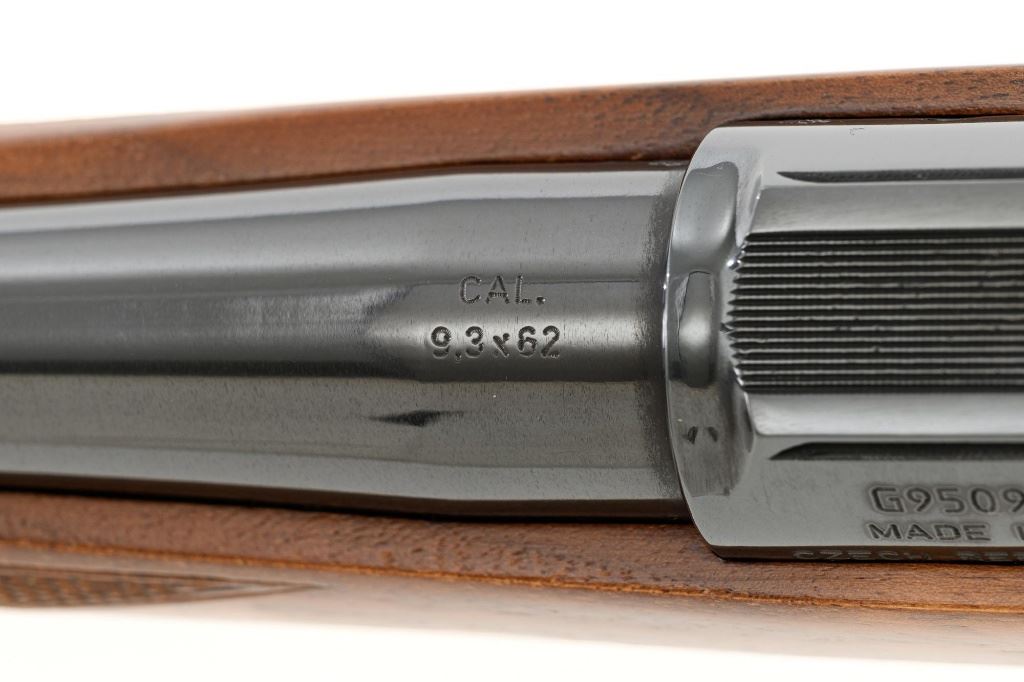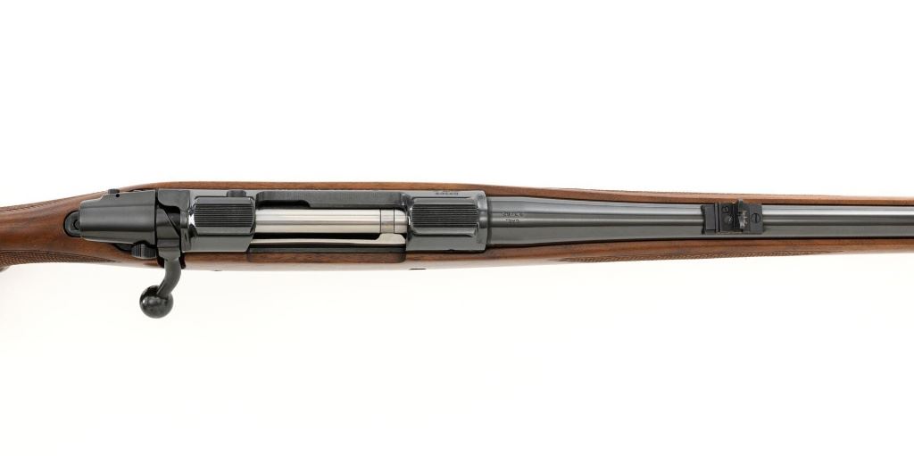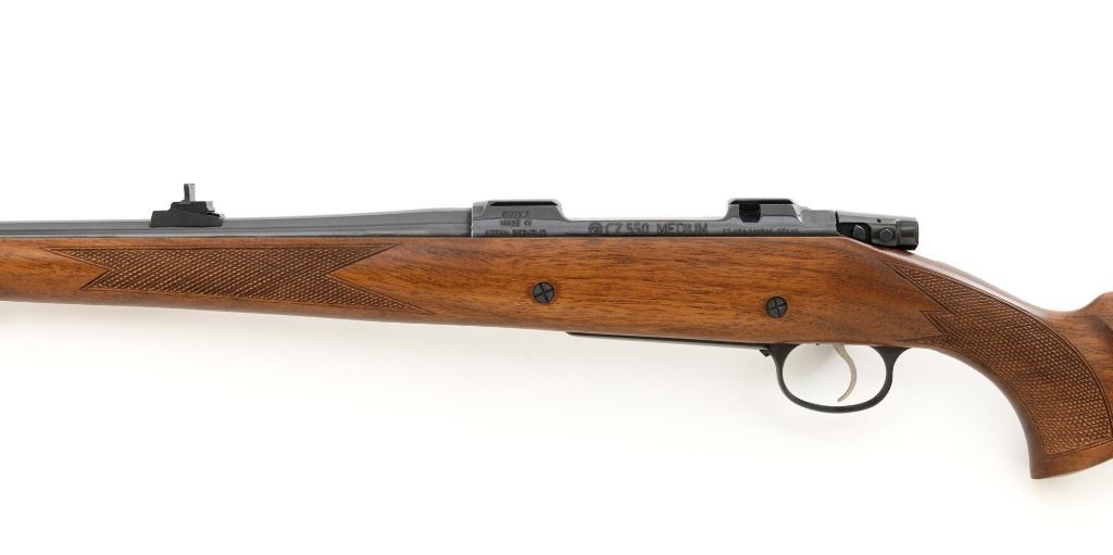 CZ Model 550 Medium Lux Bolt Action Rifle, #G9509, 9.3x62 cal., 20.5" barrel, with polished blue finish. Finely checkered Turkish walnut one-piece Mannlicher style pistol grip stock with European "hogback" buttstock, featuring a blue steel nose cap, two crossbolts, cheekpiece, sling swivel studs, ends with a black CZ ventilated rubber recoil pad, providing a 14.25" LOP. Rifle also features a hooded ramped blade front sight, adjustable "U"-notched rear sight, single set trigger, and 4-shot hinged box magazine. Rifle is excellent, appearing as new, retaining approx. 99% factory finish, with only light handling marks. Receiver includes double square bridge integral factory mounts. Stock is excellent with outstanding fit and finish. Action functions smoothly and the single set trigger functions well and breaks crisply. Bore is mirror bright with excellent rifling. Developed in 1905, the 9.3 x 62 cartridge has been popular with game hunters around the world for over 120 years and remains in use today. Est.: $1,000-$1,500. (Modern)