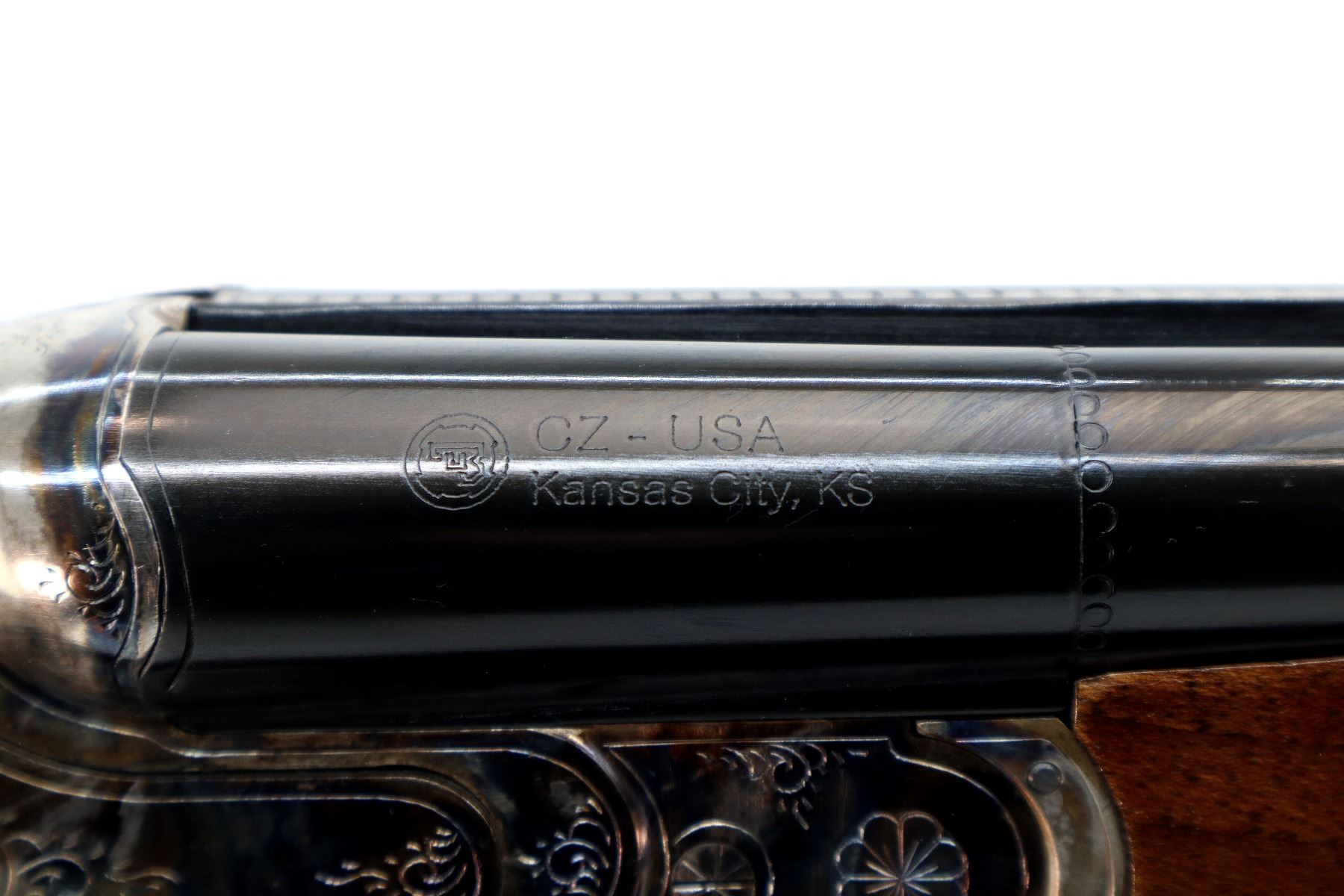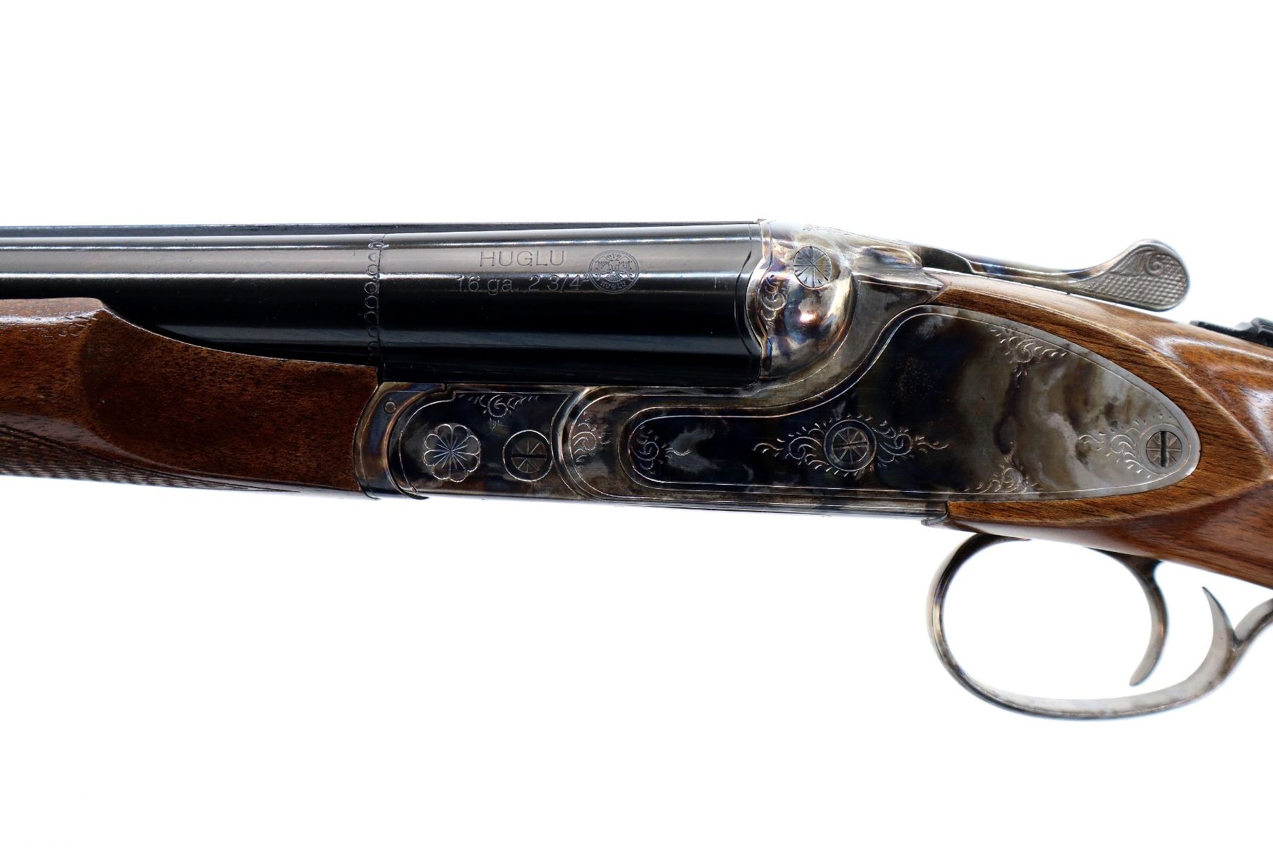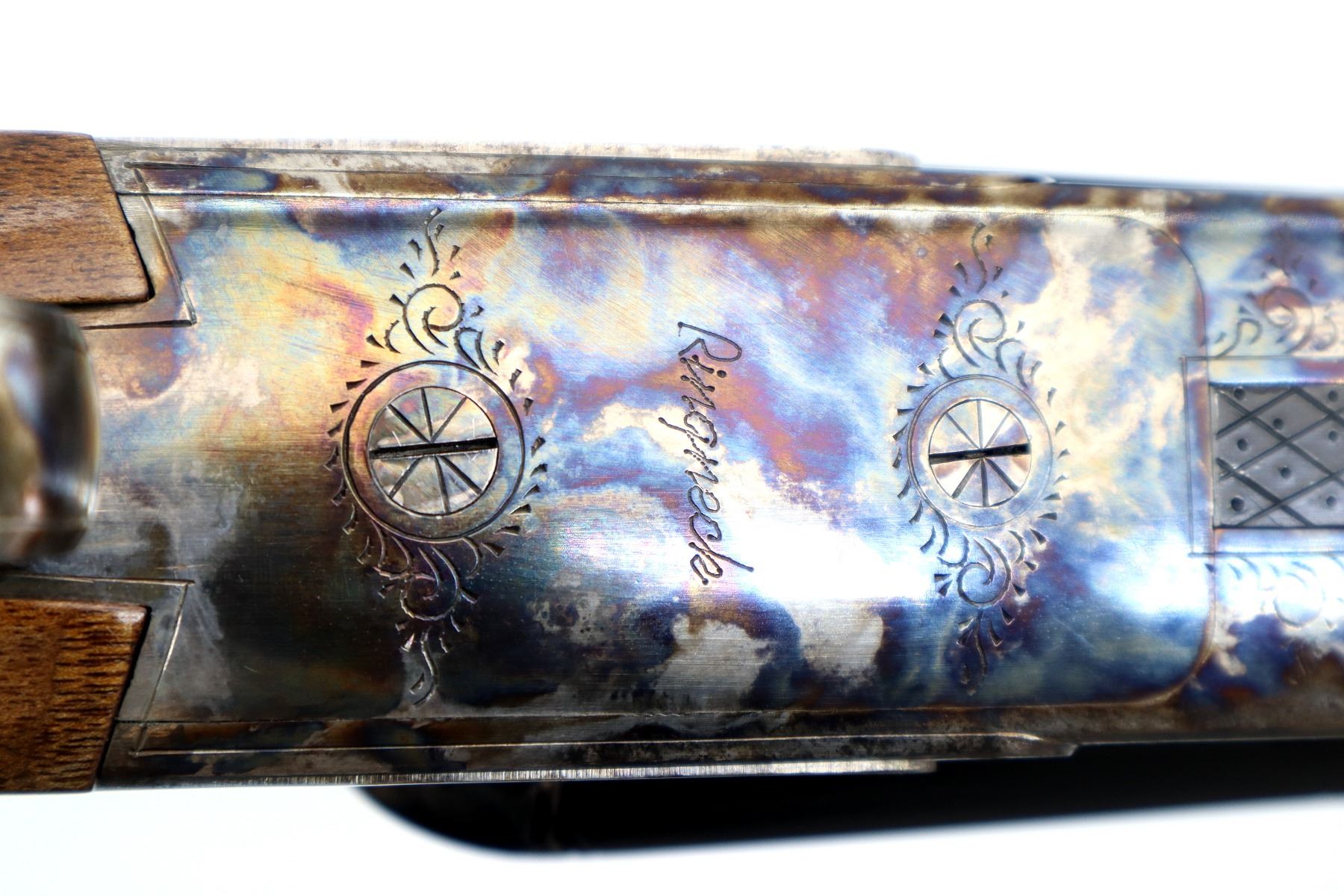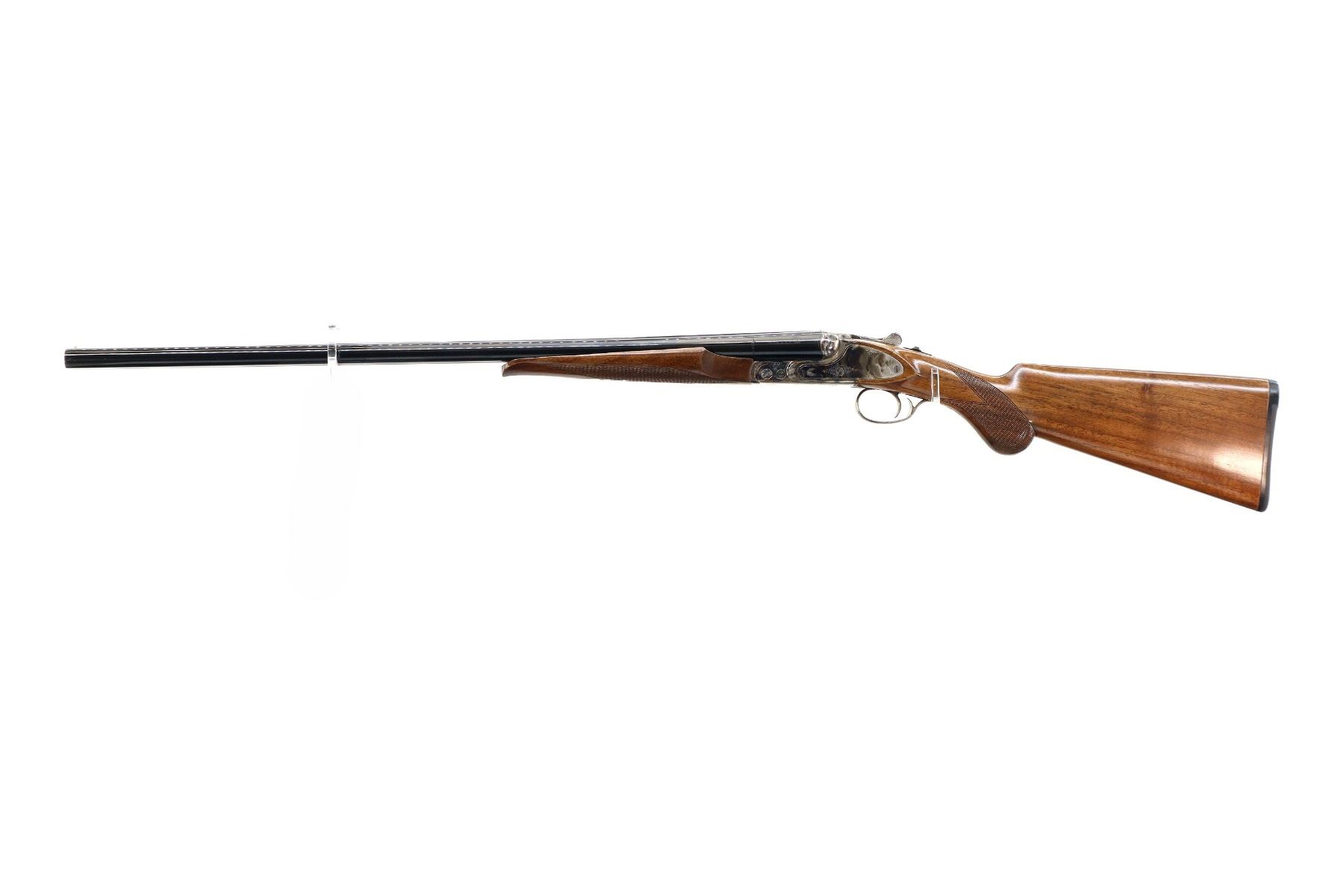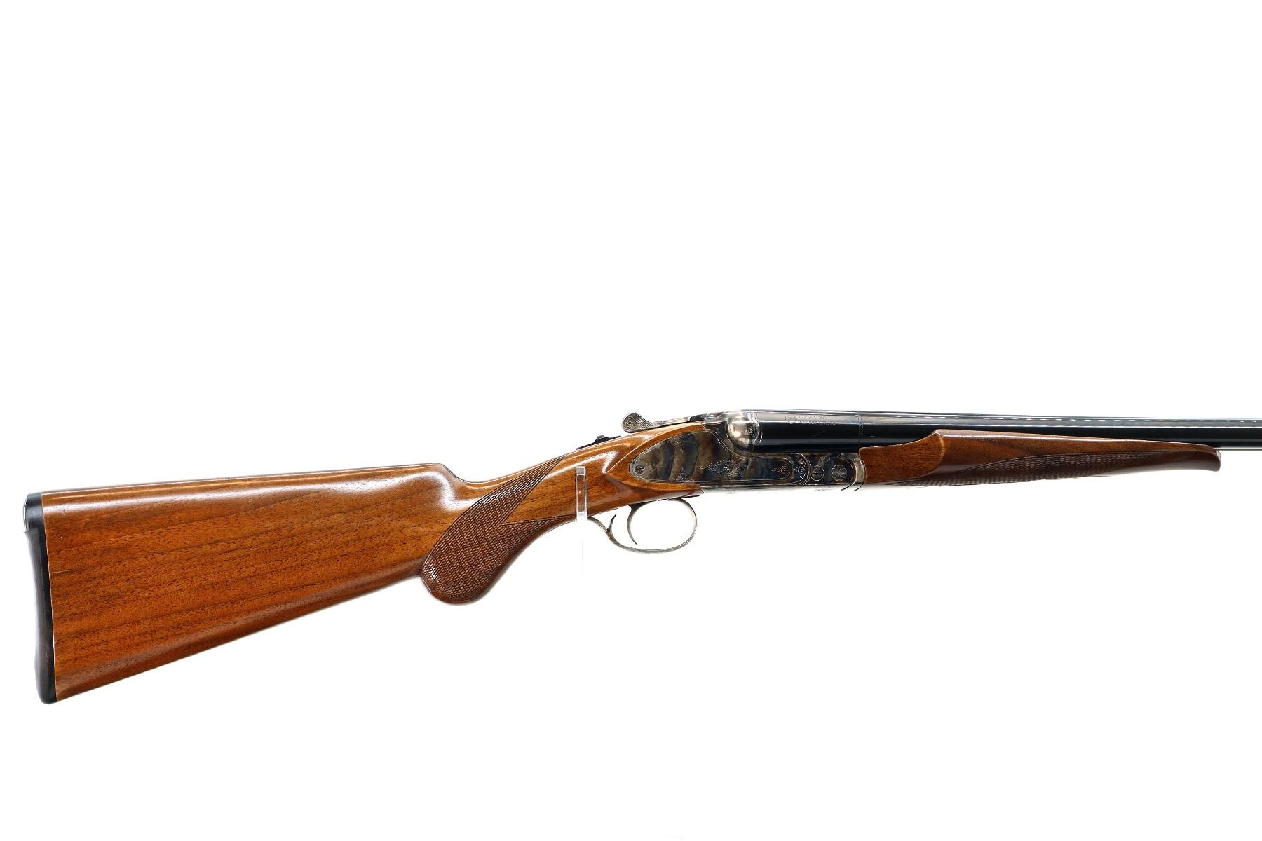 Main Description: Brass bead, polish blued barrels with raised rib, engraved colour case hardened receiver with side plates, manual selective safety, extractor, single mechanical trigger. Two piece wood stocks, checkered Beavertail forearm and pistol grip, black rubber recoil pad.