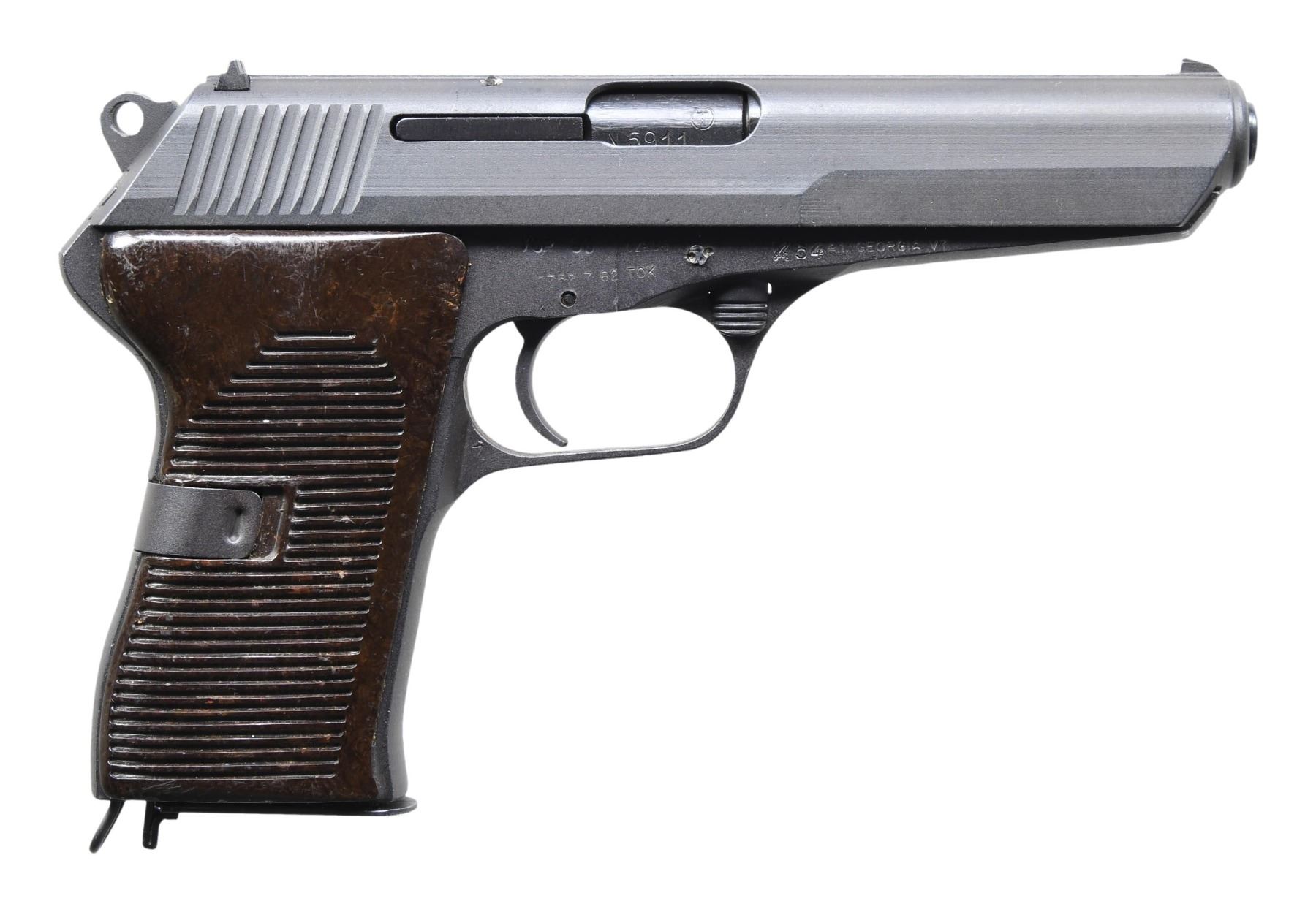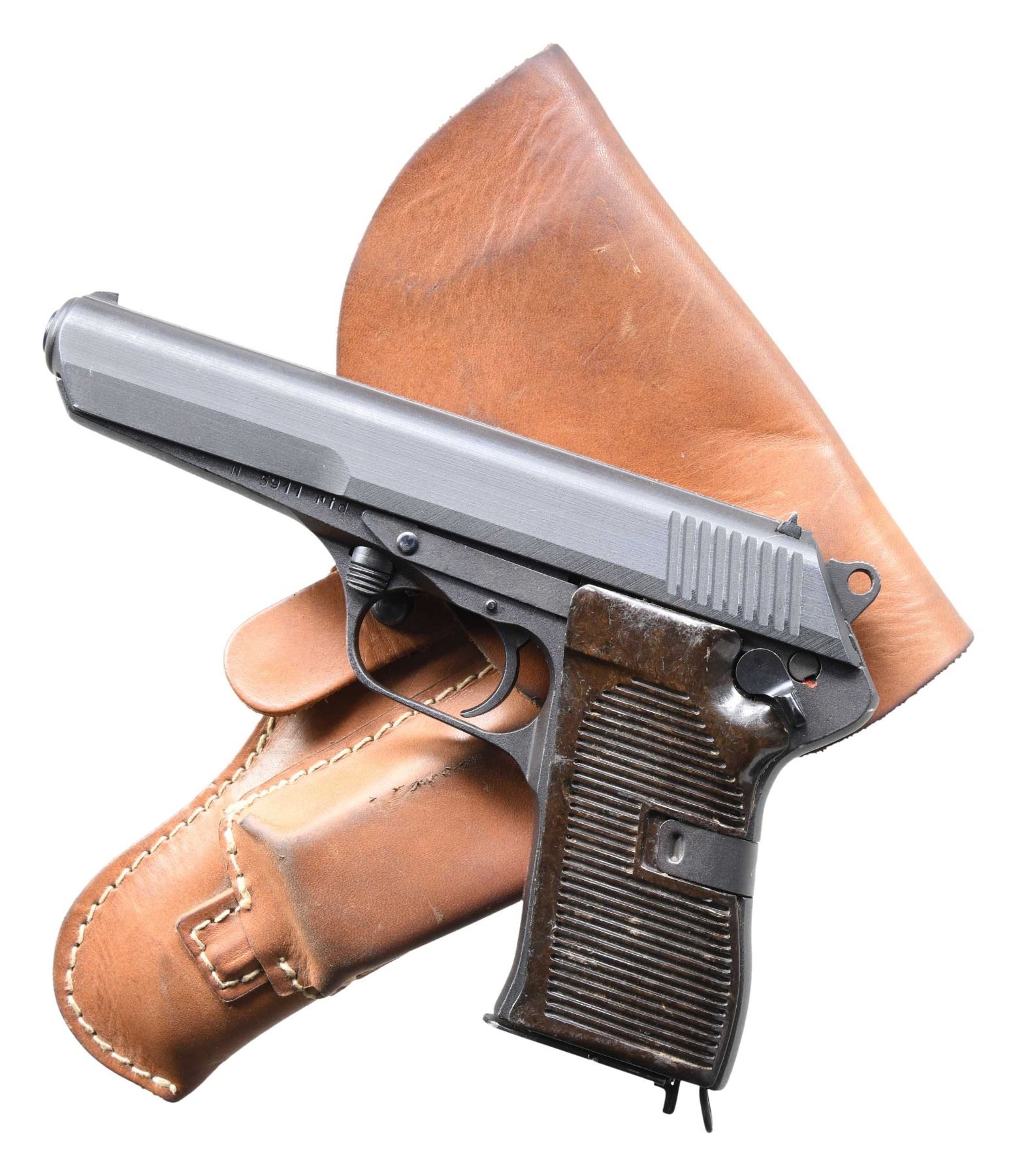 Cal. 7.62x25. S# N5911. Bbl. 4 3/4". Blade front sight. U-notch rear sight. Matching numbers on frame & bbl. Right side of frame has Century import marking, 1954 date with crossed swords & "VOP 90" marking. Matte gray phosphate finish. Grooved brown bakelite grips. MAGS: 1-8 rd. UNATTACHED ACCESSORIES: tan holster with cleaning rod. CONDITION: grips show scattered handling marks & some flaking finish. Metal retains 95-97% arsenal rework gray phosphate with scattered edge & handling wear. Action functions properly when hand cycled. Very good bore with strong rifling. (25-2128/MJC). CURIO. $250-350.