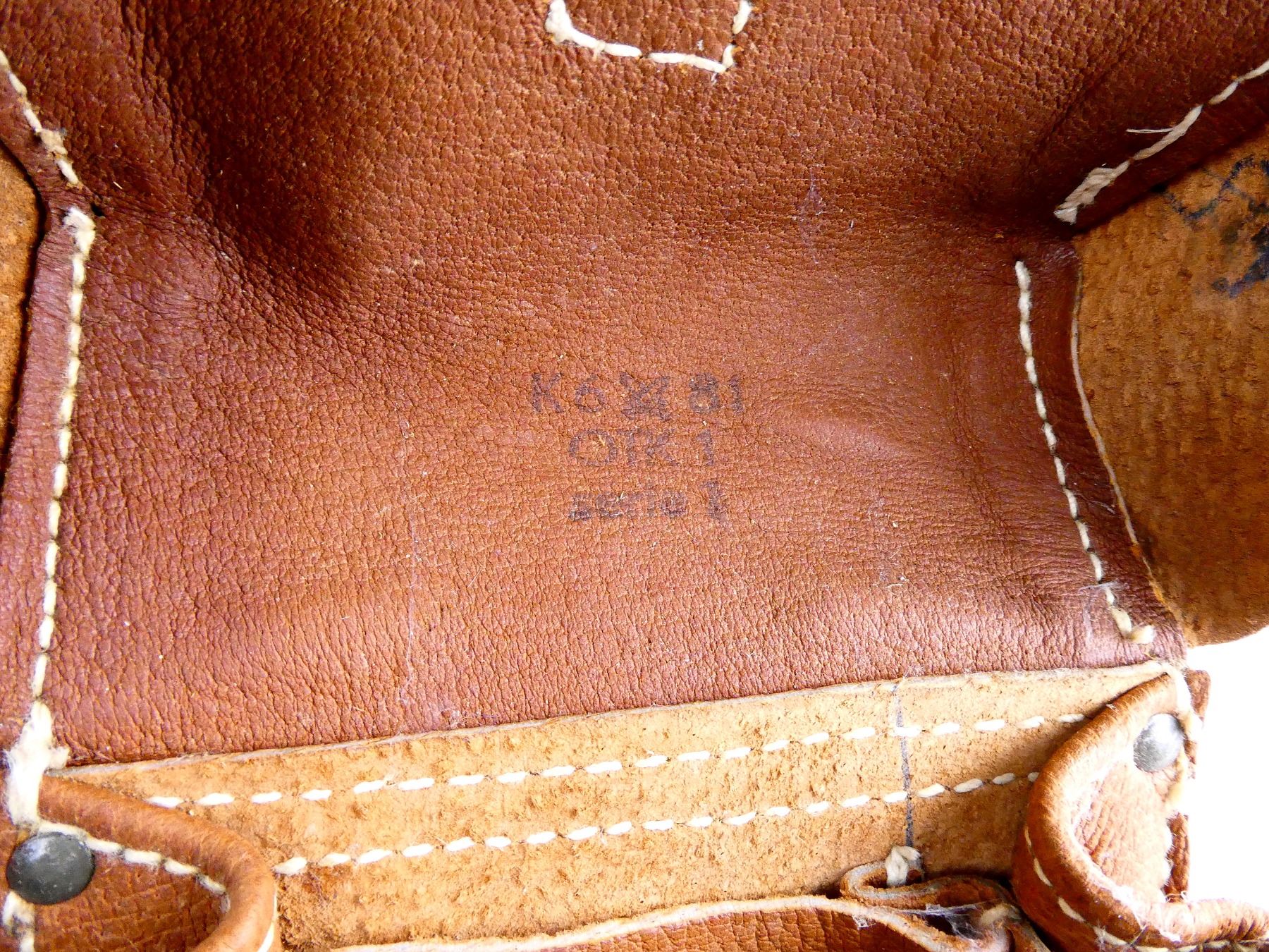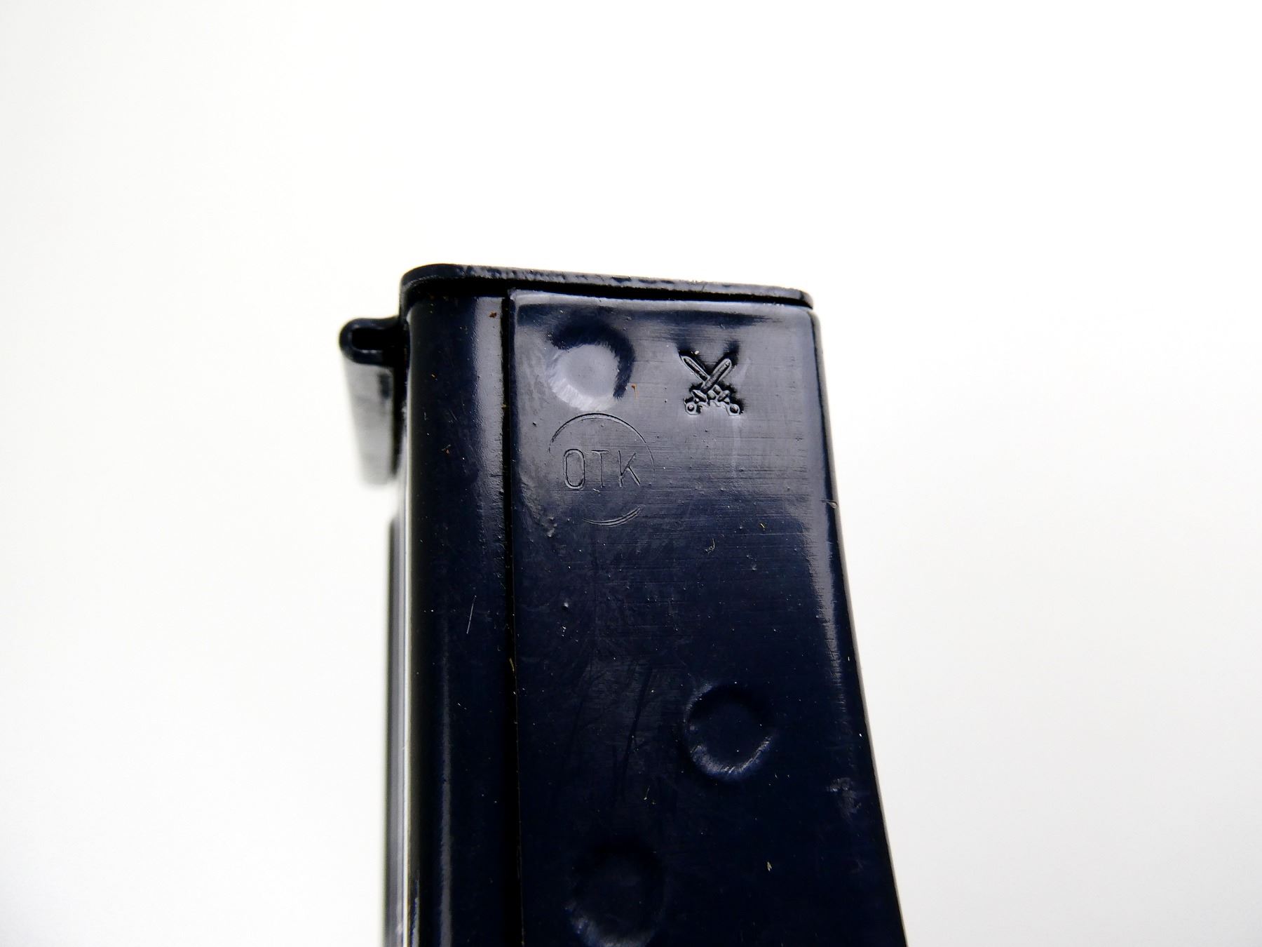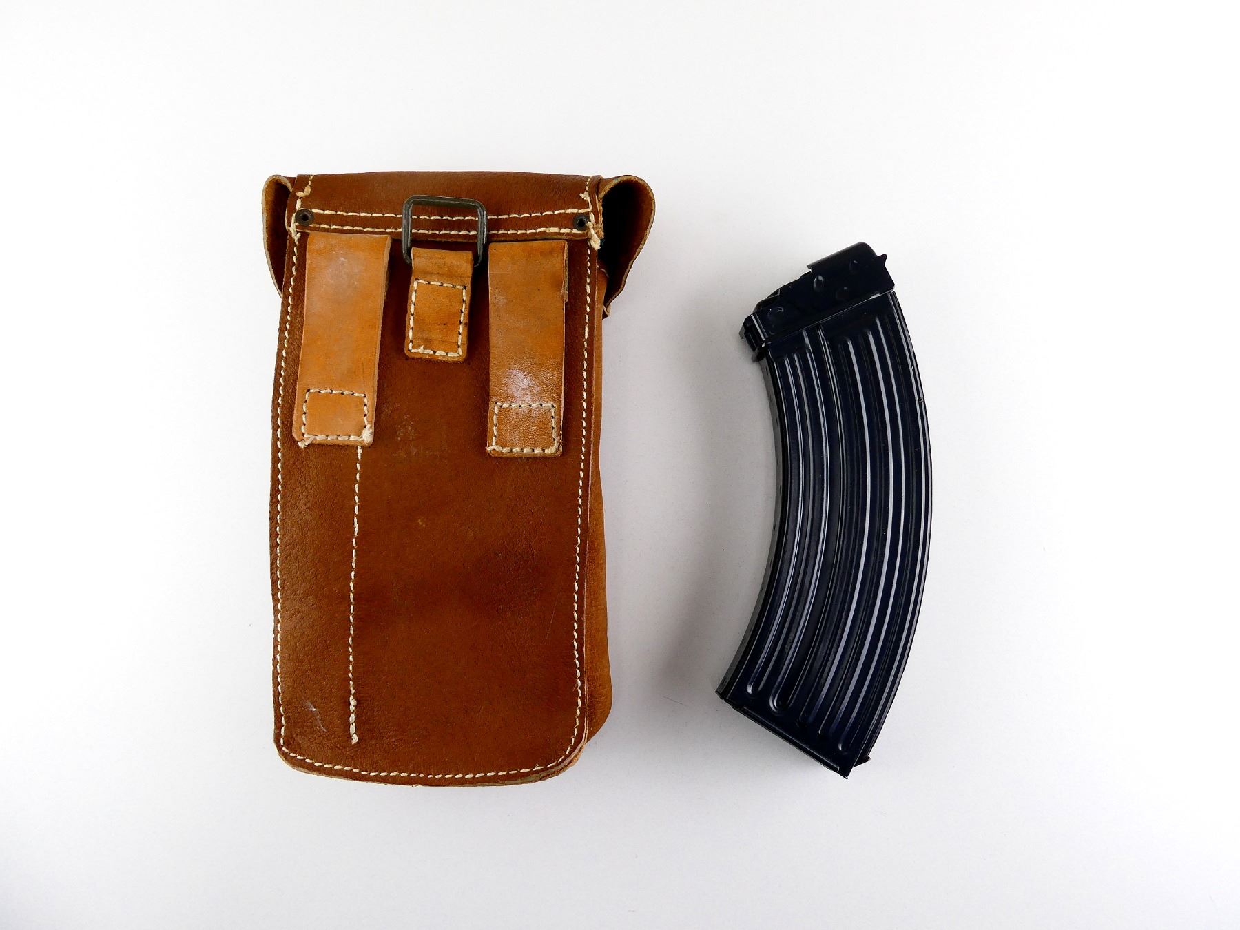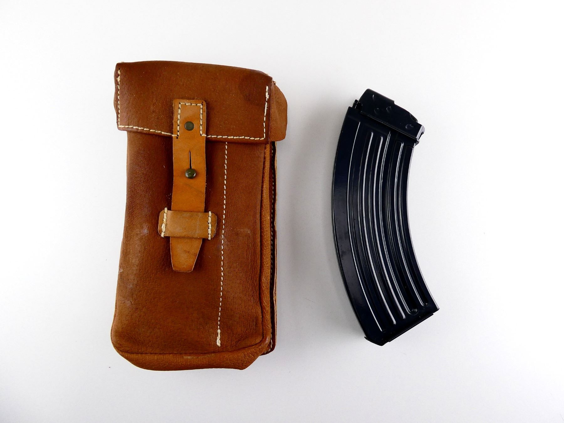 LOT INCLUDES; (1) 7.62X39MM, 5/30 ROUND PINNED MAG, GREY PAINTED ALLOY CONSTRUCTION, MARKED: "OTK" & PROOF MARK & (1) BROWN LEATHER DOUBLE-POCKET MAG POUCH WITH METAL FITTINGS AND BELT LOOPS, FAINT / UN-CLEAR MARKINGS. SEE PHOTOS. PAL REQUIRED.