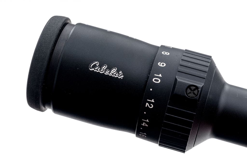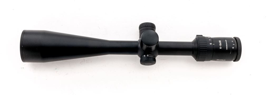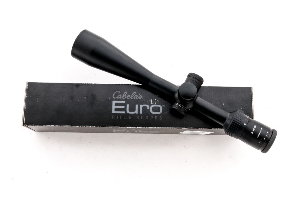 Cabela's Euro Rifle Scope, mfg'd by Meopta, 6-18x50, with range-finding reticle, matte black finish, rubber lens covers, and side-focus perallax adjustment. In original box with misc. factory paperwork. Condition is excellent, appearing near new, with slight scope ring marks and a single small scratch to the eyepiece bell. Optics are crystal clear. Est.: $300-$500.
