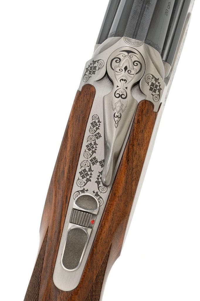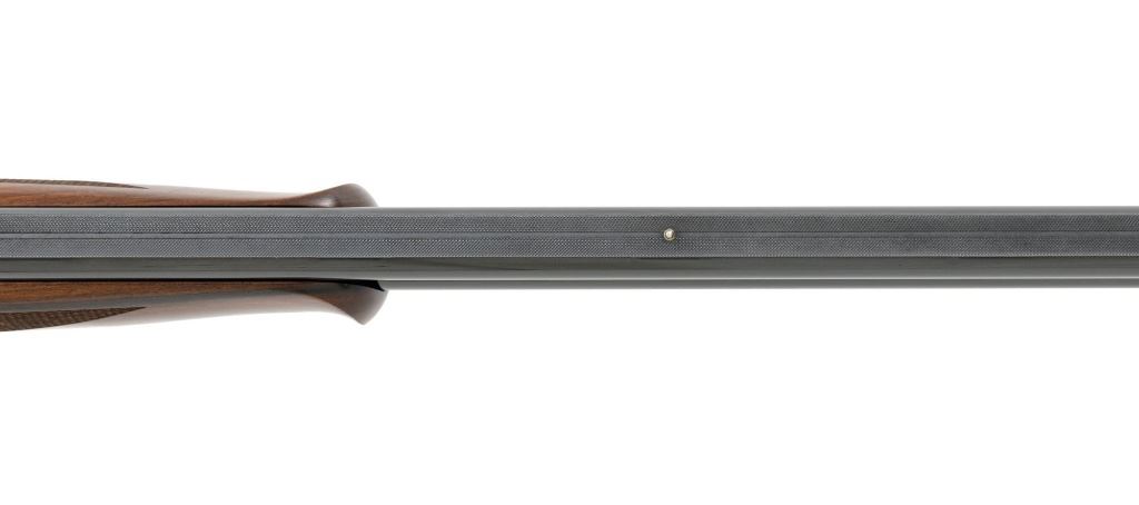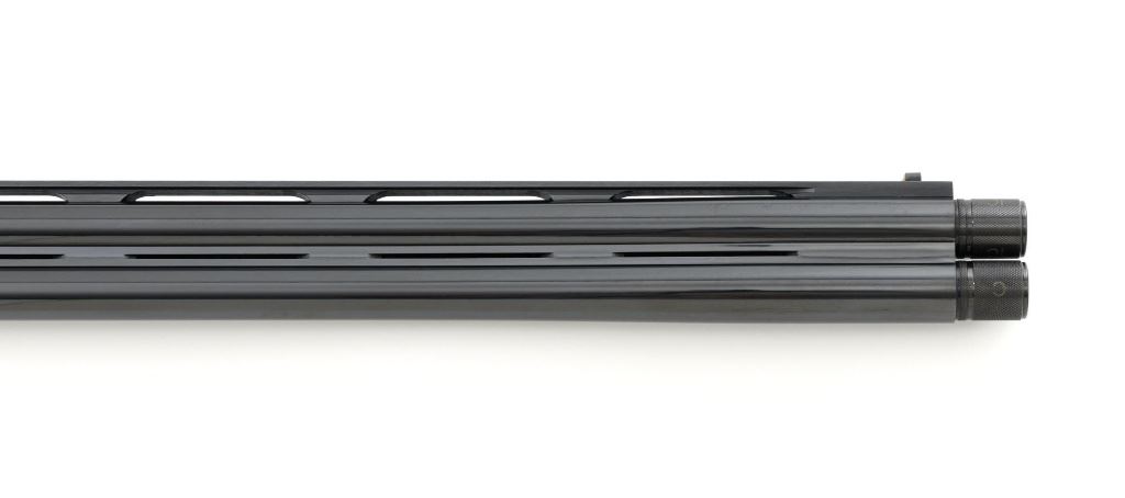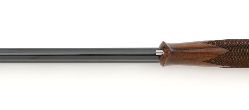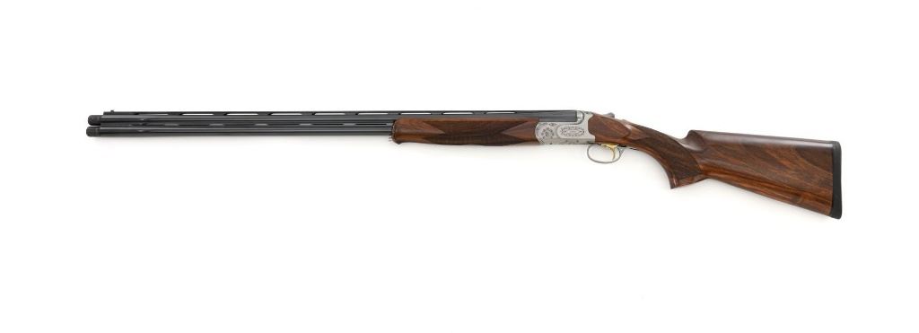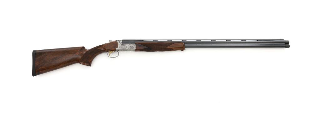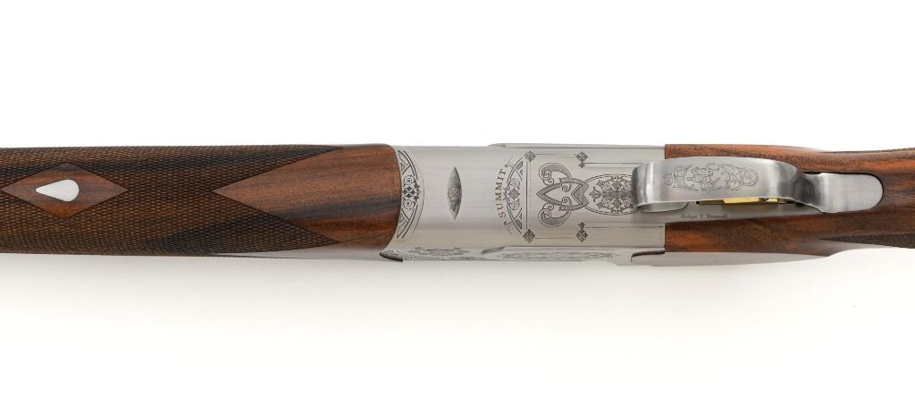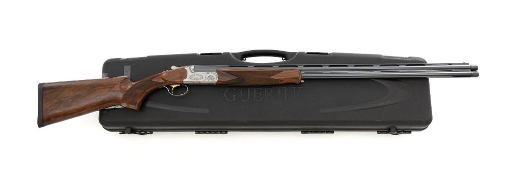 Caesar Guerini Summit Sporting Model Over/Under Shotgun, #138658, 20 ga.. 32" barrels have 10mm parallel vent rib with target beads, 2-3/4" chambers and are fitted for Guerini extended choke tubes (Four included; CYL, SKT, IC, IC). The boxlock action features a single locking lug, single selective and adjustable inertia trigger, non-automatic safety, and selective ejectors. Receiver is coin finished in gray "Tinaloy", lightly engraved with Guerini logos, and including other surrounding engraving on the receiver and trigger guard. Forend is a slender walnut, with push-button release, Schnabel forend, and extensive checkering; pistol grip buttstock is matching "D" grade walnut, with full pistol grip, right hand palm swell, oil finished, and thoroughly checkered at 22 LPI to match forend, and fitted with a black Guerini buttpad. Stock dimensions are 15" x 1-1/2" x 2-3/8". Mfgd 2014. All components contained in a black plastic Guerini hard case including tubes, tools, and accessories. Condition is like new, with almost no marks to wood and little wear to action, which closes very tight and functions perfectly; bores are mirror bright. A high quality target gun. Est.: $2,500-$3,500. (Modern)