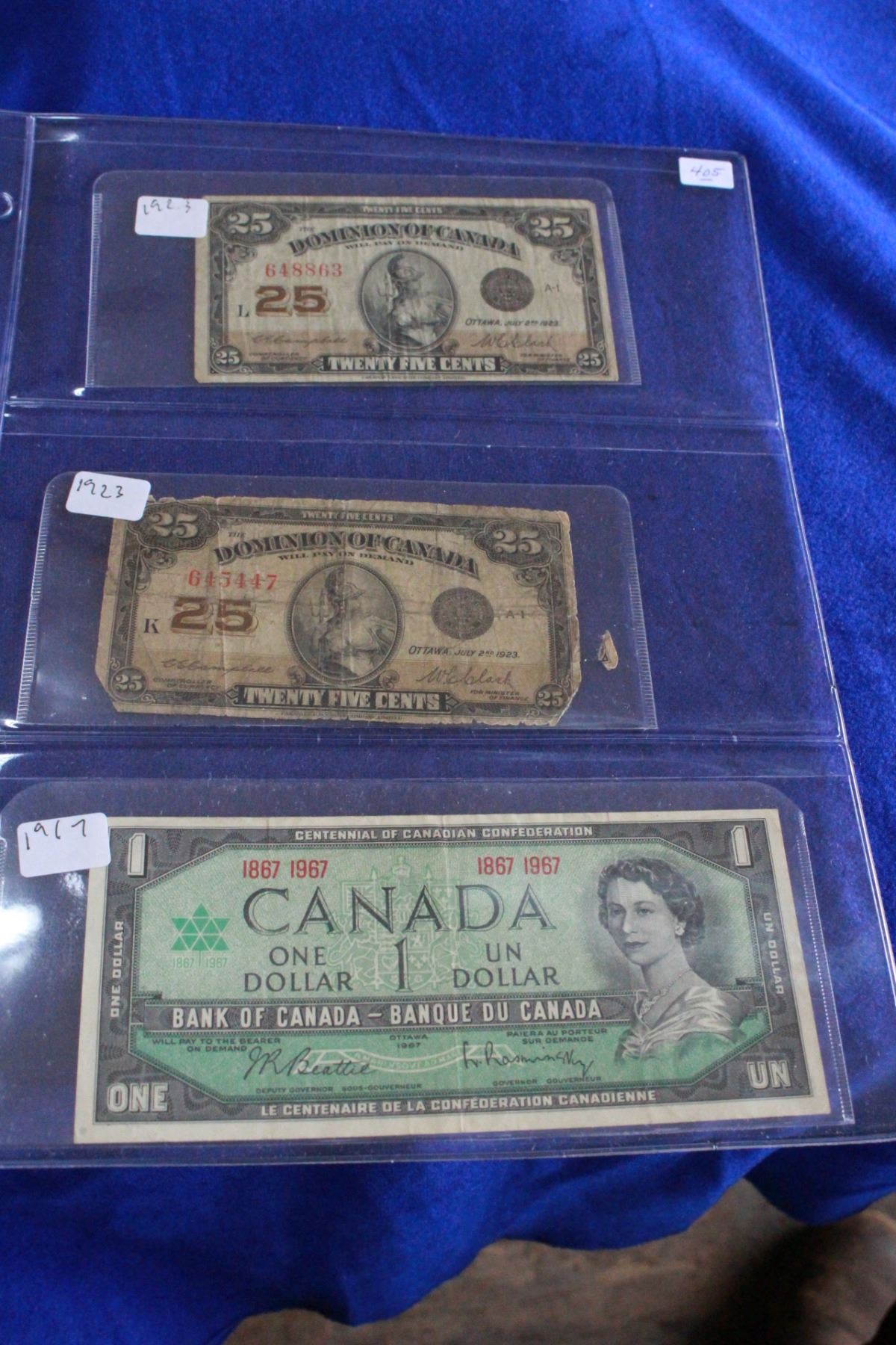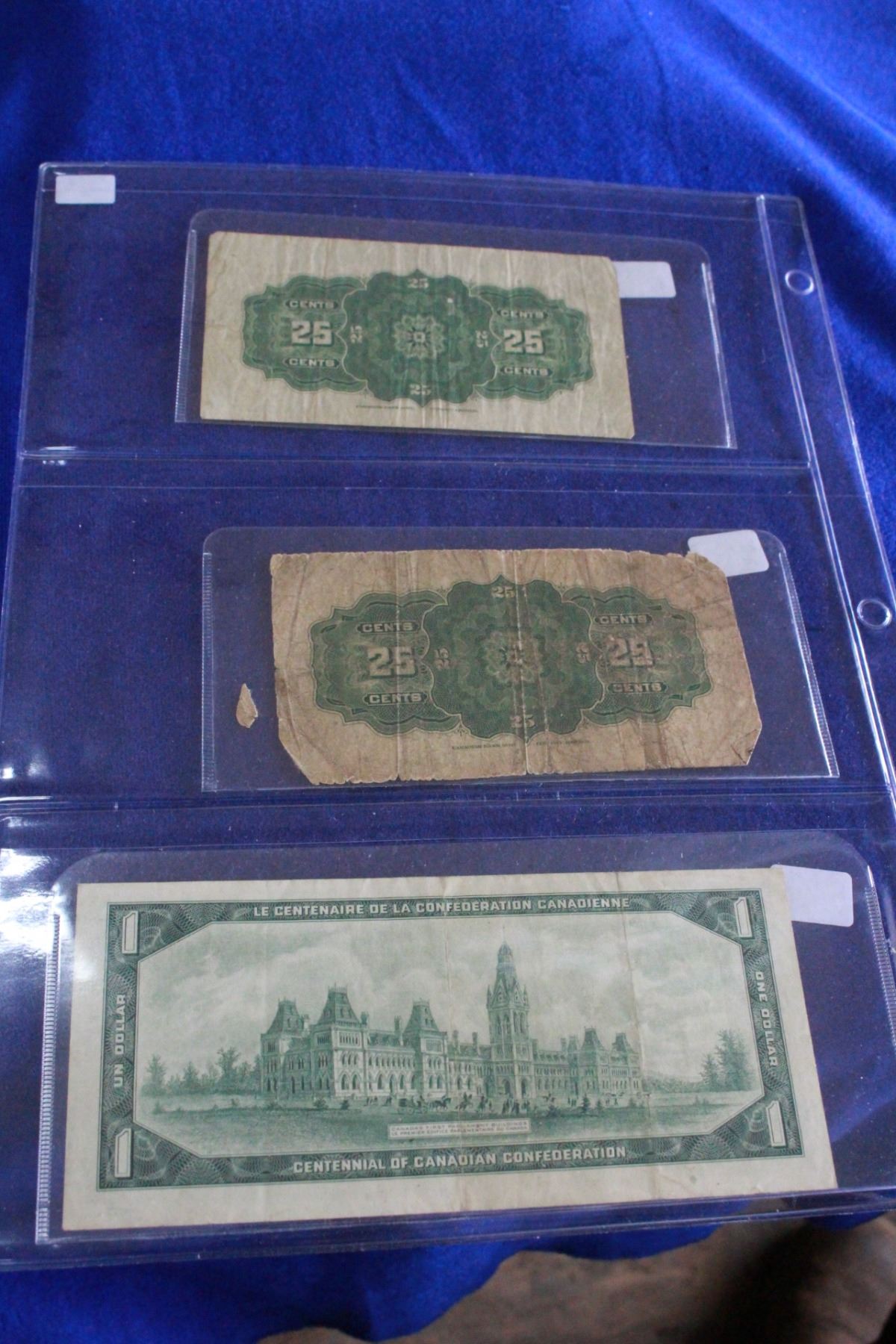 Canada Bills: (2) Twenty-five Cent Bills - #648863, #645447 - both signed Campbell/Black & (1) One Dollar Bill: 1867-1967 Beattie/Rasminsky
