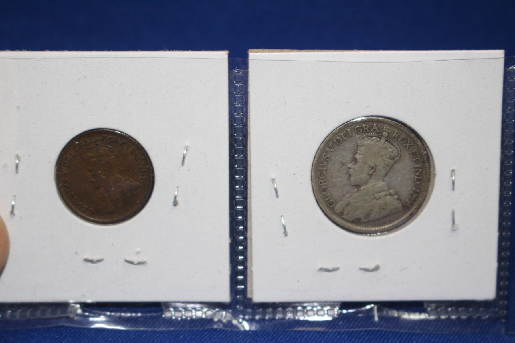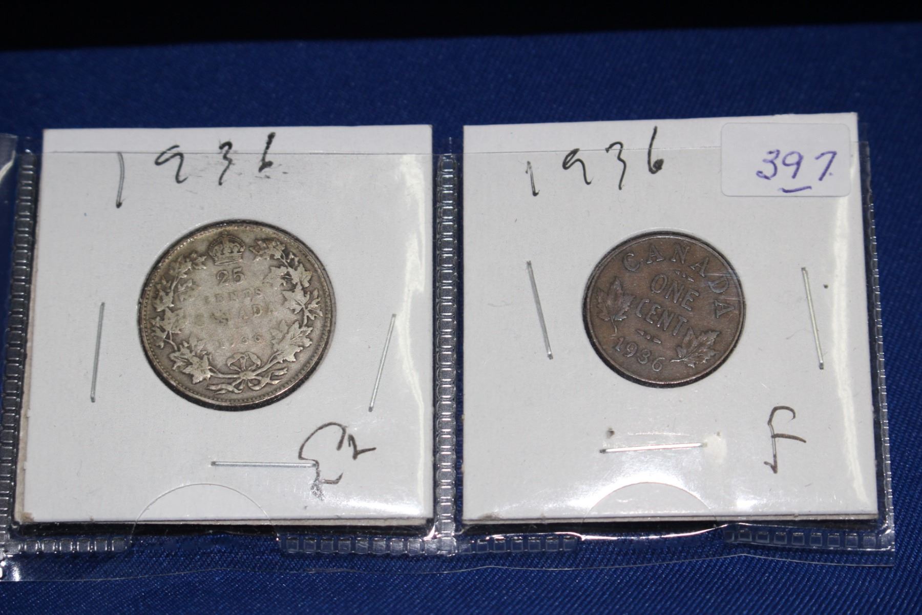 Canada Coins (2): 1936 Twenty-five Cent Coin - Silver - G2 & 1936 One Cent Coin - F