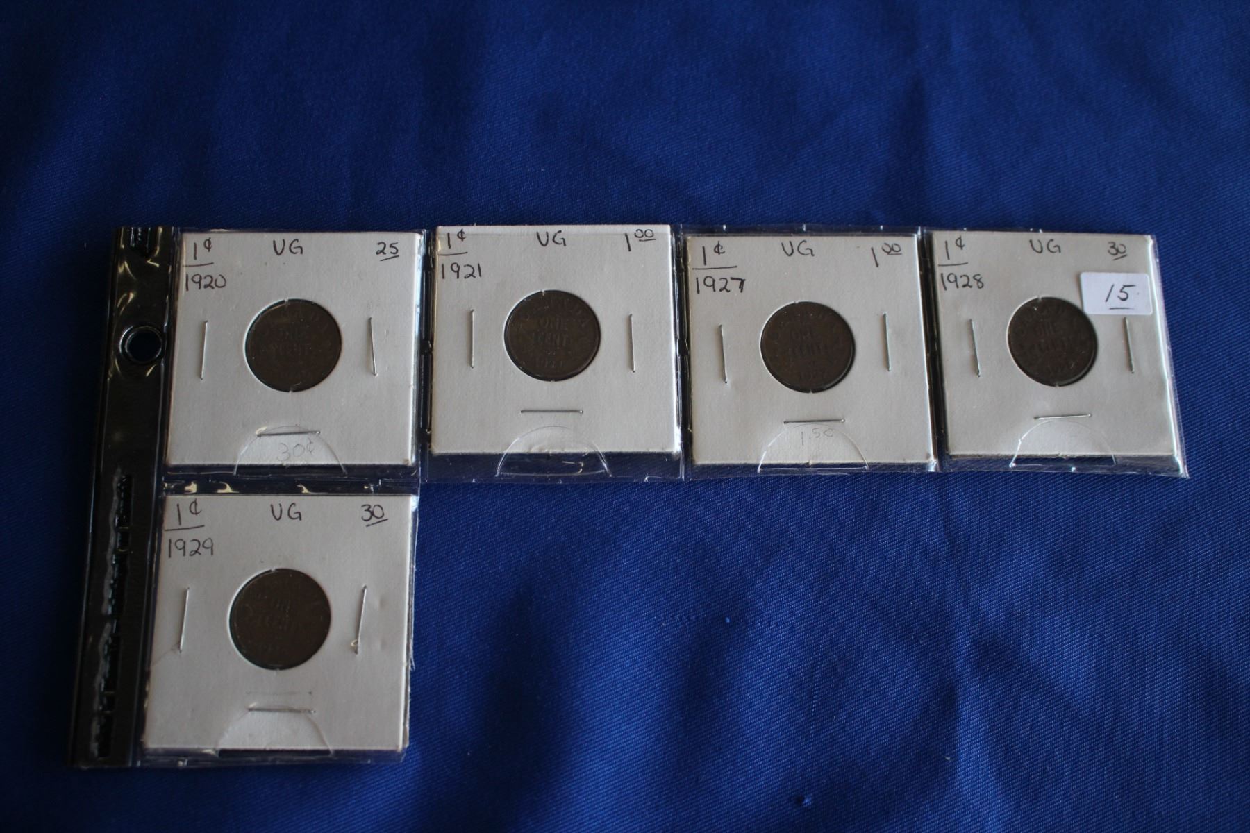 Canada Pennies (5) - 1921, 1921, 1927, 1928, 1929