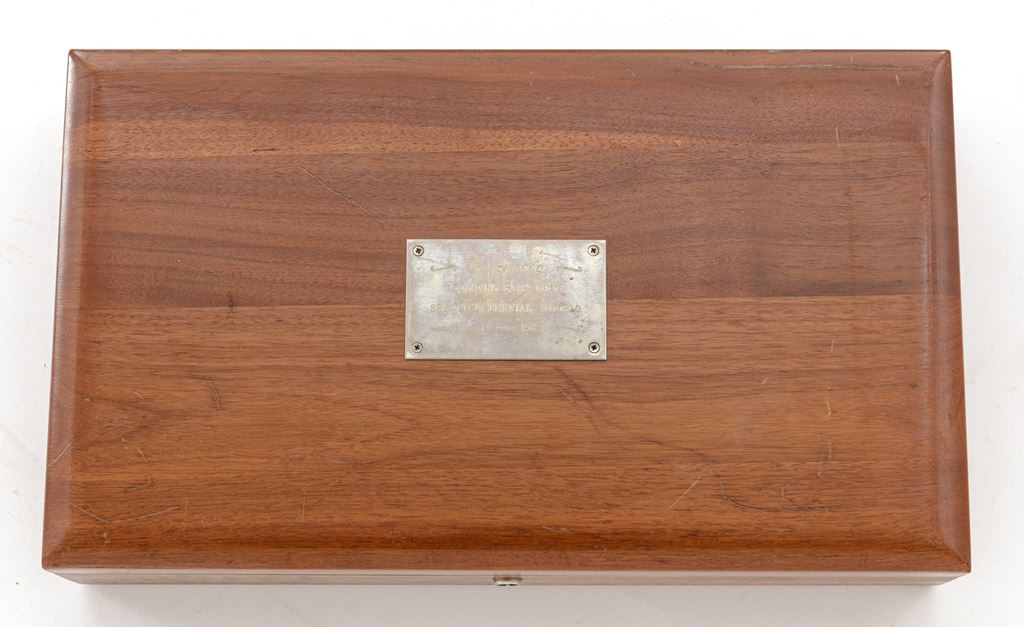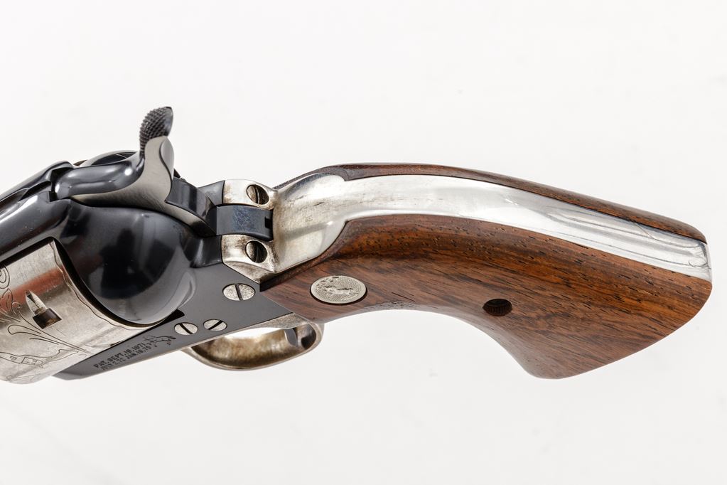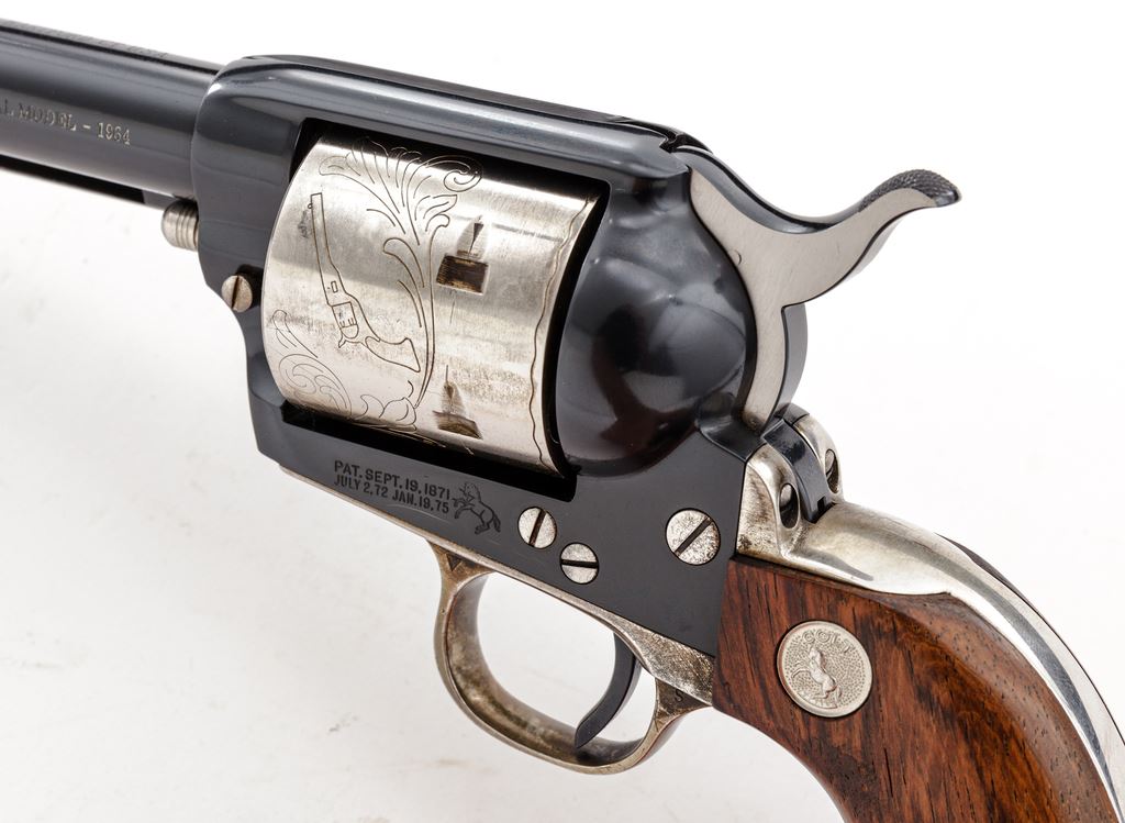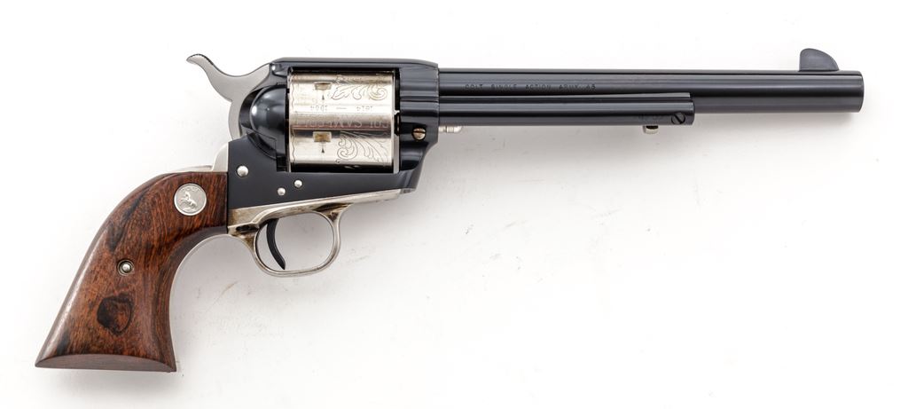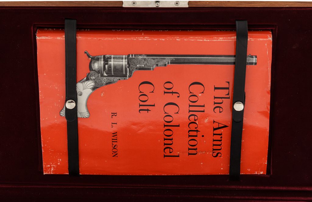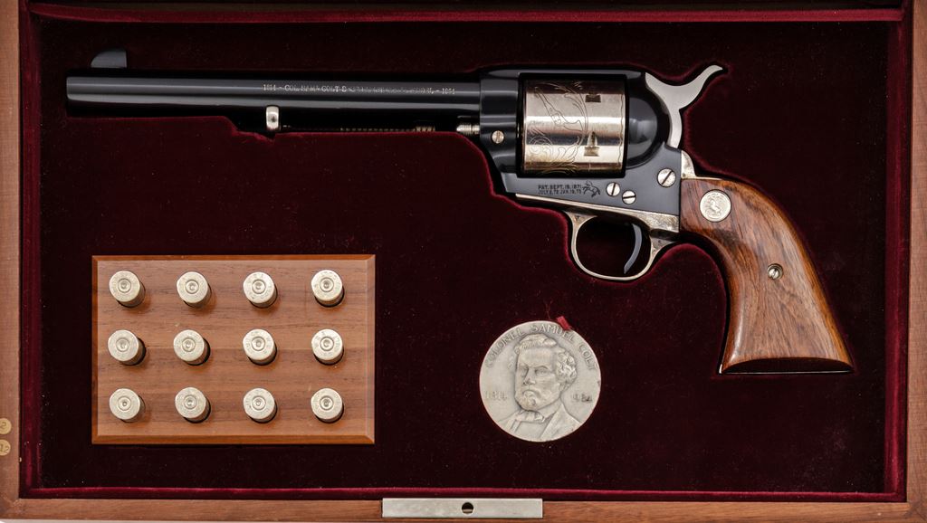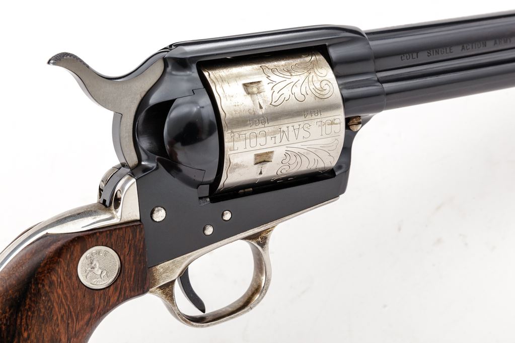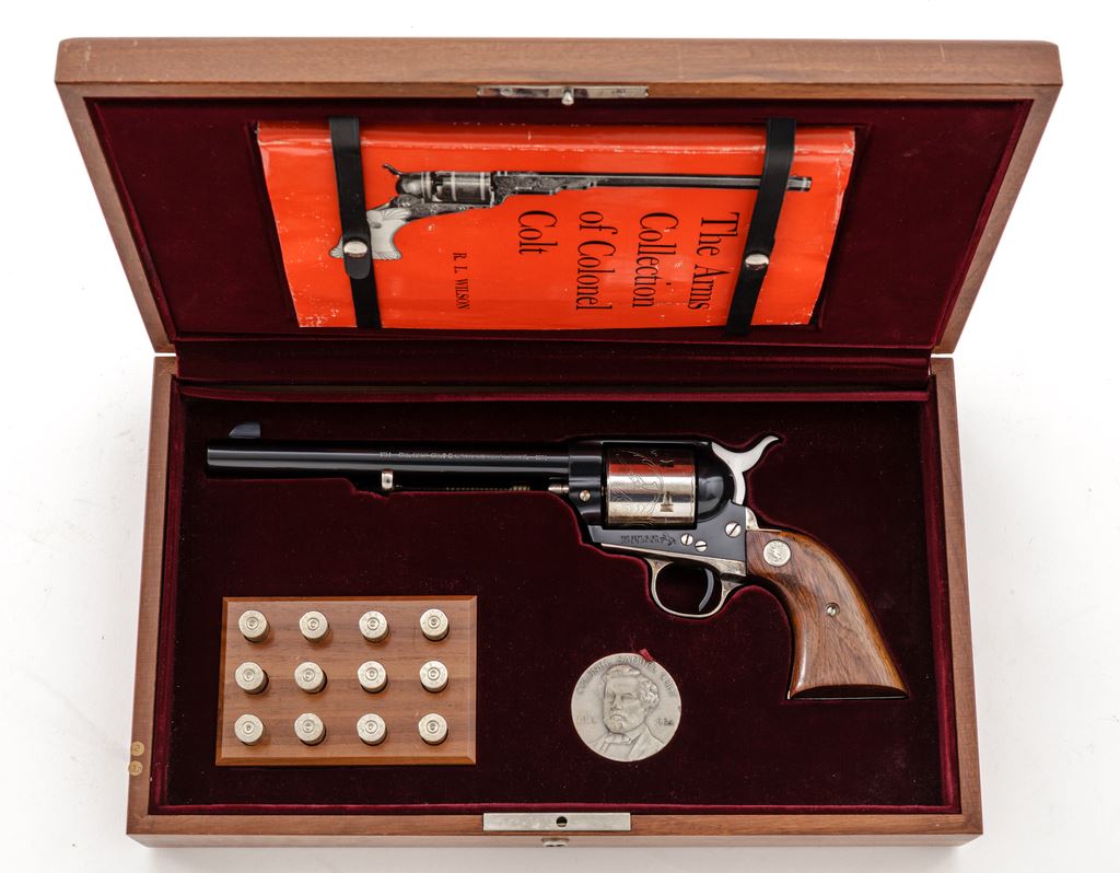 Cased Colt Col. Sam Colt Sesquicentennial Commemorative Single Action Army Revolver, #3813SC, .45 LC cal., 7-1/2'' barrel is marked on the left side ''1814 - Col. Sam Colt Sesquicentennial Model - 1964''; blued/nickel finish; cylinder with engraved Colt Dome and Rampant Colt logo. Smooth walnut grips with silver Colt medallions; standard sights. In wood display case with fitted maroon velvet lining; lid with a small plaque that reads ''One of 5000/Colonel Sam'l Colt/Sesquicentennial Models/1814-1864''. Interior with a wood cartridge holder, 12 nickel cased inert rounds, Sam Colt medallion, and copy of R.L. Wilson's book ''The Arms Collection of Colonel Colt'', commemorative instruction brochure, and other misc. factory paperwork. Condition is fine overall, retaining approx. 99%+ factory blue; cylinder with a moderate index line. The nickel-plated surfaces are tarnished and the overall appearance would improve with a light cleaning. There are intermittent minor handling marks present on the grips; left grip with a round smudge to the finish, below the Colt medallion. Bore is bright and rates in excellent condition; appears unfired. Case interior is excellent; exterior with light scuffs and scratches. The medallion with spots of darkening along the edge; book dustcover shows wear and tattering to the edges, the book itself is excellent. One of only 1,000 produced. Est.: $900-$1,400. (C&R)(Sierra Sid's Casino, Sparks, NV.)