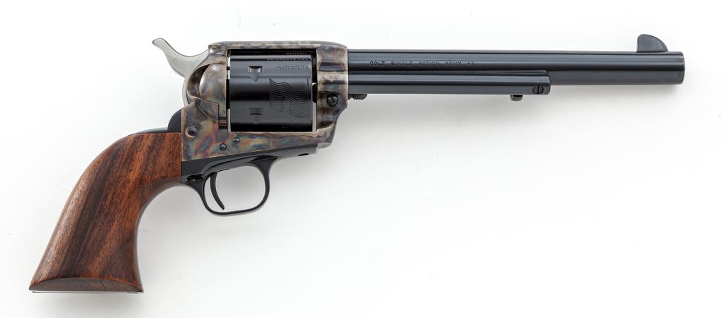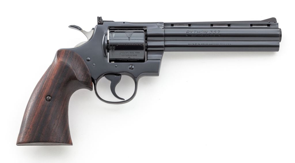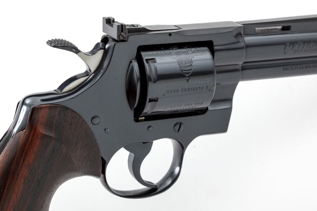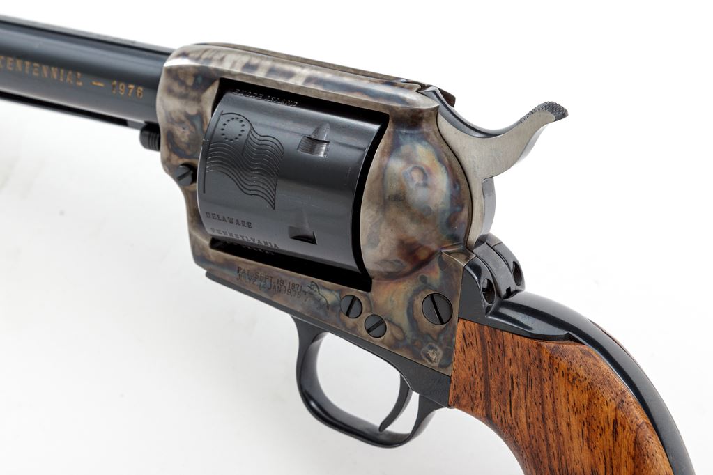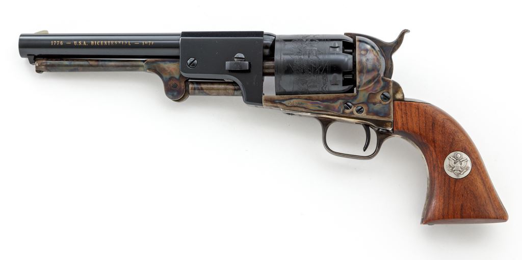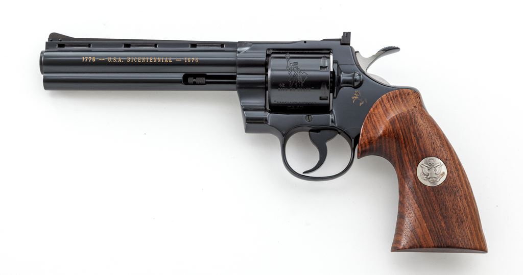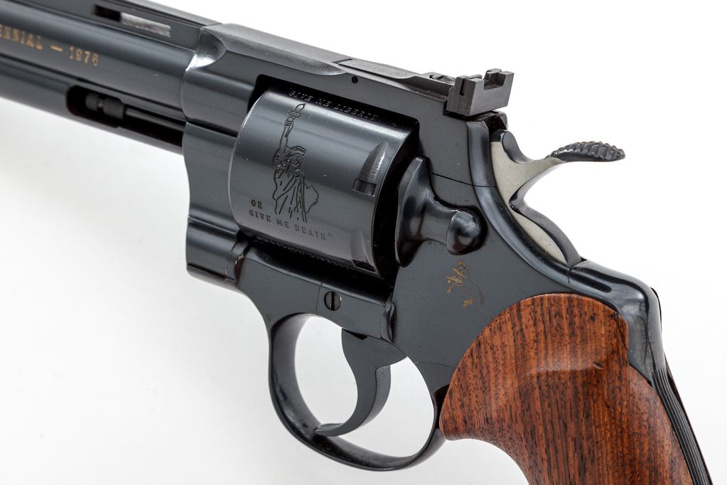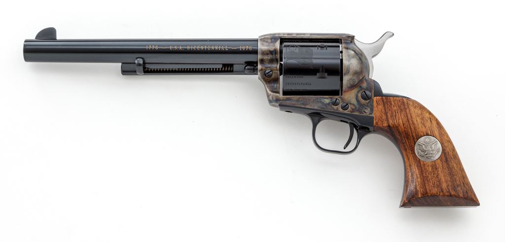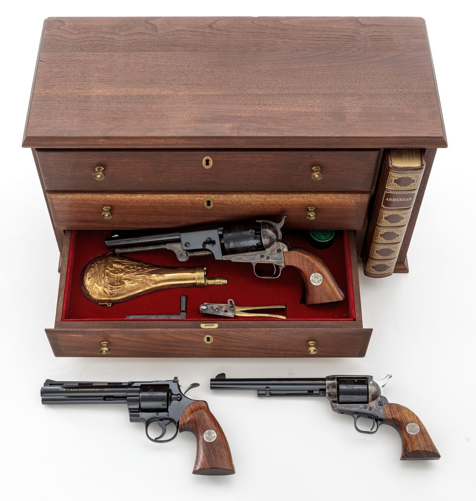 Cased Colt Three-Gun Bicentennial Set, containing three revolvers: Colt 2nd Gen. 3rd Model Dragoon, .44 cal. perc.; Colt Single Action Army Revolver, .45 cal.; and a Colt Python Double Action Revolver, .357 mag. cal., contained in a three-drawer red velvet-lined walnut display case. Each revolver is marked with the ''1776 - Bicentennial - 1976'' logo and features a ''Great Seal of the United States'' medallion inset into right side of each grip, along with patriotic scenes to each cylinder and matching serial numbers. 1) Colt 2nd Gen. 3rd Model Dragoon, #0410DG, .44 perc. cal., 7'' barrel, royal blue and case colored finish, silver-plated backstrap and triggerguard, with smooth rosewood grips, and includes all accessories. Condition is excellent, appearing unfired, with beautiful vivid case colors. Grips with a few small handling marks. Trigger guard and backstrap have tarnished. (Antique) 2) Colt Single Action Army, #0410PM, .45 cal., 7.5'' barrel, royal blue and case colored finish. Condition is excellent, appearing unfired. There is an approx. quarter-inch long scratch to left side of barrel above the Bicentennial marking and bottom of barrel near the ejector rod housing. 3) Colt Python, #0410PY, .357 mag. cal., 6'' barrel, full royal blue finish, special unfluted cylinder, smooth rosewood grips. Condition is excellent, appearing unfired. Right side of frame and left grip with a few small handling marks. Also includes a leather-bound special edition book entitled ''Armsmear''. Case is very good. Top with moderate storage type marks; right side with a few moderate gouges; left side with a hairline fissure that runs the full length. Approx. 1776 produced in 1976 to commemorate the 200th anniversary of the USA. Est.: $4,000-$5,000/set. (C&R)(Sierra Sid's Casino, Sparks, NV)