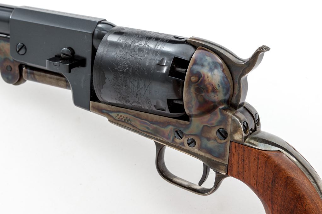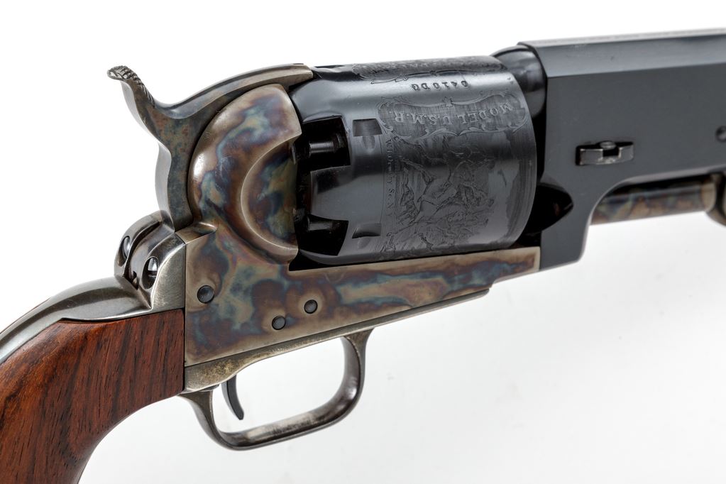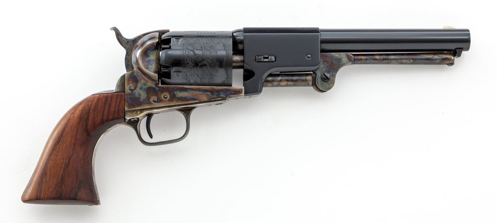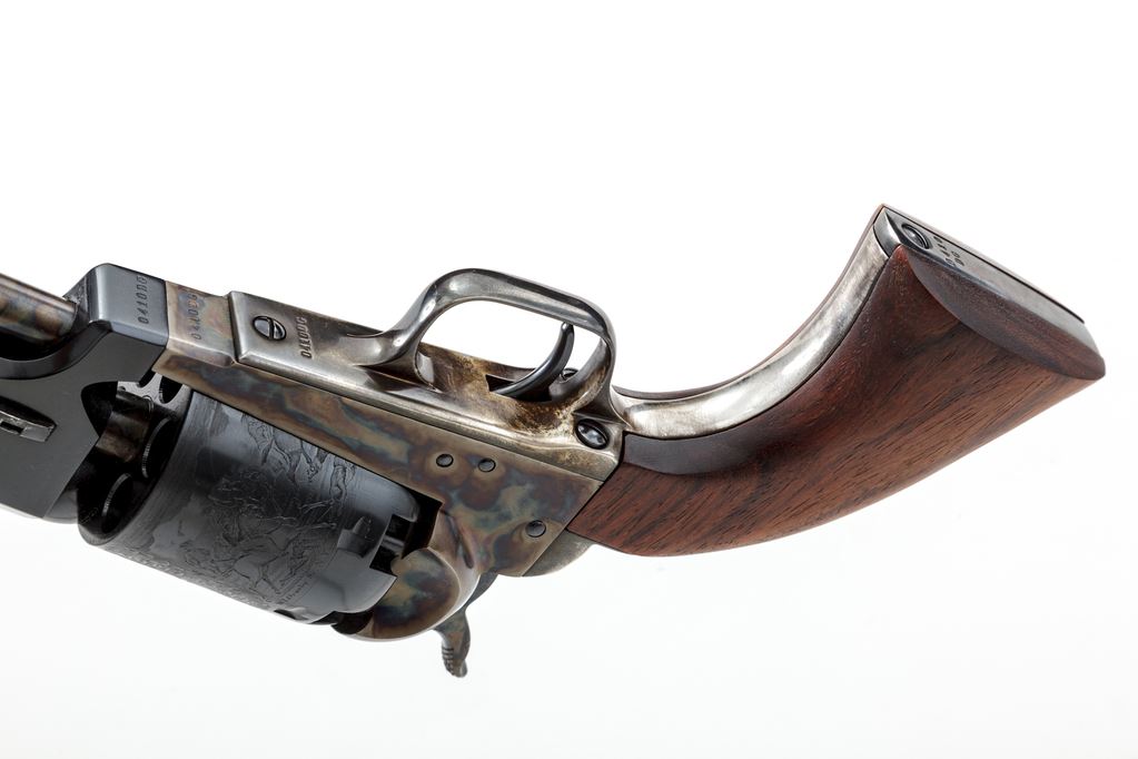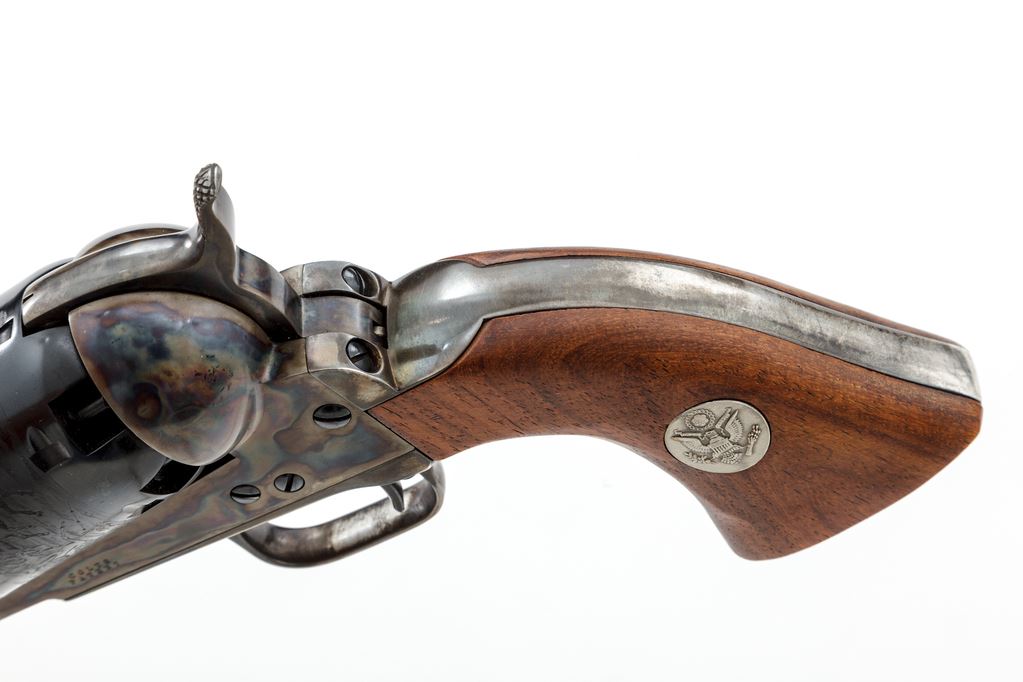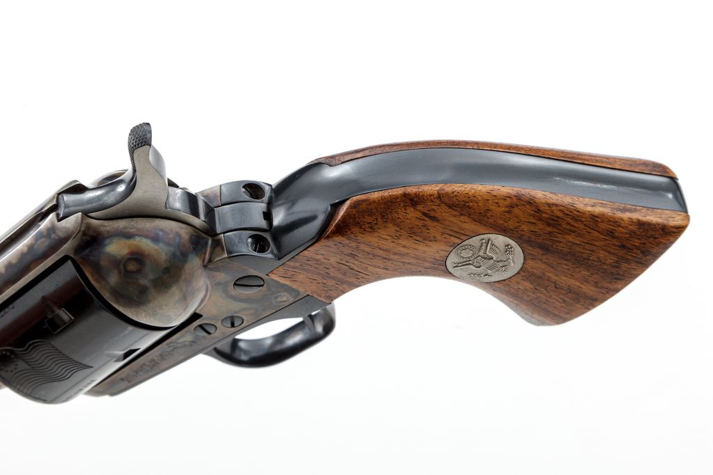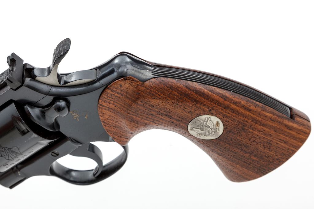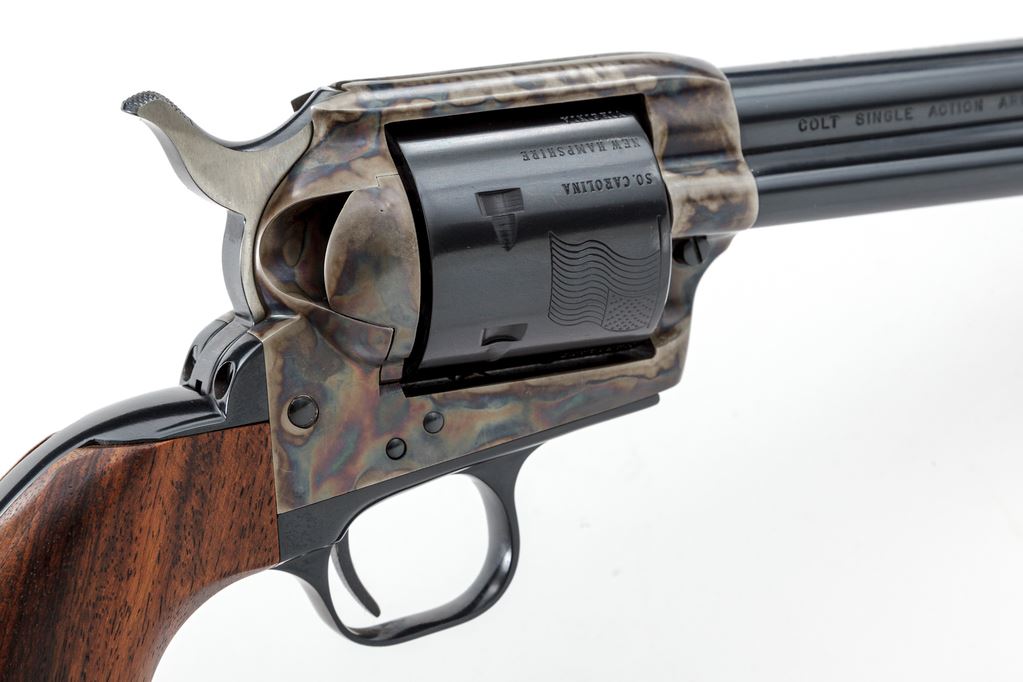 Cased Colt Three-Gun Bicentennial Set, containing three revolvers: Colt 2nd Gen. 3rd Model Dragoon, .44 cal. perc.; Colt Single Action Army Revolver, .45 cal.; and a Colt Python Double Action Revolver, .357 mag. cal., contained in a three-drawer red velvet-lined walnut display case. Each revolver is marked with the ''1776 - Bicentennial - 1976'' logo and features a ''Great Seal of the United States'' medallion inset into right side of each grip, along with patriotic scenes to each cylinder and matching serial numbers. 1) Colt 2nd Gen. 3rd Model Dragoon, #0410DG, .44 perc. cal., 7'' barrel, royal blue and case colored finish, silver-plated backstrap and triggerguard, with smooth rosewood grips, and includes all accessories. Condition is excellent, appearing unfired, with beautiful vivid case colors. Grips with a few small handling marks. Trigger guard and backstrap have tarnished. (Antique) 2) Colt Single Action Army, #0410PM, .45 cal., 7.5'' barrel, royal blue and case colored finish. Condition is excellent, appearing unfired. There is an approx. quarter-inch long scratch to left side of barrel above the Bicentennial marking and bottom of barrel near the ejector rod housing. 3) Colt Python, #0410PY, .357 mag. cal., 6'' barrel, full royal blue finish, special unfluted cylinder, smooth rosewood grips. Condition is excellent, appearing unfired. Right side of frame and left grip with a few small handling marks. Also includes a leather-bound special edition book entitled ''Armsmear''. Case is very good. Top with moderate storage type marks; right side with a few moderate gouges; left side with a hairline fissure that runs the full length. Approx. 1776 produced in 1976 to commemorate the 200th anniversary of the USA. Est.: $4,000-$5,000/set. (C&R)(Sierra Sid's Casino, Sparks, NV)