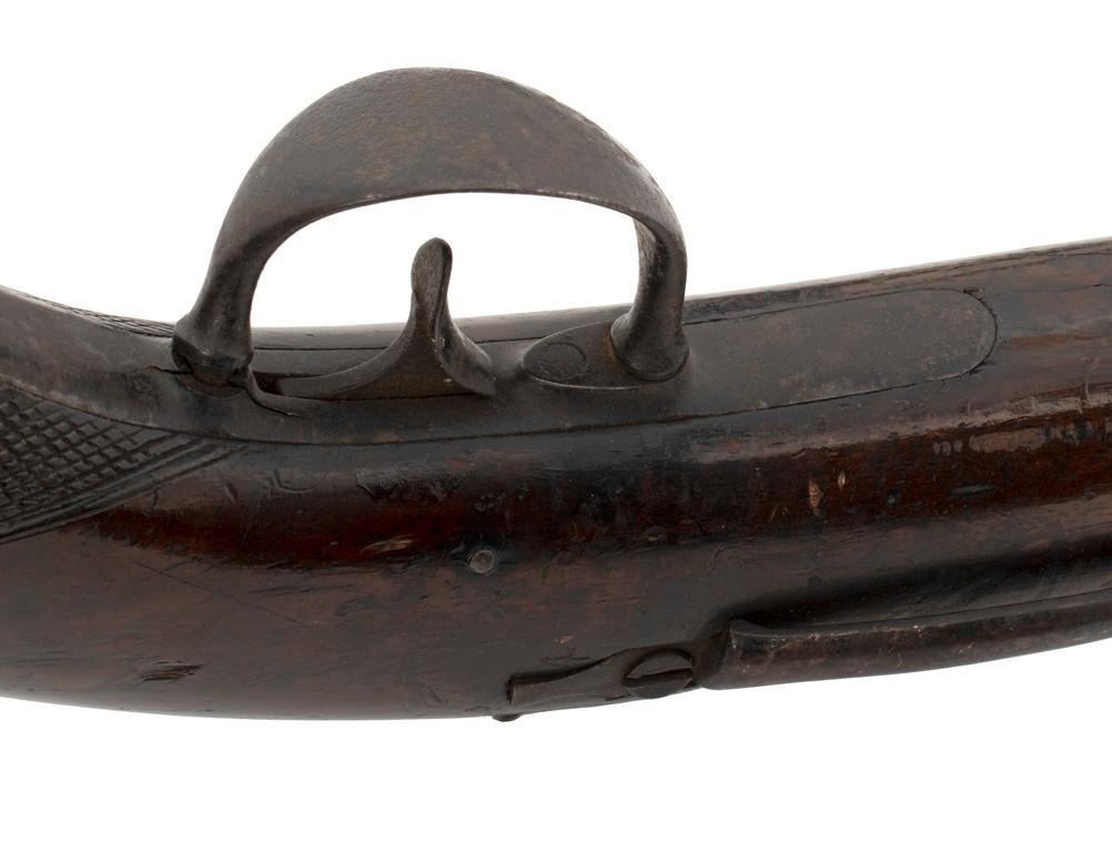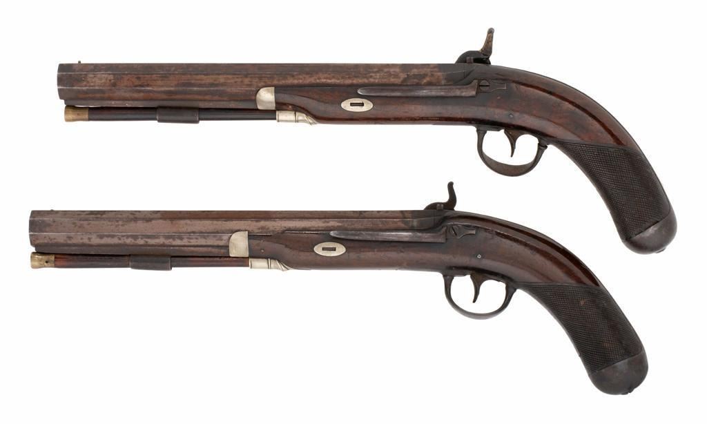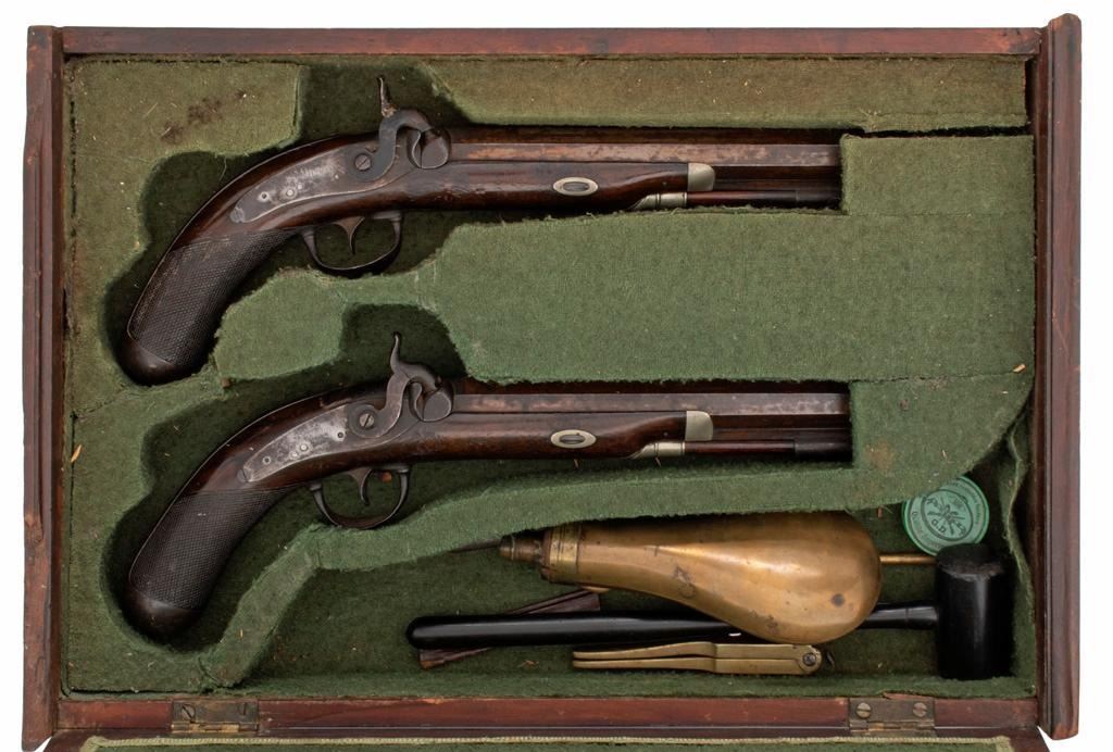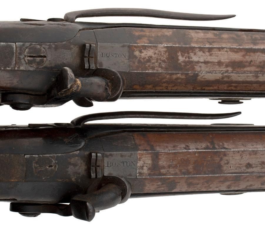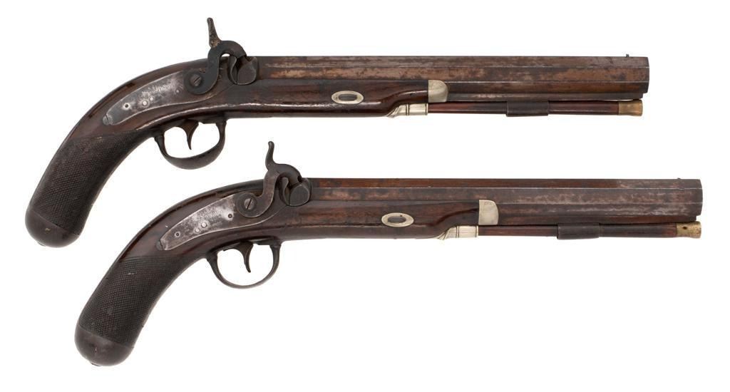.52 bore 11" octagonal barrels, NSN. Browned finish with checkered half stocks. Barrels may have been plated at one time. Bead front sights with rear sight blocks. German silver mounts with brass-tipped wood ramrods. Top of barrels marked "BOSTON". Back-action locks marked "WILMOT".  The pair in a unique felt-lined case with padded lid. Accessories include a receipt from a London port for a Captain C. Lewis of the Belle of the Sea, for 62 bags of linseed to be delivered to the West Indies, and a receipt from Providence for a delivery of 264 cases of shellac. **Very good condition overall. Some moderate wear to original finish with a brown patina in exposed areas. One hammer shows a period repair. Some handling marks and blemishes to stocks which show original varnish. Case shows some wear and a minor piece of broken trim, included in the box.** $5,000-$7,000