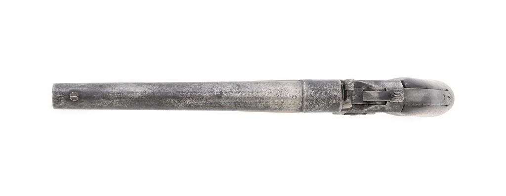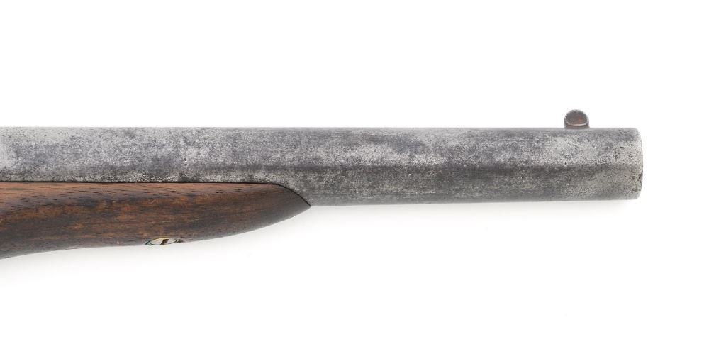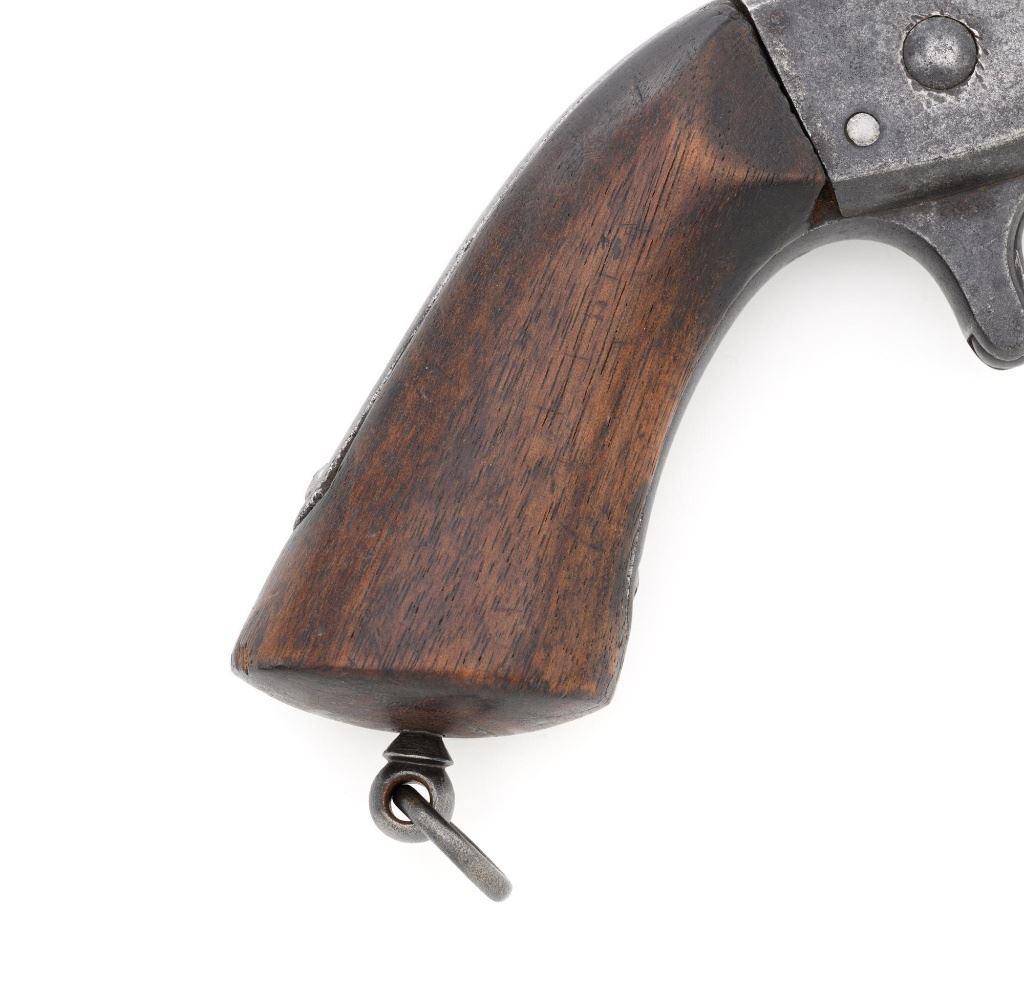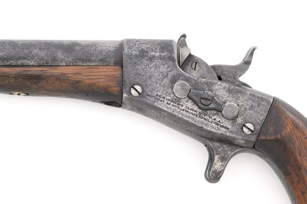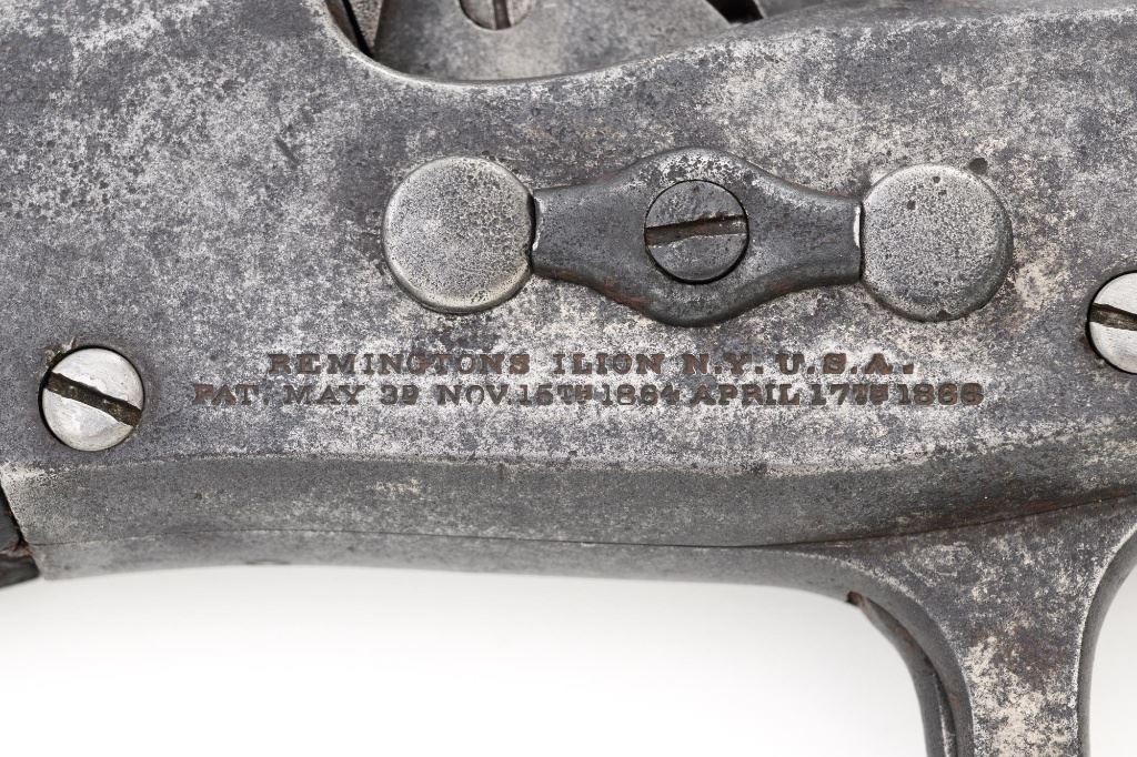 Civilian Remington Model 1865 Navy Rolling Block Pistol, #NVSN, .50 RF cal., 8.5" round barrel, no finish, walnut grip with lanyard ring, walnut forend, fixed blade front sight, and small "U"-notched groove located on the breechblock. Top of barrel is marked with small naval anchor near the breech. No barrel address or serial number on the barrel. Left side of the frame is marked in two-lines with makers information and "April 17th 1866" last patent date. Overall condition is good, with light pitting and dark patina scattered throughout. Wood with intermittent moderate dents and scratches, with an old chip missing from bottom rear of the forend. Factory markings are clear. Action functions well. Rifling is good but there is moderate+ erosion scattered throughout the bore. Est.: $1,000-$1,500. (Antique) (Michael Strietbeck Collection)
