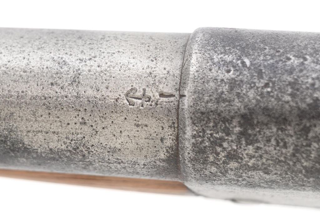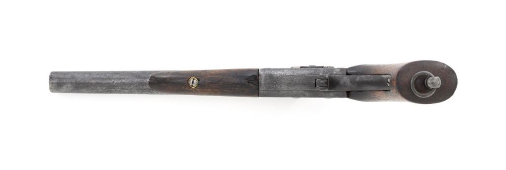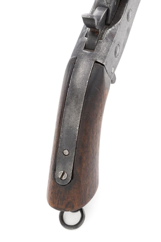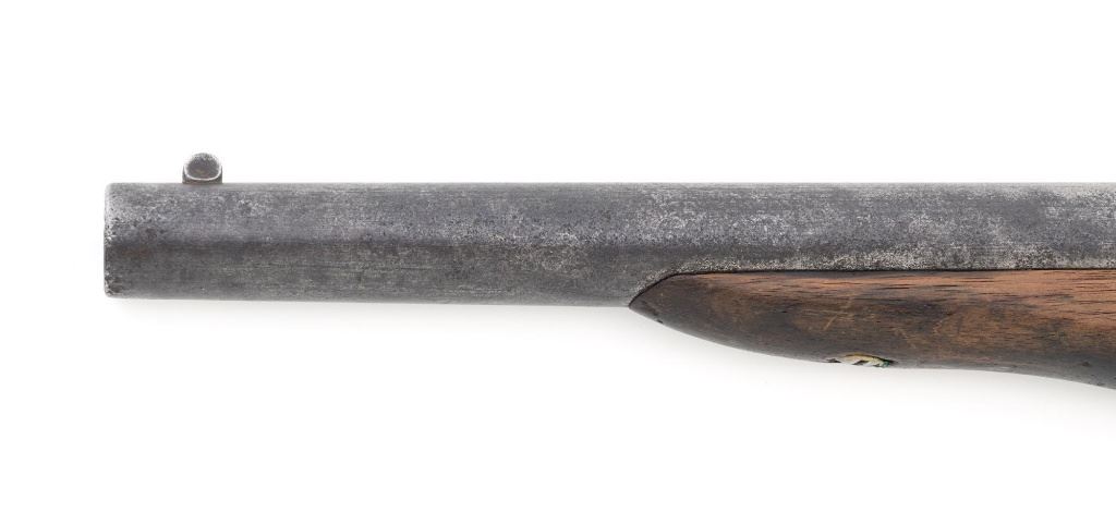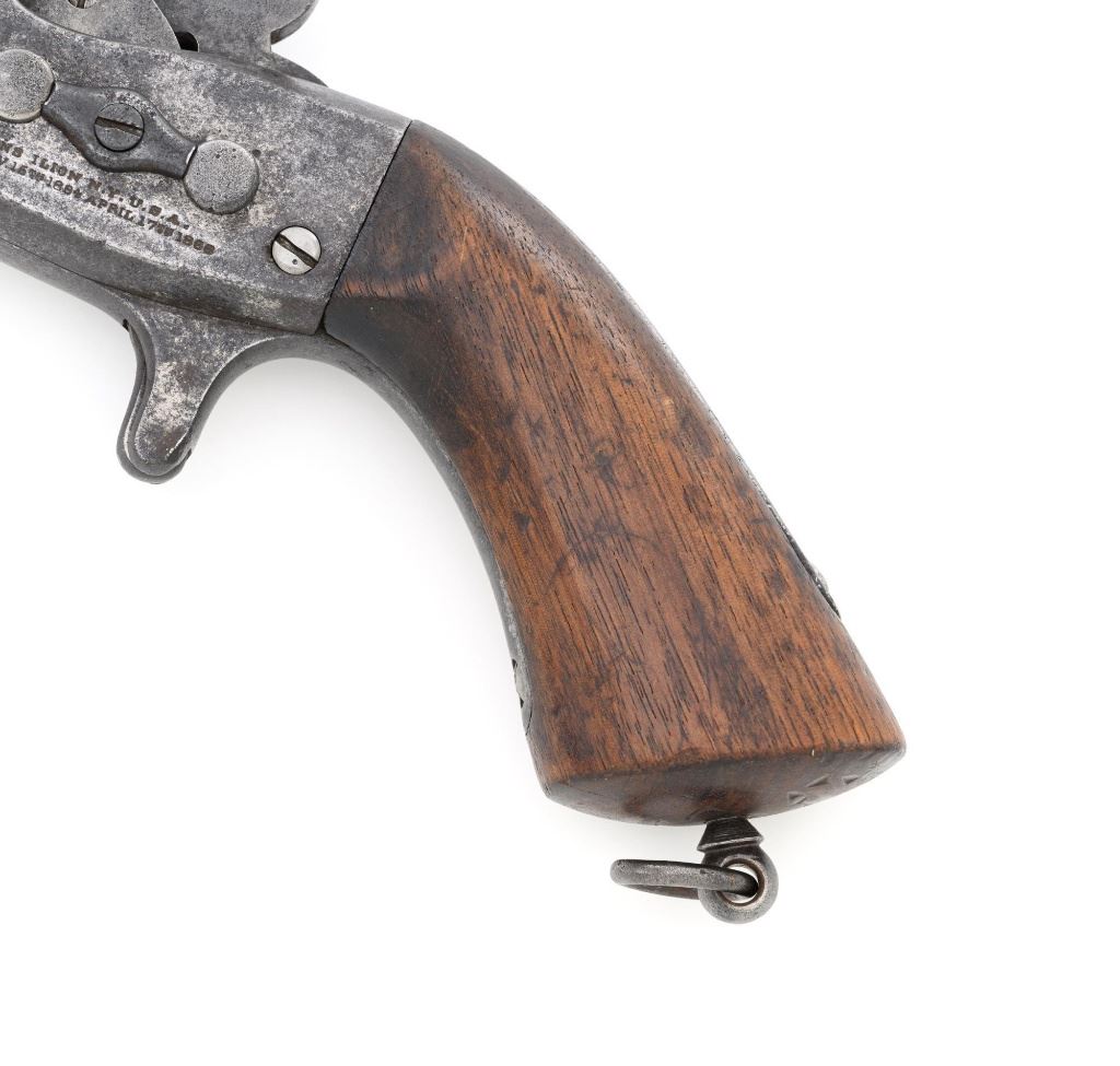 Civilian Remington Model 1865 Navy Rolling Block Pistol, #NVSN, .50 RF cal., 8.5" round barrel, no finish, walnut grip with lanyard ring, walnut forend, fixed blade front sight, and small "U"-notched groove located on the breechblock. Top of barrel is marked with small naval anchor near the breech. No barrel address or serial number on the barrel. Left side of the frame is marked in two-lines with makers information and "April 17th 1866" last patent date. Overall condition is good, with light pitting and dark patina scattered throughout. Wood with intermittent moderate dents and scratches, with an old chip missing from bottom rear of the forend. Factory markings are clear. Action functions well. Rifling is good but there is moderate+ erosion scattered throughout the bore. Est.: $1,000-$1,500. (Antique) (Michael Strietbeck Collection)