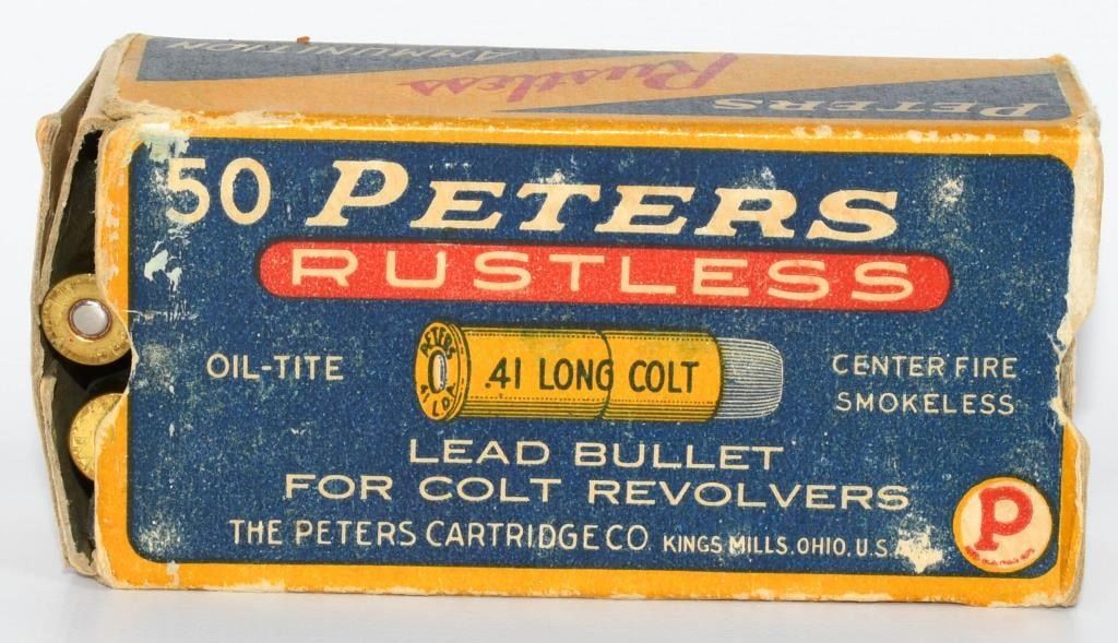 Salutations, esteemed collectors and aficionados of munitions elegance! Immerse yourself in the allure of history with a Collector Box of Peter's .41 Long Colt Ammunition. Inside this treasure trove, discover 37 rounds that appear to be meticulously preserved in their original form. Crafted by the renowned Peter's Cartridge Company, this ensemble speaks to an era of precision and craftsmanship. Before you dive into the spirited bidding, familiarize yourself with the legal intricacies surrounding these distinguished specimens. Now, let the auction unfold with exuberance, where every click holds the promise of securing this rare and pristine collection for your esteemed arsenal. Happy bidding, and may your collection resonate with the enduring allure of Peter's precision!