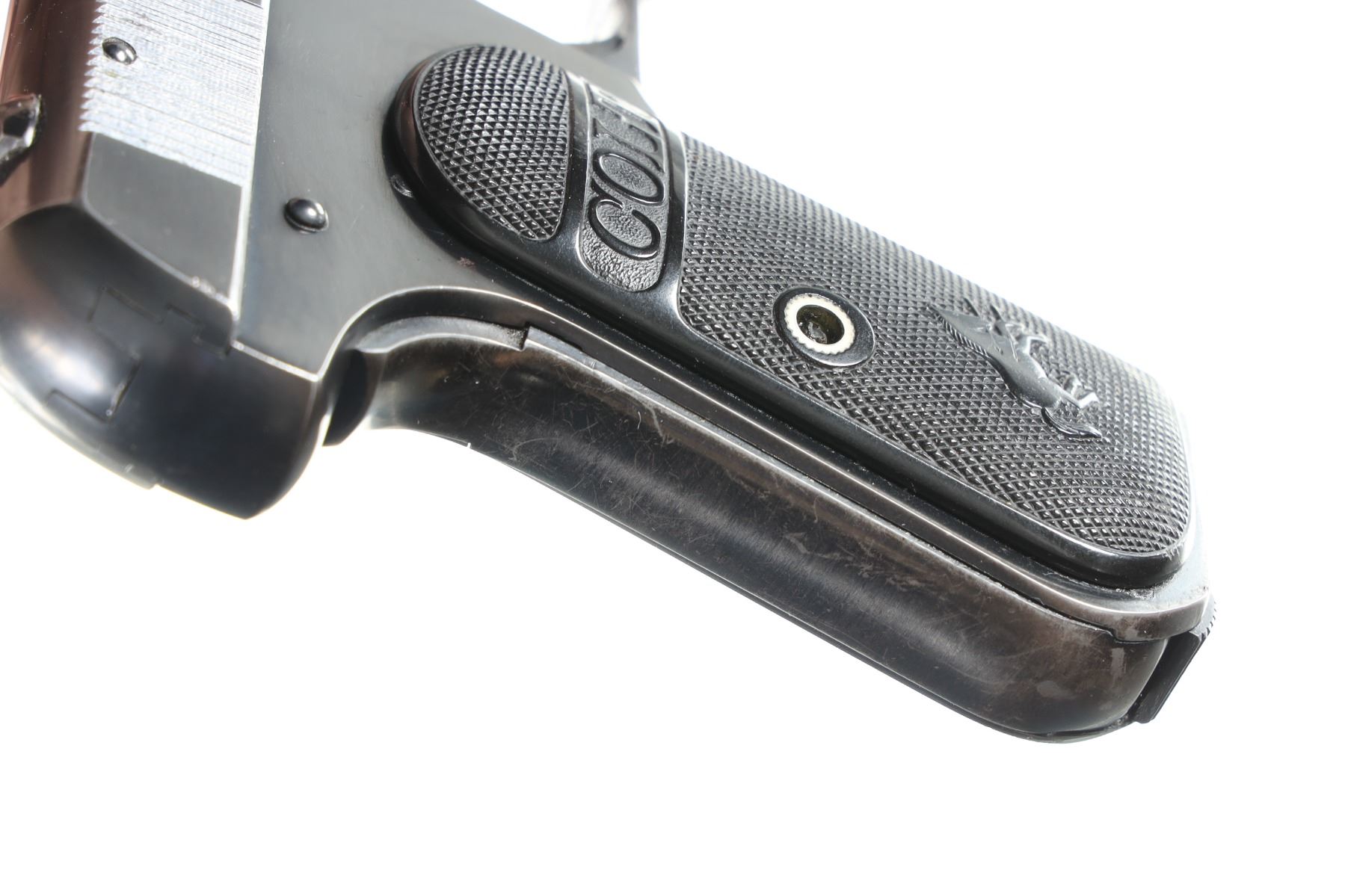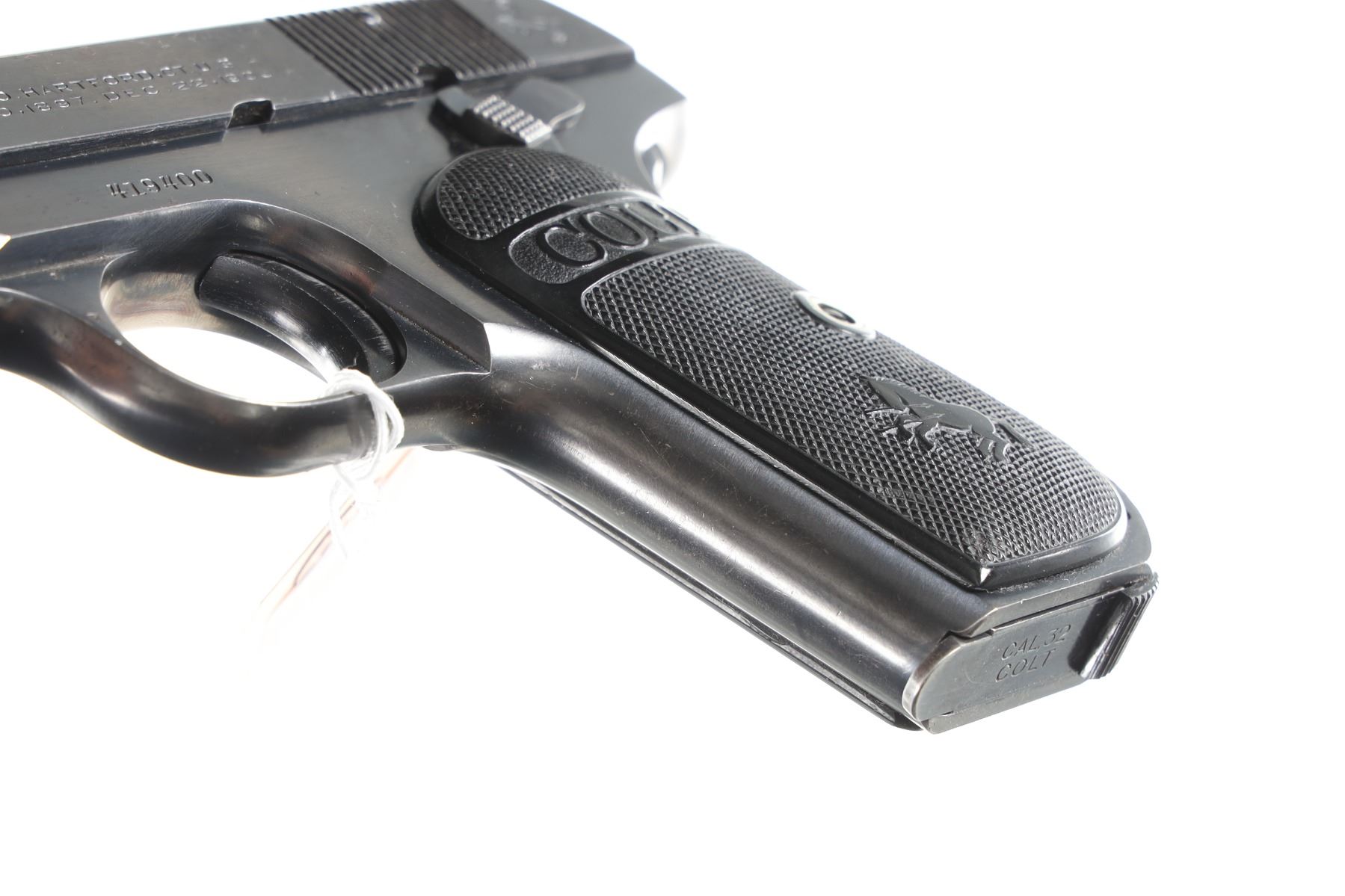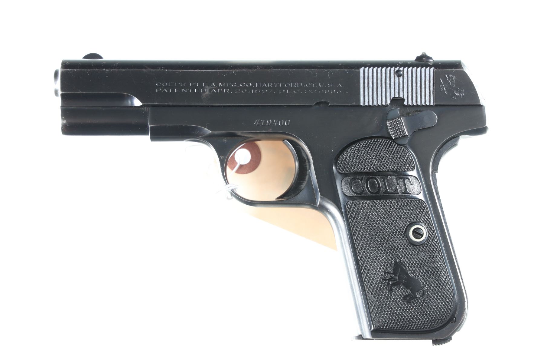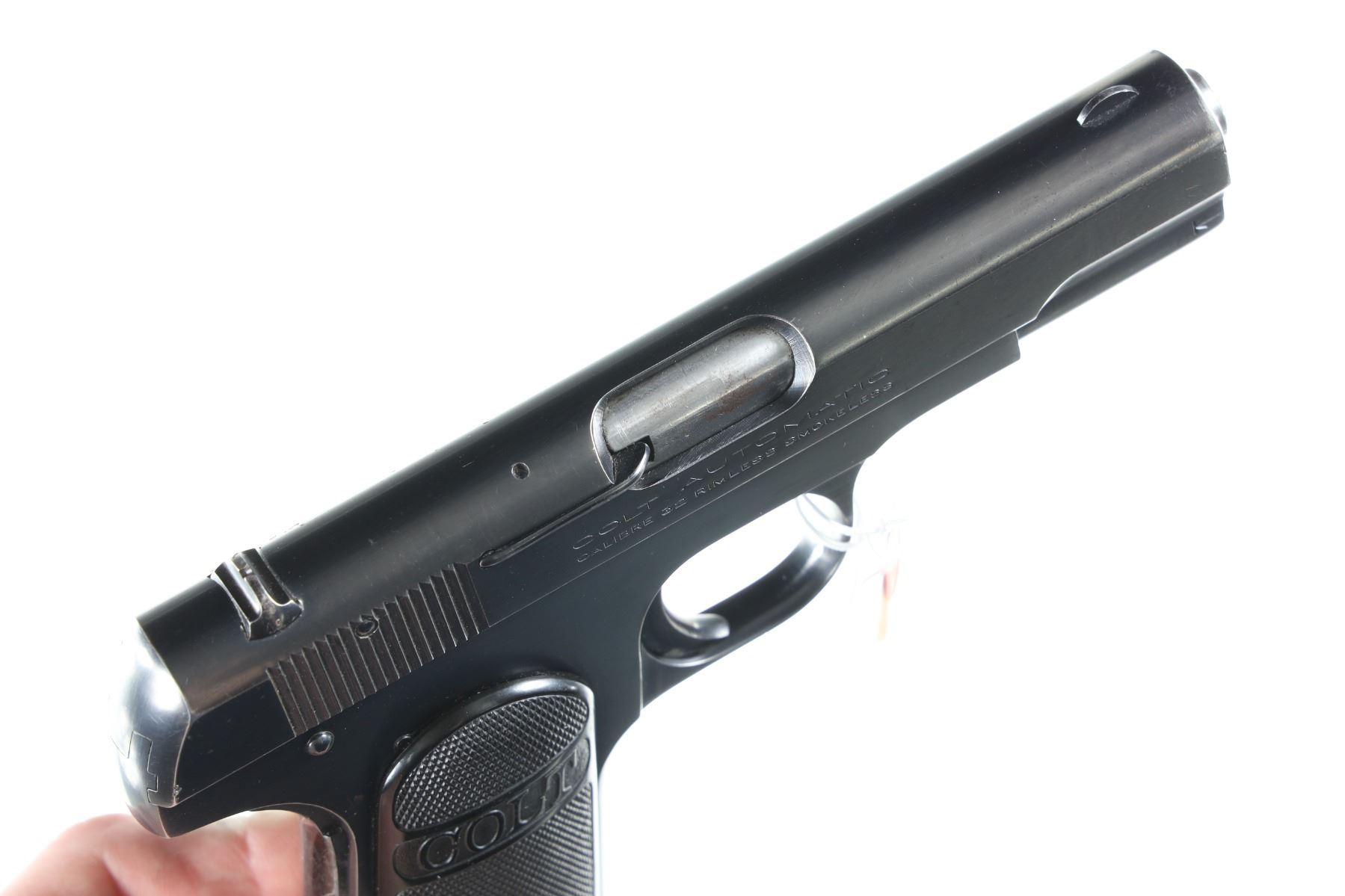 .32 ACP Serial # 419400 Blue finish with factory checkered hard rubber grips, matching slide number, factory 2 tone magazine. Fine overall condition with light holster wear and small storage dings. Barrel 3 3/4" C&R