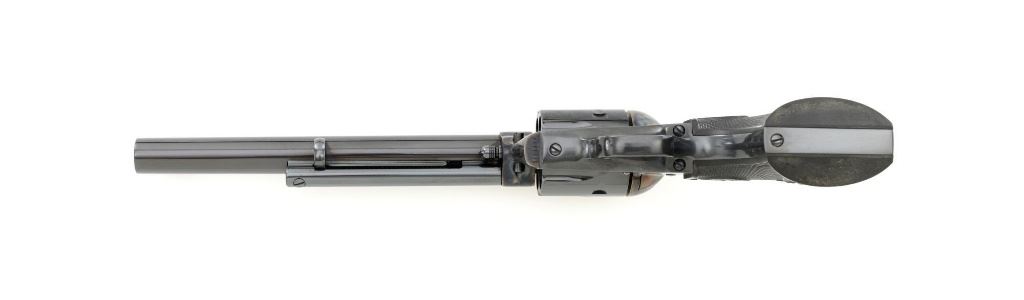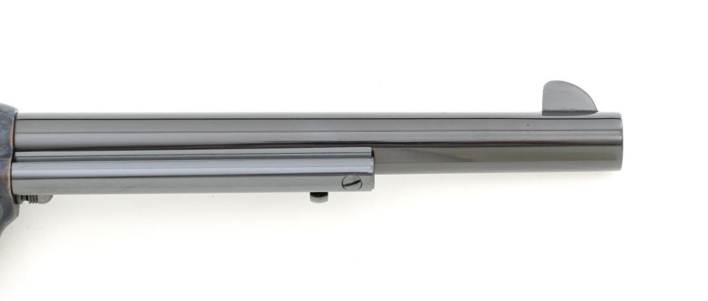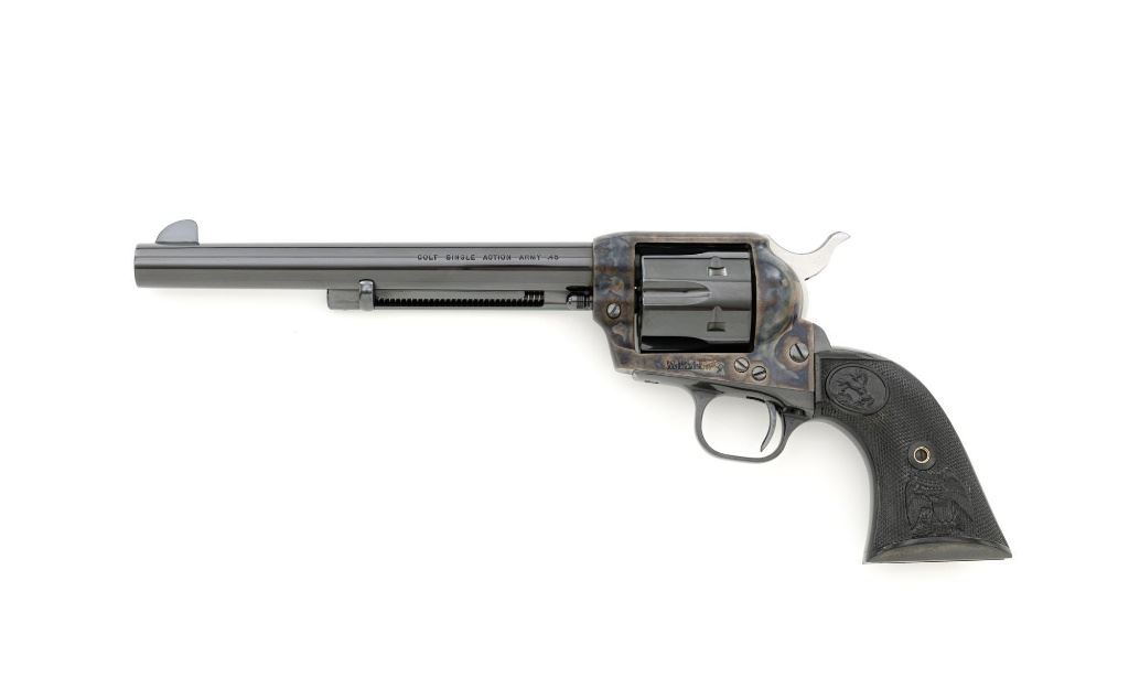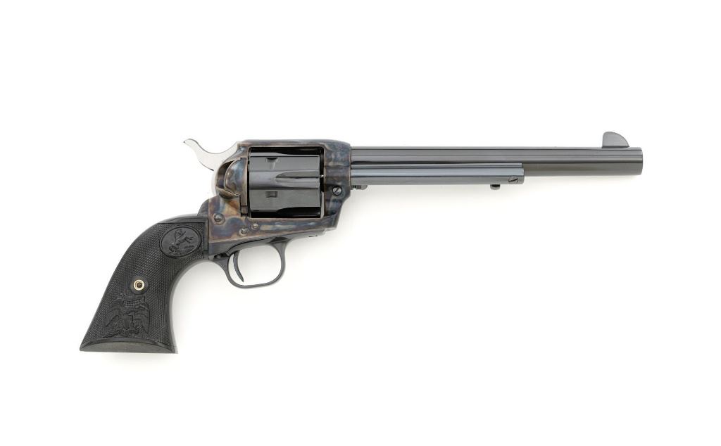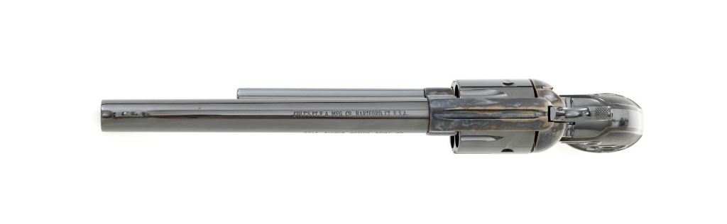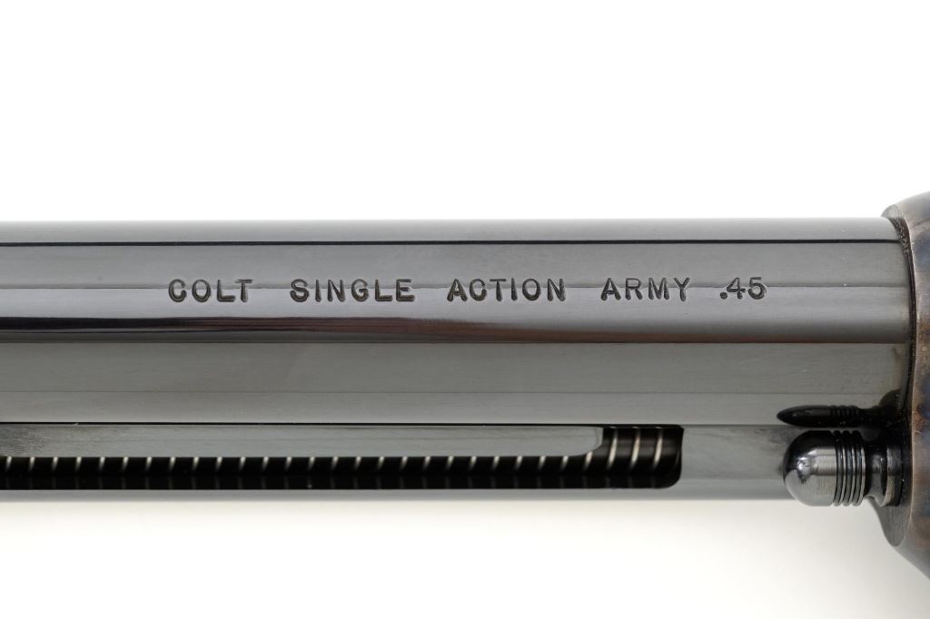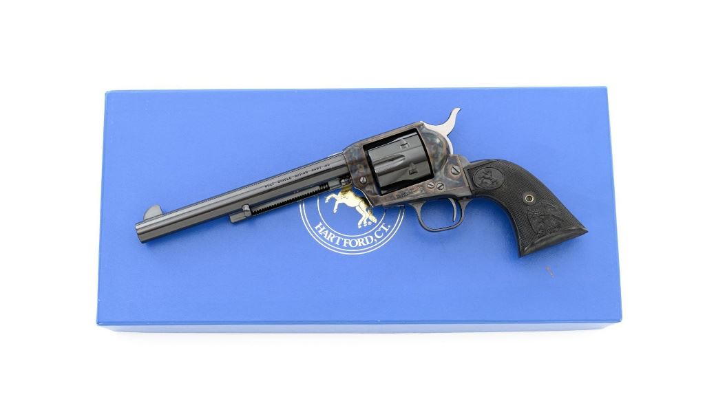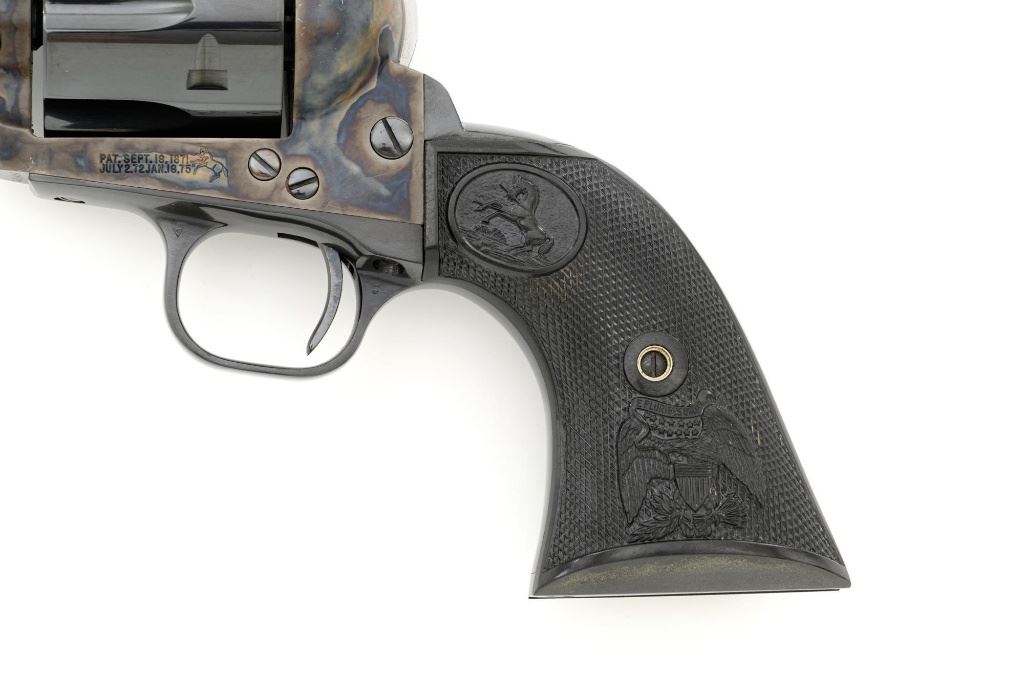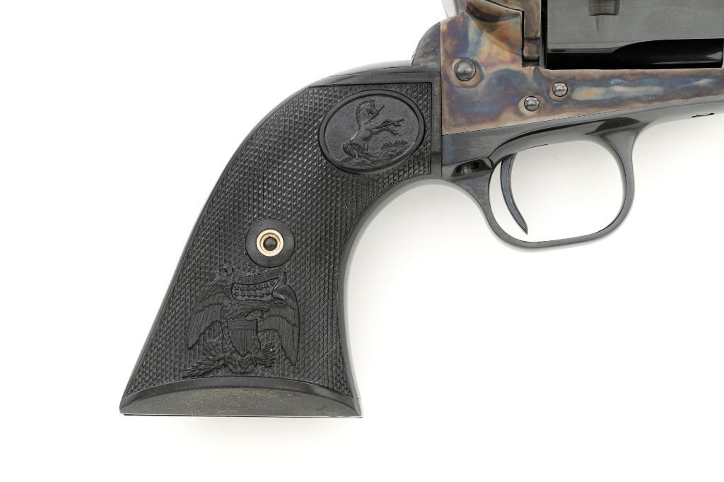 Colt 3rd Generation Single Action Army Revolver, #S40145A, .45 Colt cal., 7.5" barrel, blue and color case hardened finish, checkered hard rubber two-piece eagle grips, blade front sight and fixed square-notch rear sight. Includes Colt factory two-piece blue cardboard box with instruction manual, product registration card, NRA literature, red hang tag, and associated packaging materials. Mfgd 2005. Revolver is in excellent overall condition, retaining approx. 99%+ factory blue, with only a few minor marks, and appears unfired. Frame displays vivid color case hardened finish. Sides of the hammer are polished bright. Factory markings are clear. Grips are in excellent condition with fine checkering detail. Action is crisp. Bore is mirror bright with excellent rifling. Est.: $1,600-$2,200. (Modern/PPT)