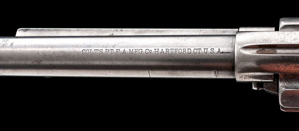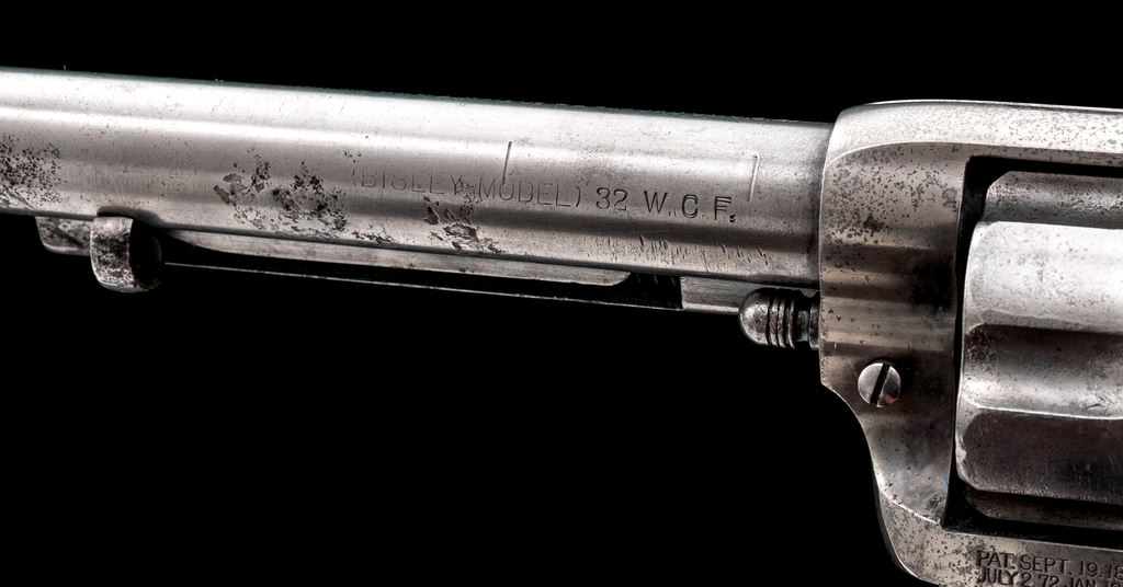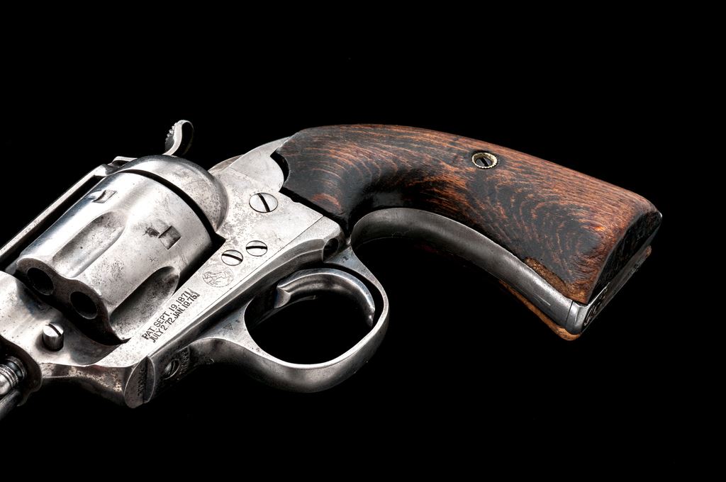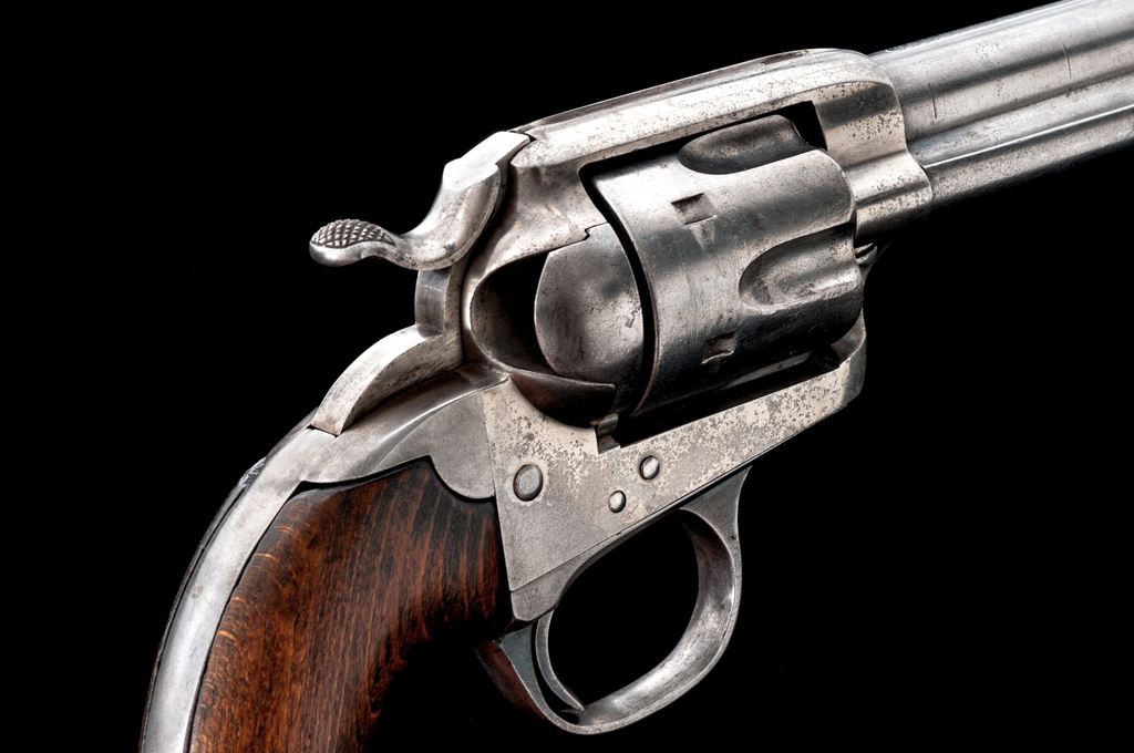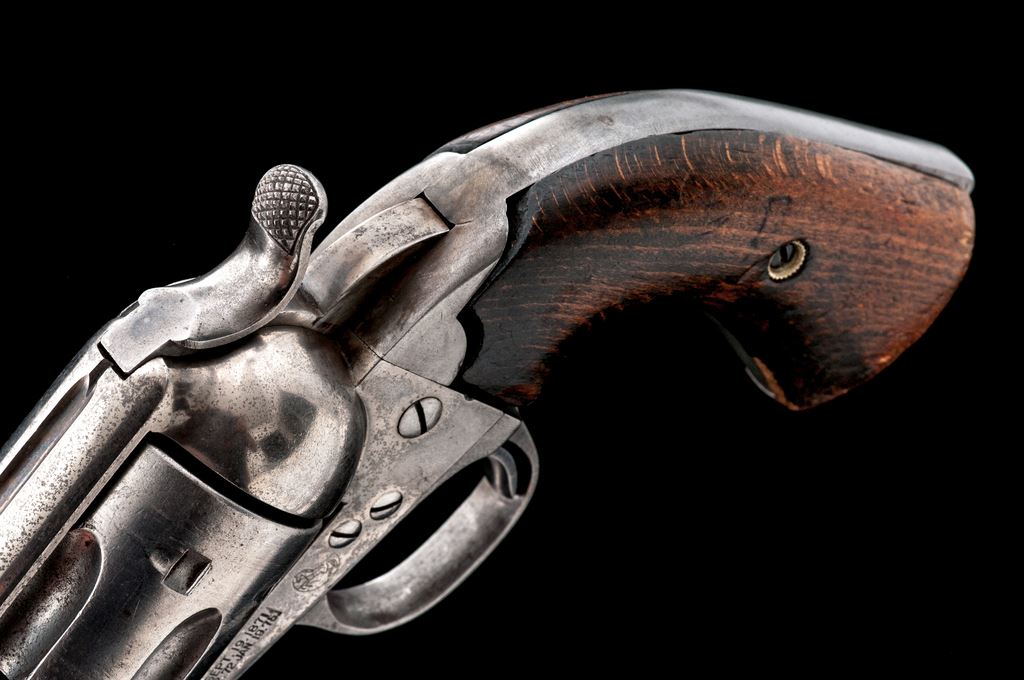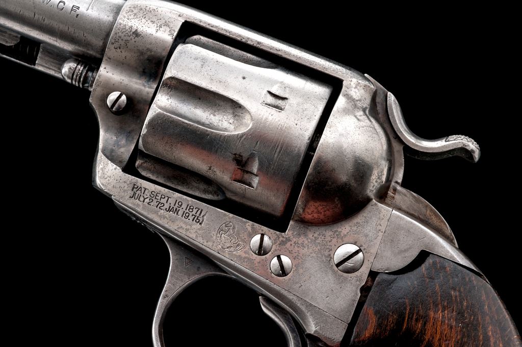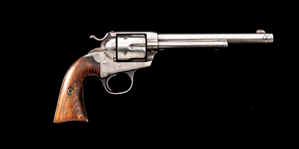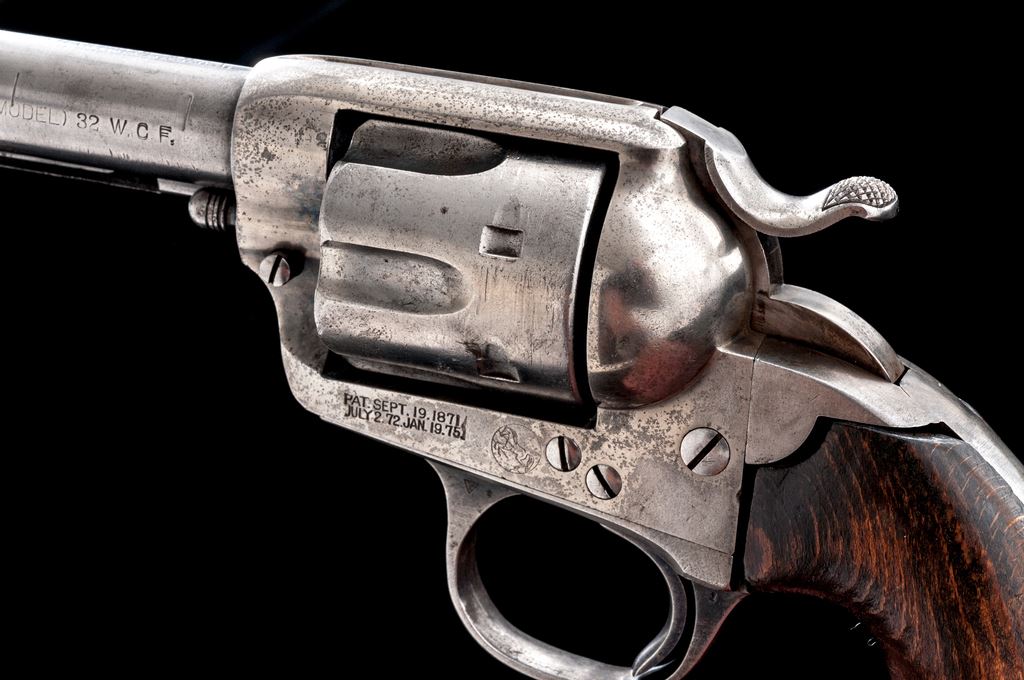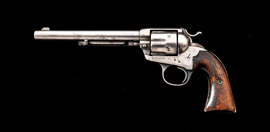 Colt Bisley Model Single Action Revolver, #272392, .32 WCF (.32-20) cal., 7.5'' barrel with standard sights, marked with maker's name and Hartford address on top, and ''(Bisley Model) 32 W.C.F.'' on left side; fluted round 6-shot cylinder is marked ''208'' at rear; solid frame has right-side loading gate (batch numbered ''2052''), characteristic low hammer spur, two-line 1871-72-75 patent dates and an encircled Rampant Colt logo on left side; ''humped'' steel gripstraps have two-piece plain wood grips. Mfg'd ca. 1905. Condition is about very good. Trigger guard retains approx. 25% original blue, trigger sides show bright fire blue, the balance of the metal is bright with cleaned areas of pitting to left side of barrel and ejector housing. Grips are plain wood replacements. Edges and markings are good; action is smooth; bore is bright with light frosting and sharp rifling. Est.: $750-$1,000. (C&R/PPT)