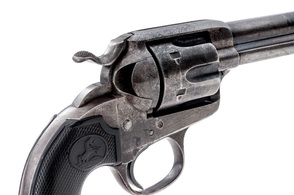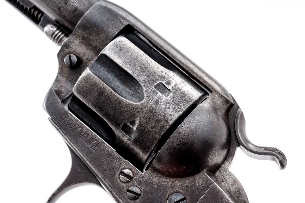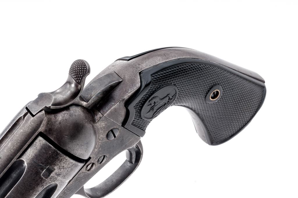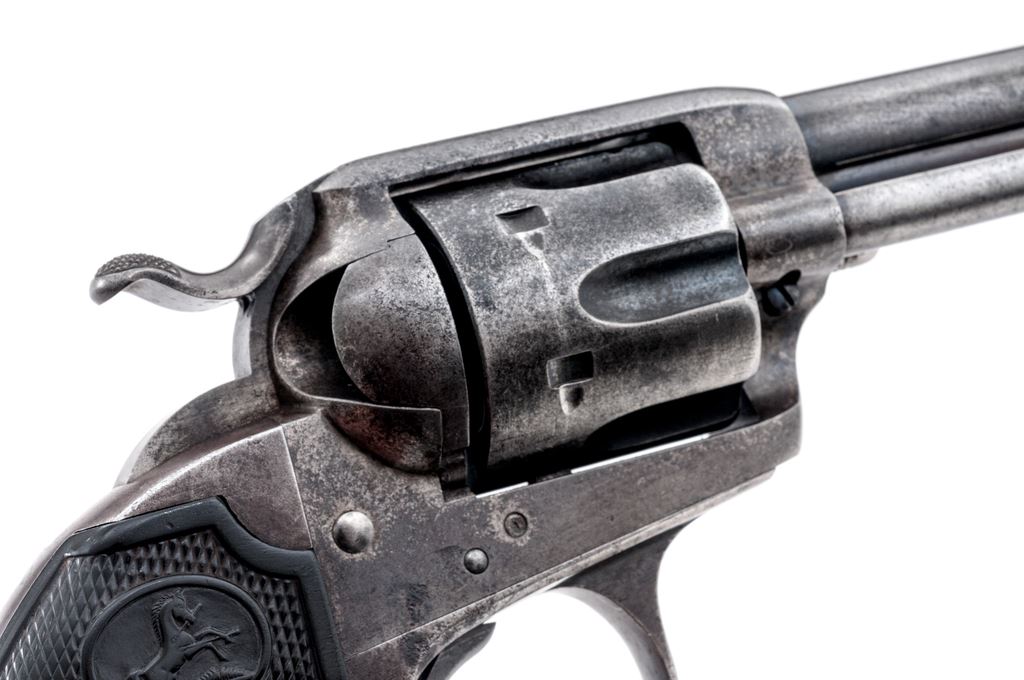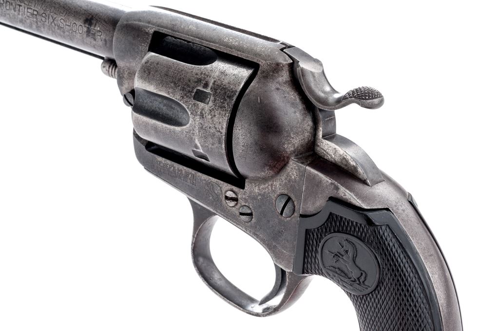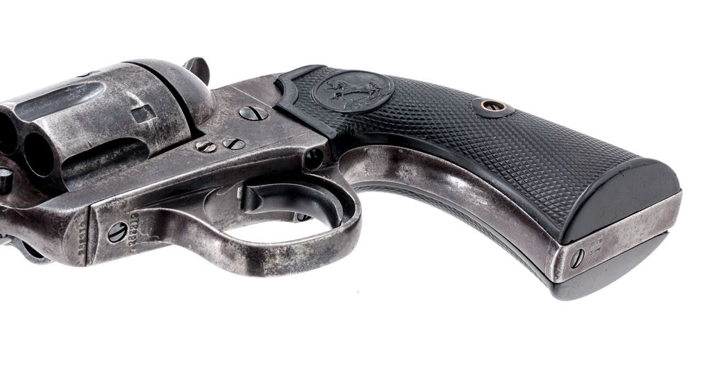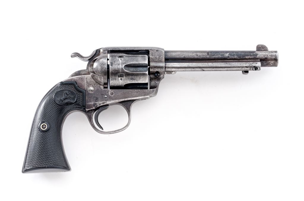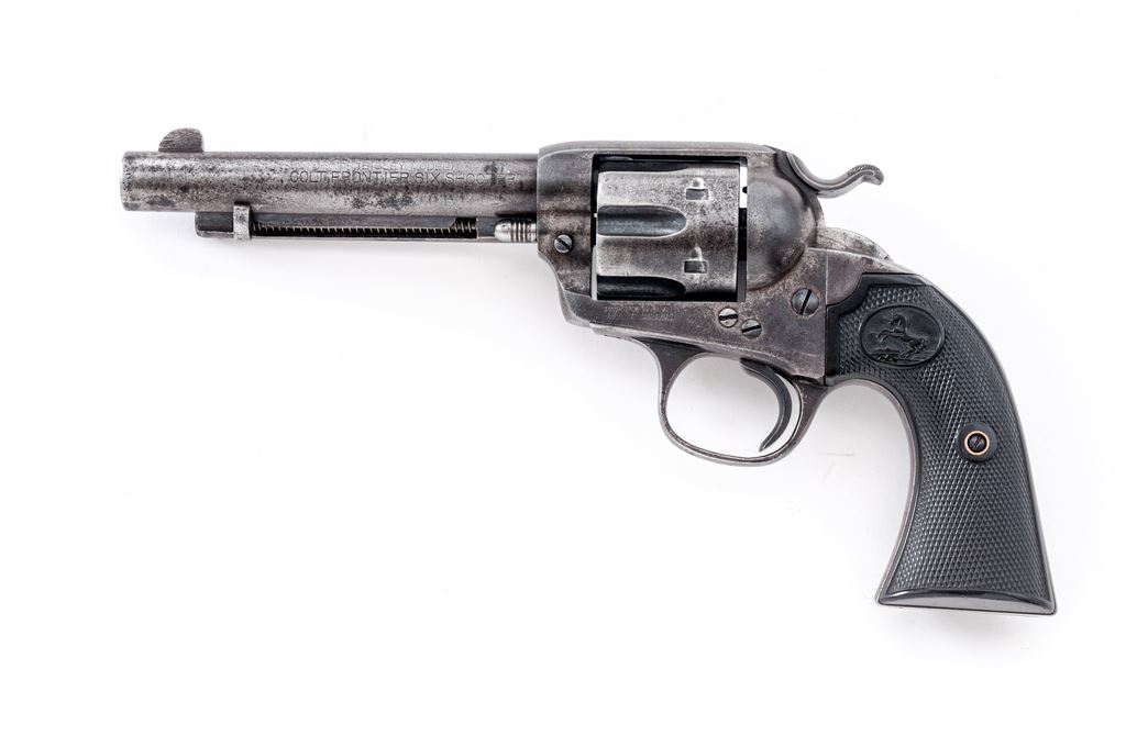 Colt Bisley Model Single Action Revolver, #288319, .44-40 CF cal., 5.5'' round barrel with ejector and standard sights, marked with maker's name and Hartford address on top, and ''Colt Frontier Six Shooter'' on left side; fluted round 6-shot cylinder; solid frame has right-side loading gate (batch numbered ''44''), characteristic low hammer spur, two-line 1871-72-75 patent dates and an encircled Rampant Colt logo on left side; ''humped'' steel gripstraps have two-piece checkered hard rubber grips with Rampant Colt in an oval panel at top. Mfg'd ca. 1907. Condition is very good. Barrel, ejector rod and trigger guard loop retain good traces of original blue, cylinder flutes approx. 90% blue, frame shows case colors at front but is otherwise silvered out, the balance of the metal is smooth gunmetal gray with scattered roughness. Grips show only light wear, no losses and fit well. Edges and markings are sharp; action is strong and smooth; bore shines with scattered etching and sharp rifling. Only 6,803 Bisleys were mfg'd in this caliber. Est.: $750-$1,000. (C&R/PPT)