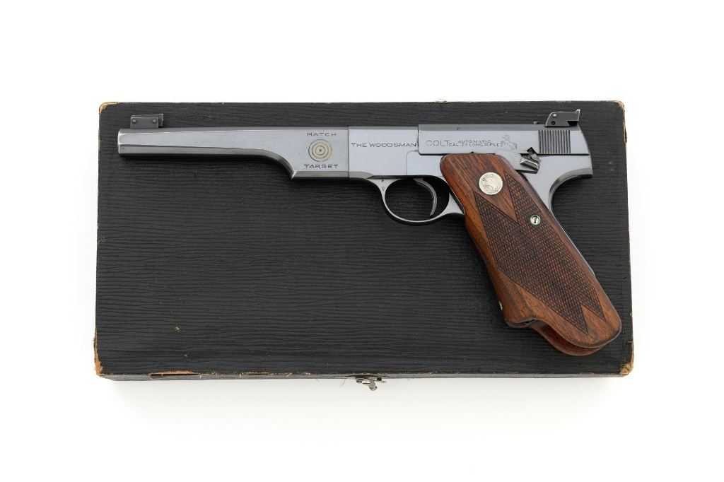 Colt Bullseye Match Target Woodsman 1st Series Semi-Automatic Target Pistol, #MT8183, .22 LR cal., 6-5/8" heavy barrel, blue finish, checkered two-piece walnut "Elephant Ear" grips with Colt medallions, pinned blade front sight (red nail polish added), adjustable square-notched rear sight, with one correct 10-round two-tone magazine marked "COLT WOODSMAN / CAL.22 L.R. / MATCH TARGET MOD.". Includes a custom, period leatherette covered wooden case with screwdriver, maroon velveteen interior, with a print depicting three pointers inside the lid. Case is in very good condition with exposed edges and corners, showing wear and age on the exterior. Interior is very good with impressions and tattered edges.Mfgd 1940. Pistol is in near excellent overall condition, retaining approx. 96%-97% factory blue, showing some areas of thinning, high point edgewear, and minor marks from handling and use. Grips are near excellent with minor smoothing of the checkering detail and bright medallions. Action functions smoothly. Bright bore is near excellent with crisp rifling. Est.: $1,500-$2,500. (C&R)