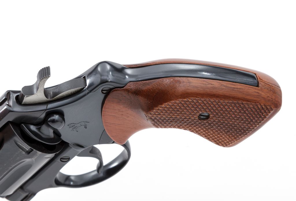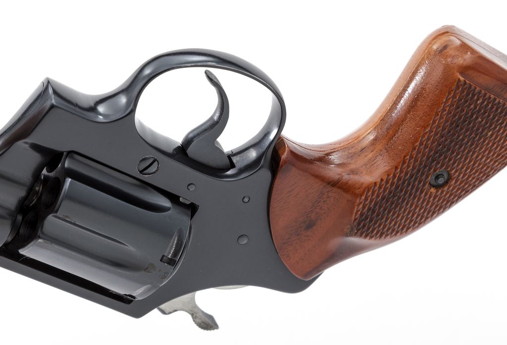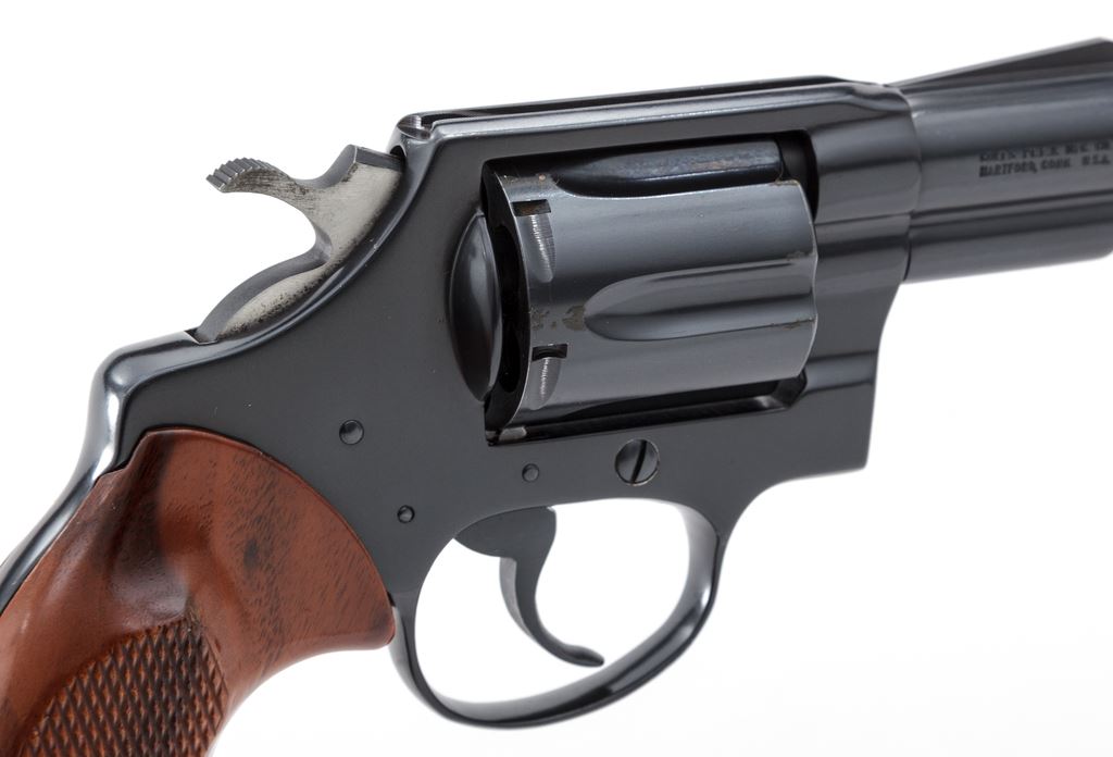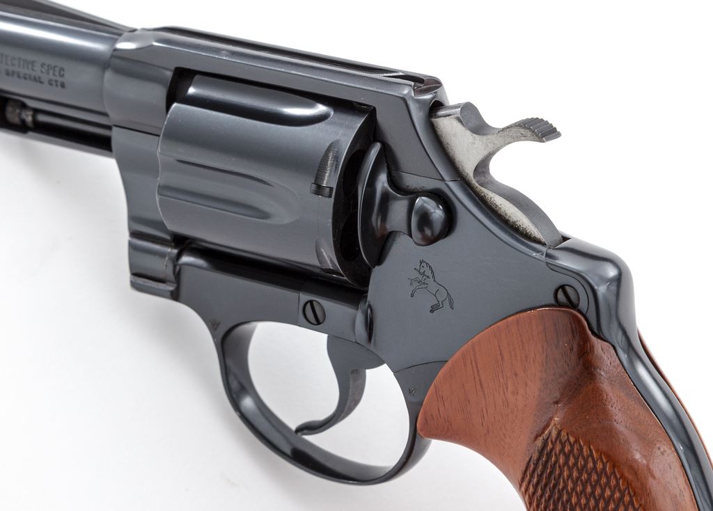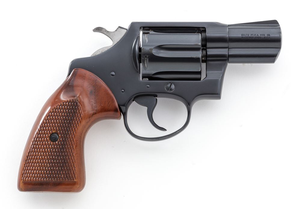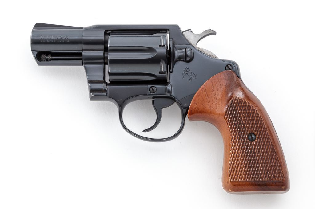Colt Detective Special Double Action Revolver, #P16071, .38 Spec. cal., 2'' barrel, blue finish, factory checkered walnut grips. Mfg'd 1981. Condition is excellent retaining approx. 97% original blue, with just the lightest thinning at edge of muzzle, and a very small spot of corrosion to one area of cylinder. Grips and action are crisp, bore is bright. Est.: $500-$750. (Modern/PPT)