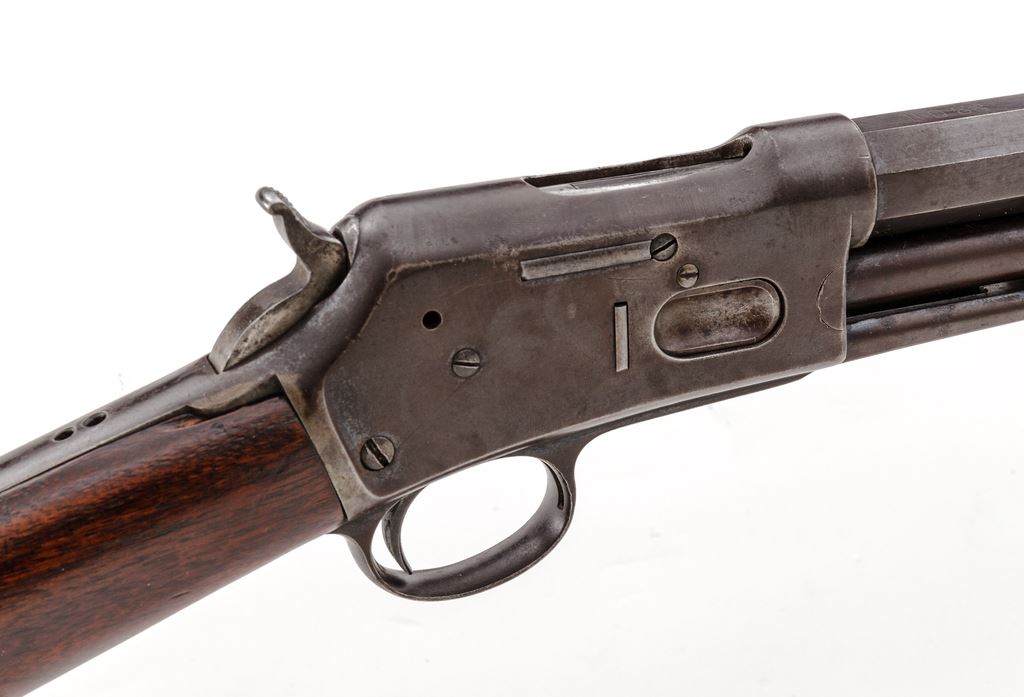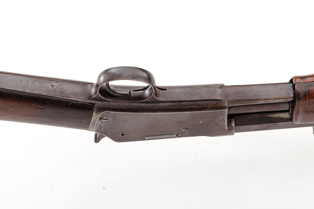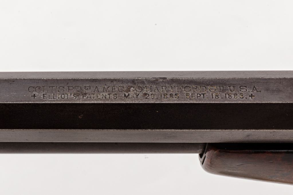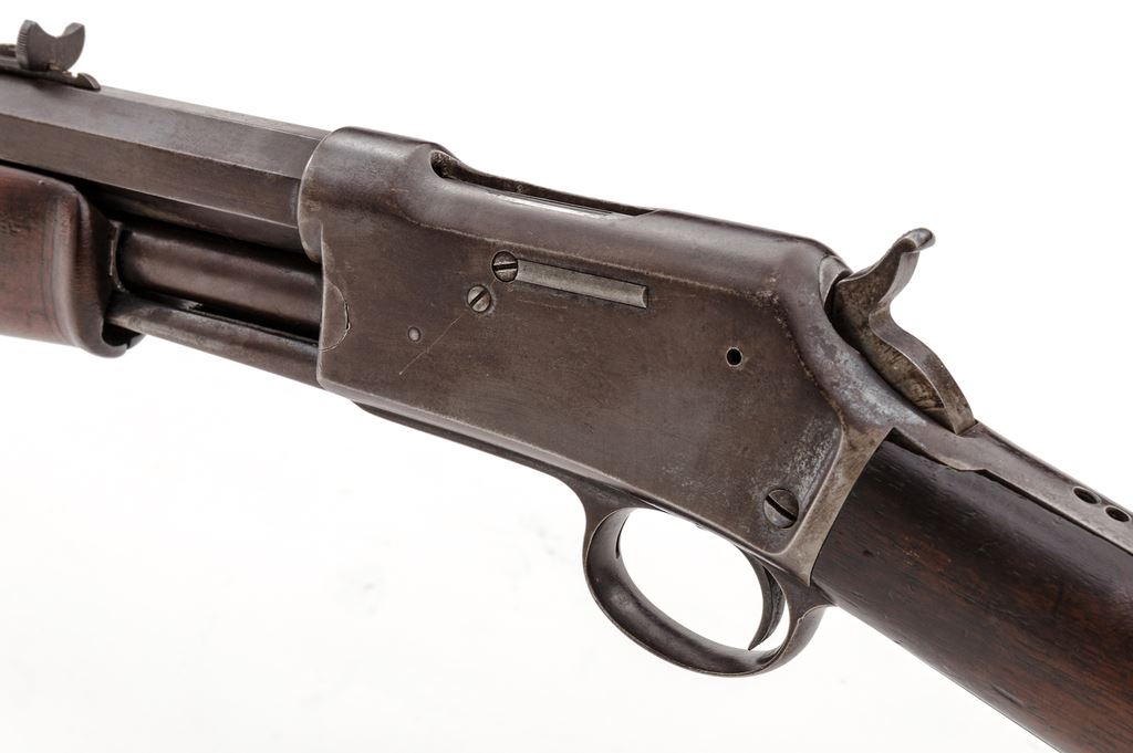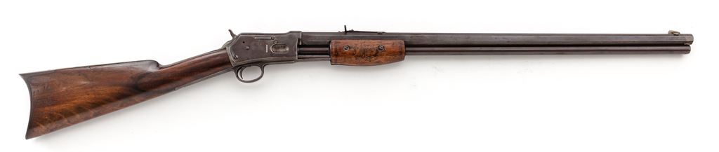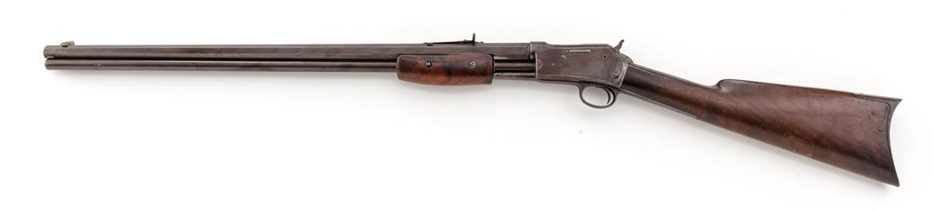 Colt Lightning Medium Frame Magazine Rifle, #10635, .32-20 cal., 26'' octagonal barrel, blue finish, smooth straight walnut stock with crescent steel buttplate, and originally checkered walnut forend; standard rear and Rocky Mountain type front sight. Mfg'd 1885. Condition is good retaining approx. 30%-40% thinning and toning blue, with two threaded tang sight holes to upper tang. Stock with moderate oil darkening, light dings and scratches, losses to right side beneath hammer, as well as repair to right side at wrist; forend with heavy wear showing almost no detail to the original, however light, checkering, and missing its left side forward screw escutcheon. Good action, fair bore. Est.: $750-$1,000. (Antique)