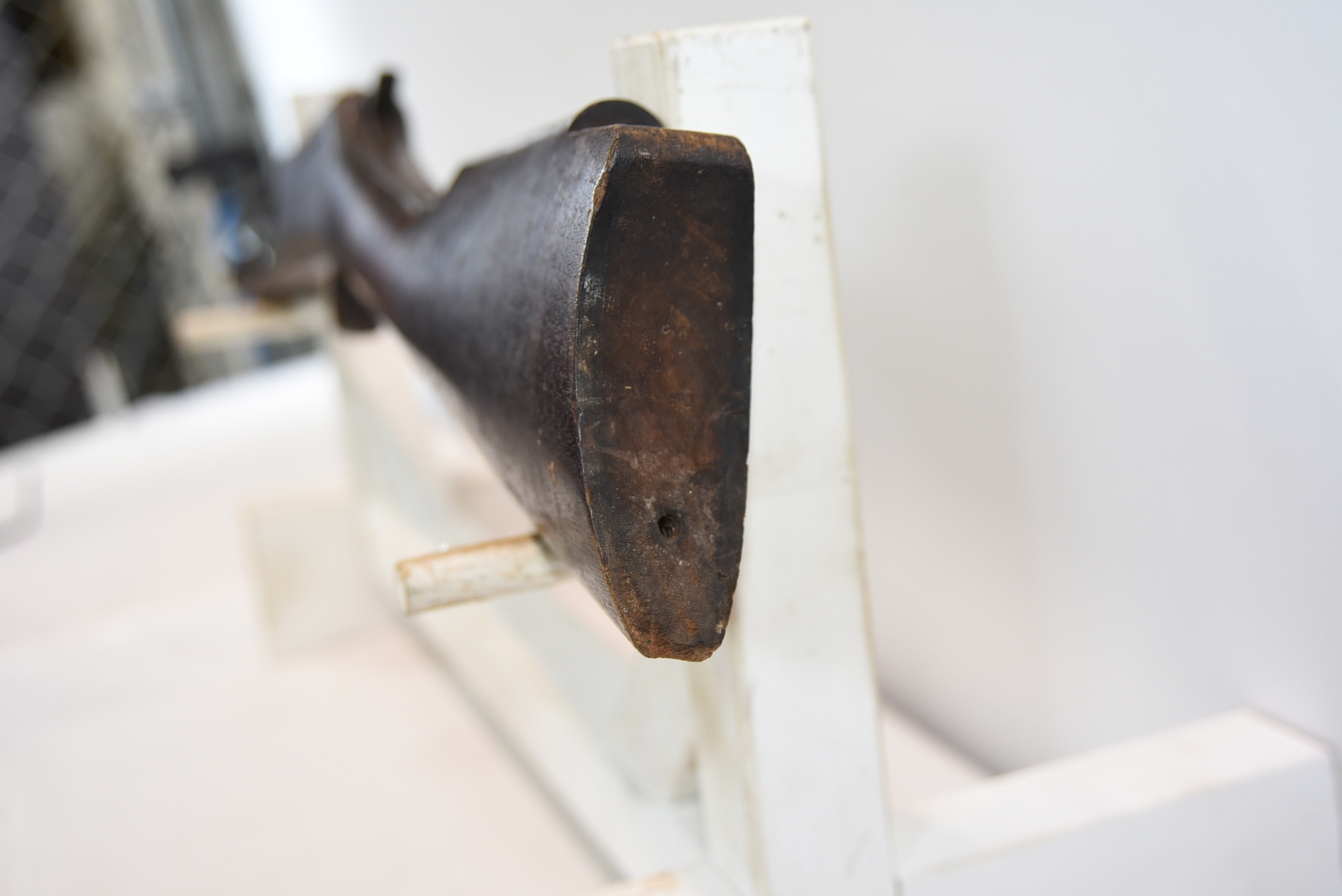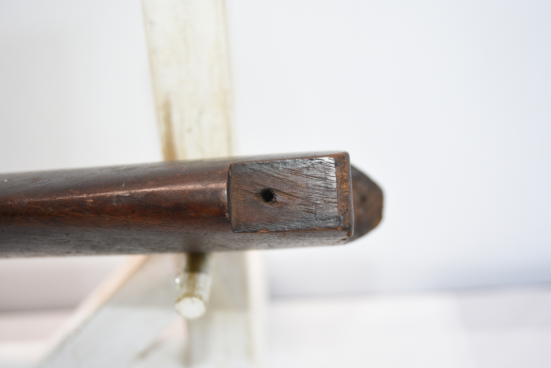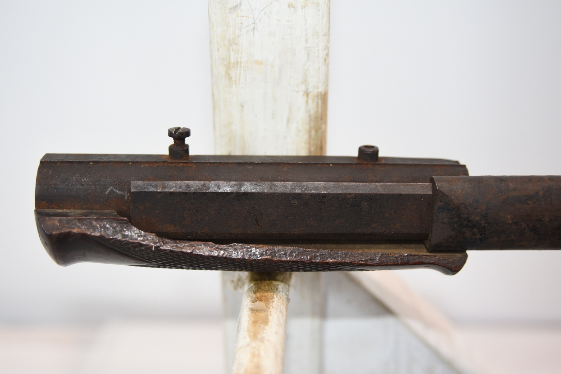 Wood stock shows scratches and scuffs, dents, chips at heel and right side of upper tang, forearm is broken in half, there are small cracks; condition is fair for age.