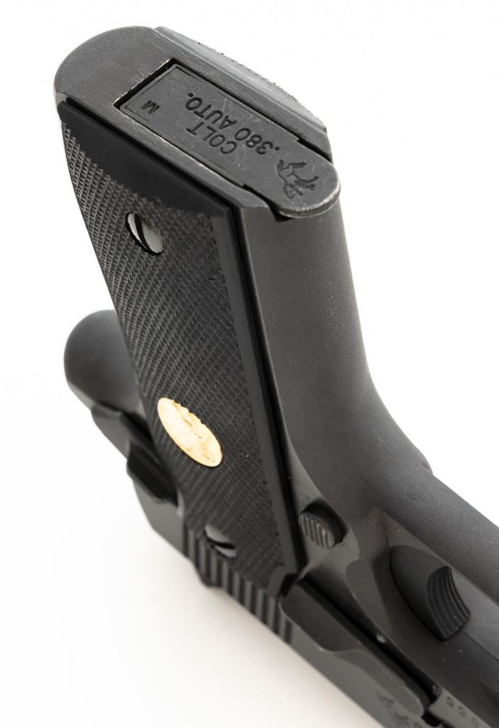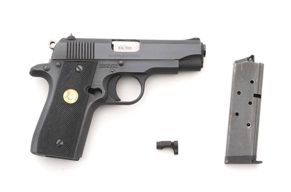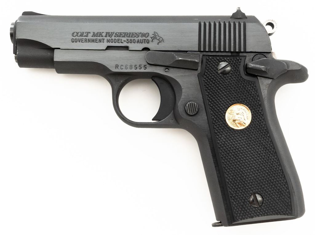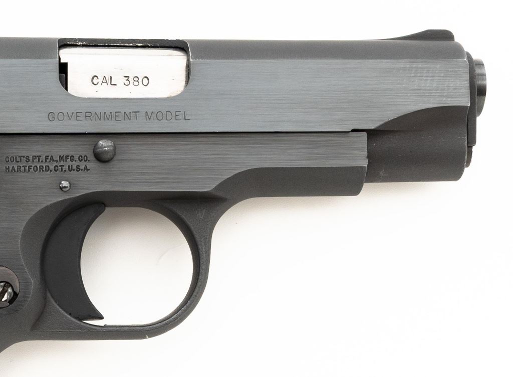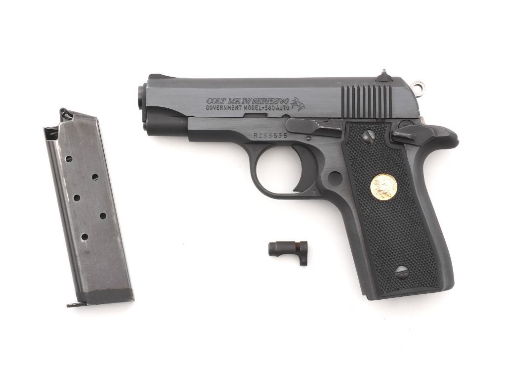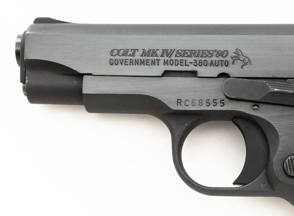 Colt MK IV Series 80 Government Model .380 Semi-Automatic Pistol, #RC68555, .380 ACP cal., 3.25" barrel, blue finish, checkered composite two-piece grips with Colt medallions, ramped blade front sight, drift adjustable square-notch rear sight, with one 7-shot blue steel Colt magazine. Mfgd 1986. Pistol is in excellent overall condition, with minor handling marks, retaining approx. 99% factory blue. Grips are excellent with bright medallions. Action is crisp and functions smoothly. Bore is bright with excellent rifling. The magazine catch, spring and catch lock will need to be replaced. They have rust and do not lock in place. Est.: $700-$1,000. (Modern/PPT)