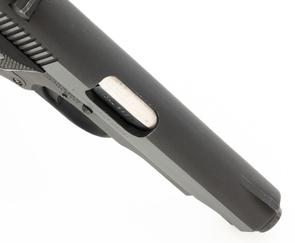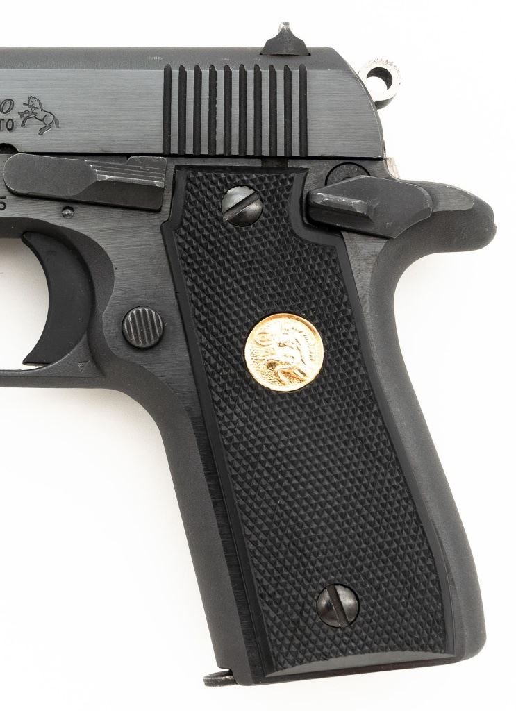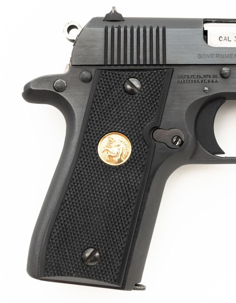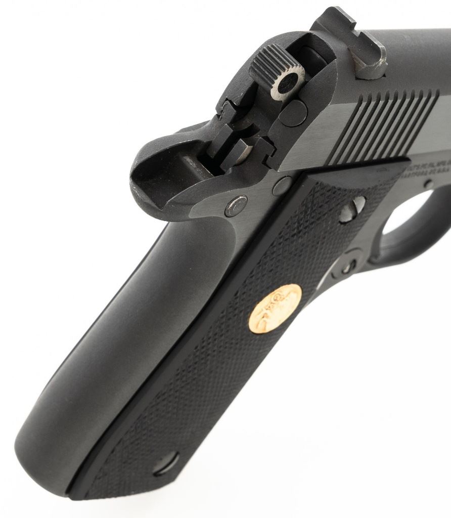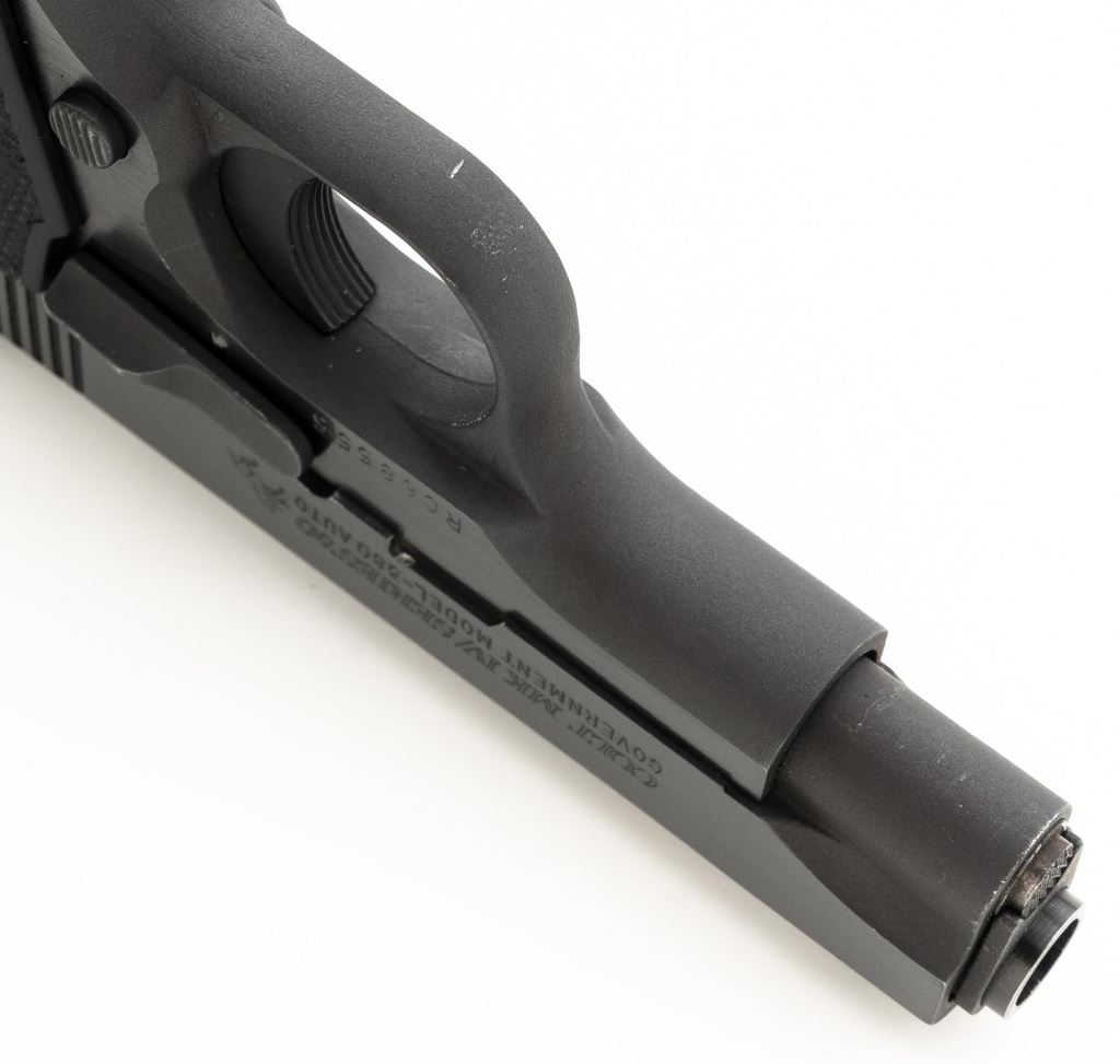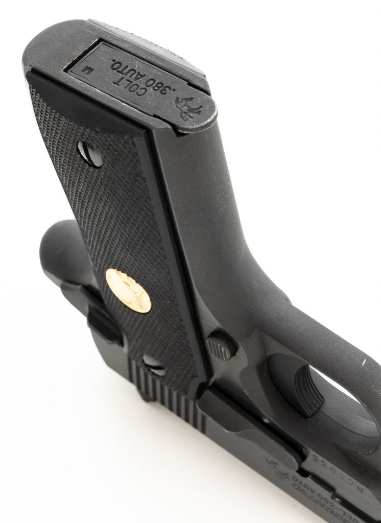 Colt MK IV Series 80 Government Model .380 Semi-Automatic Pistol, #RC68555, .380 ACP cal., 3.25" barrel, blue finish, checkered composite two-piece grips with Colt medallions, ramped blade front sight, drift adjustable square-notch rear sight, with one 7-shot blue steel Colt magazine. Mfgd 1986. Pistol is in excellent overall condition, with minor handling marks, retaining approx. 99% factory blue. Grips are excellent with bright medallions. Action is crisp and functions smoothly. Bore is bright with excellent rifling. The magazine catch, spring and catch lock will need to be replaced. They have rust and do not lock in place. Est.: $700-$1,000. (Modern/PPT)