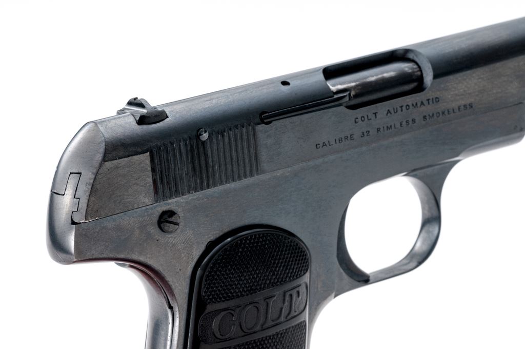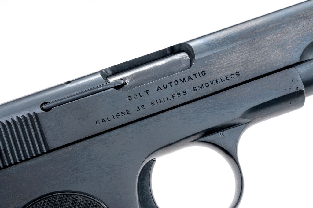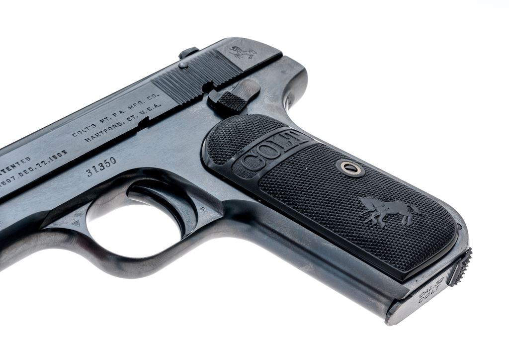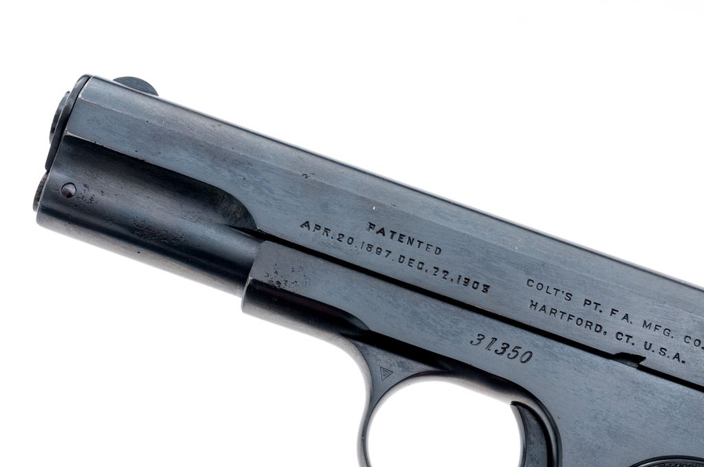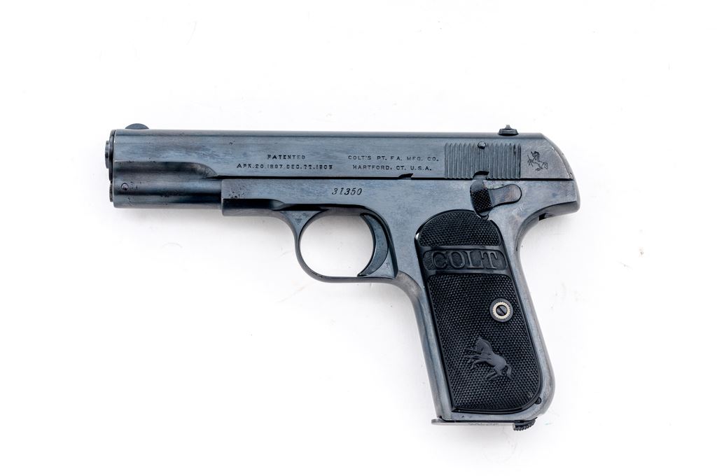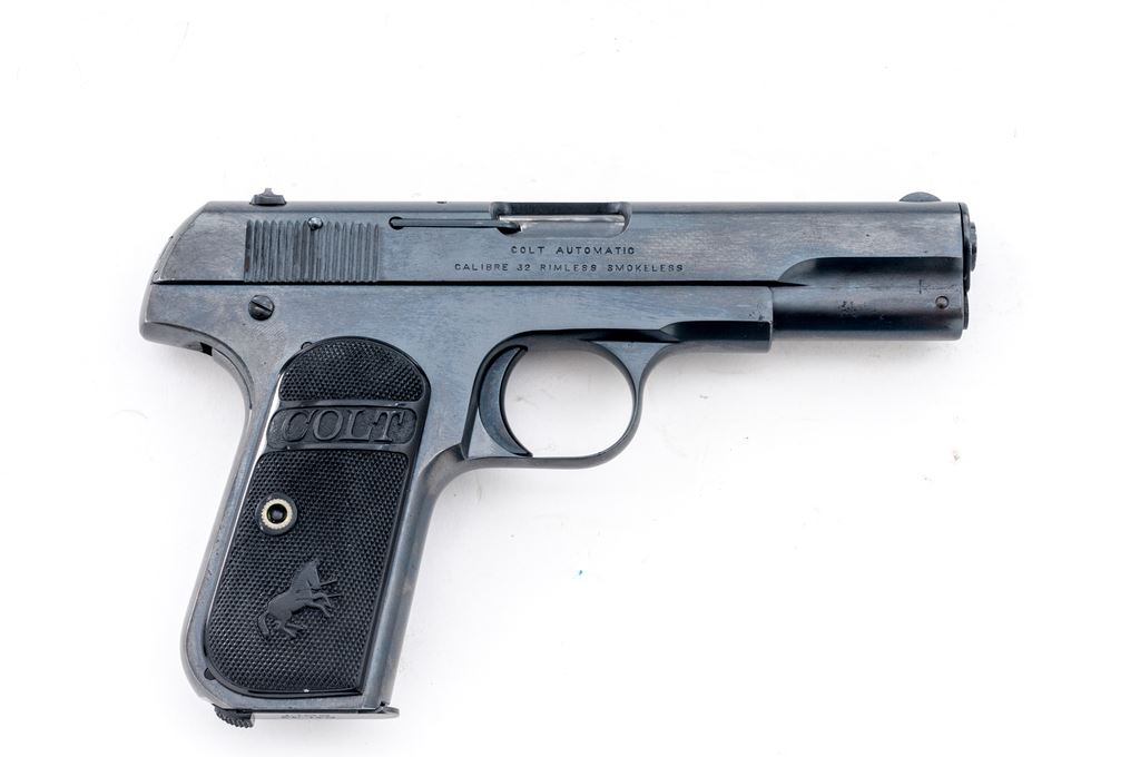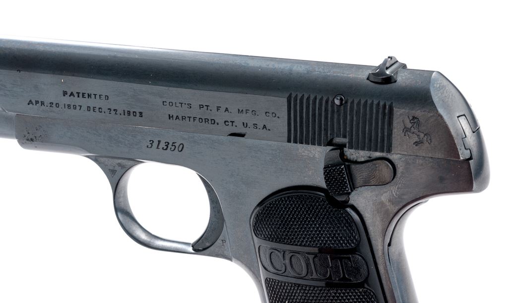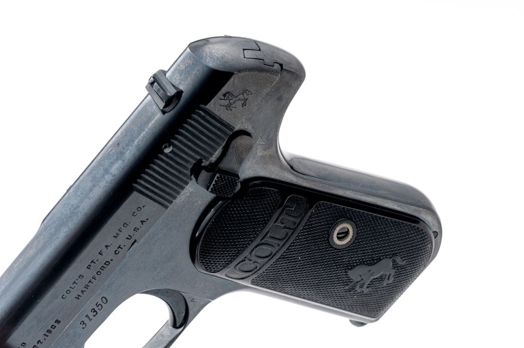 Colt Model 1903 Pocket Hammerless Semi-Automatic Pistol, #31350, .32 ACP cal., 4'' barrel, blue finish, factory checkered hard rubber grips, with one slightly later original factory two-tone magazine. Mfg'd 1905. Condition is excellent as professionally refinished, retaining approx. 98%+ or a later-added Carbona type blue, with very minor light pitting to forward right portions of slide and frame, which detracts little. Grips are crisp and excellent. Good action, fine bore. Est.: $450-$650. (C&R/PPT)(John Ackerman collection)