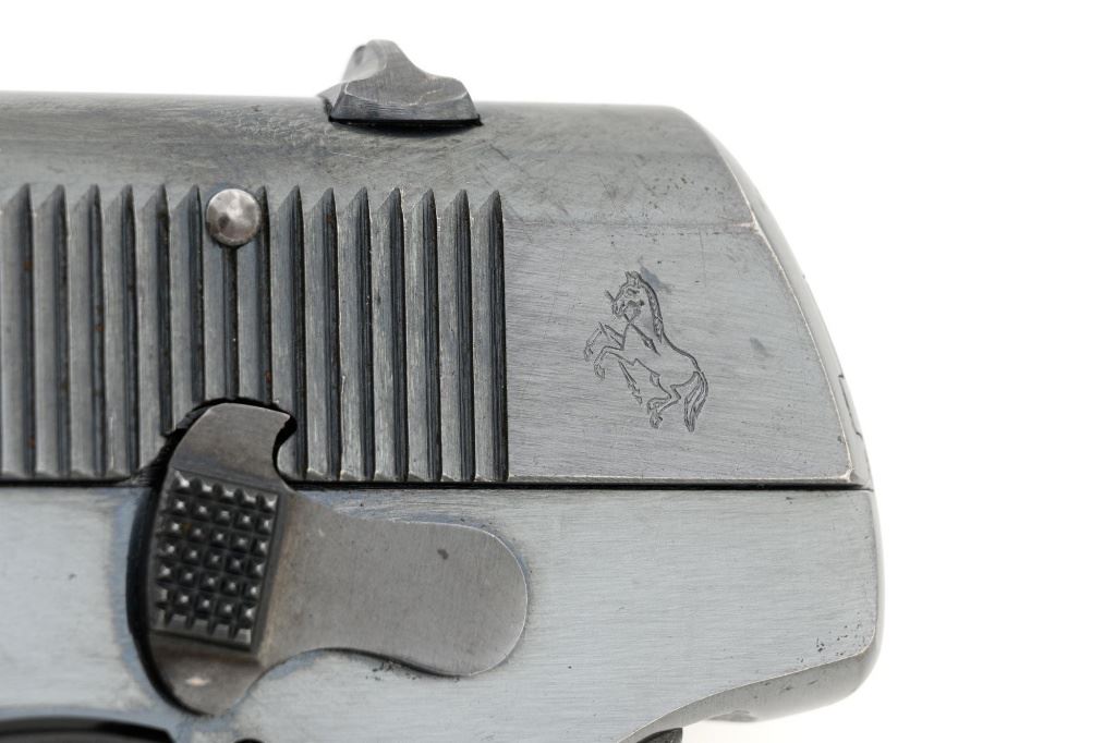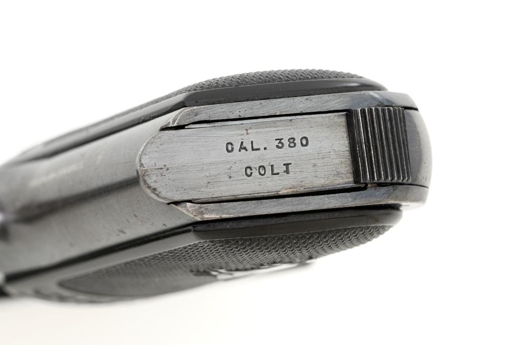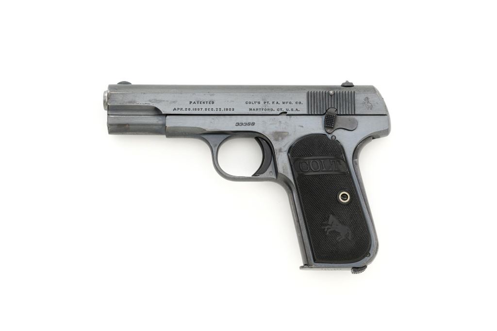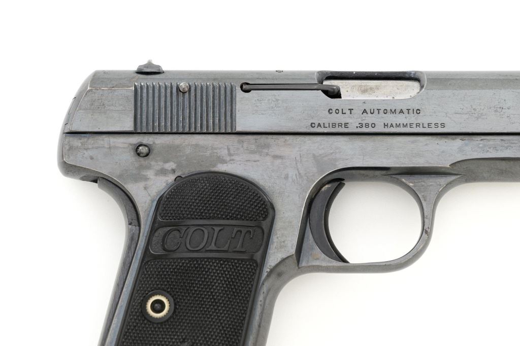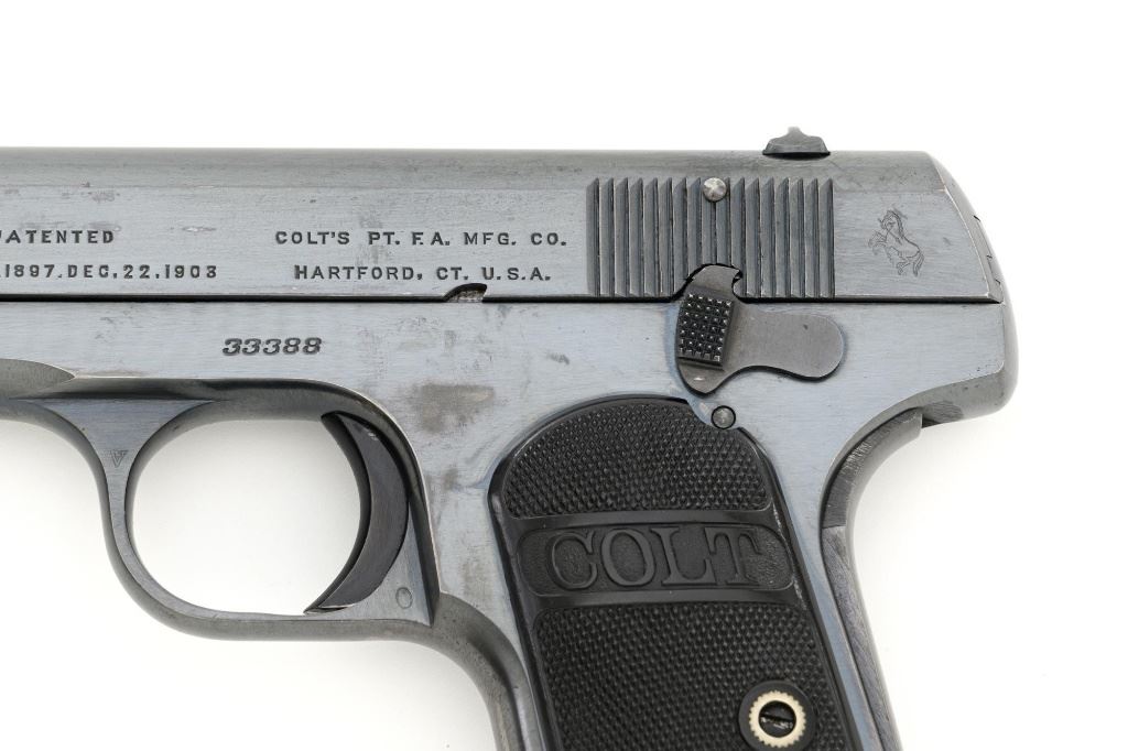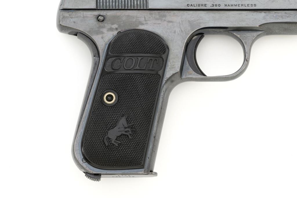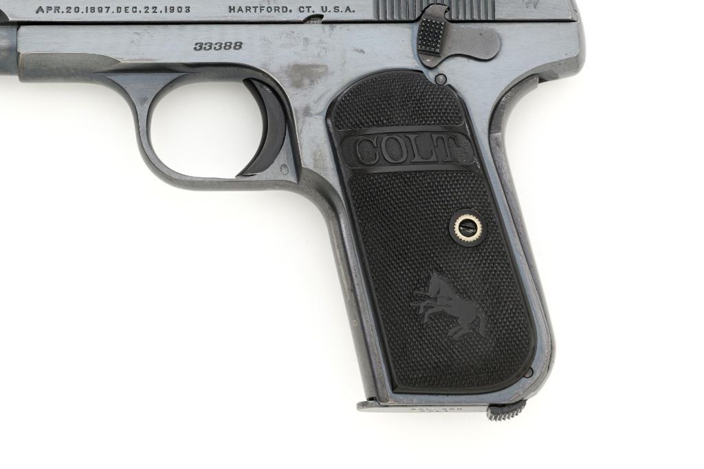 Colt Model 1908 Pocket Hammerless Type I Semi-Automatic Pistol, #33388, .380 ACP cal., 3.75" barrel, blue finish, checkered hard rubber two-piece Colt grips, half-moon blade front sight, and fixed rear sight with small "U"-notched groove. Includes blue steel magazine, base is marked "CAL .380/COLT". Mfgd 1918. Overall condition of this pistol is fine+, retaining approx. 90%-92% factory blue, with intermittent minor salt and pepper blemishes and handling marks, with spots of finish loss, particularly on right rear of the frame. Factory lettering is clear. Grips are near excellent, showing mild handling wear, no chips, or cracks. Action operates smoothly. Bore is bright, rifling is clearly defined and rates good overall. Magazine retains most of the finish but has a mottled appearance on the upper portion that is in the white. Est.: $700-$900. (C&R/PPT)