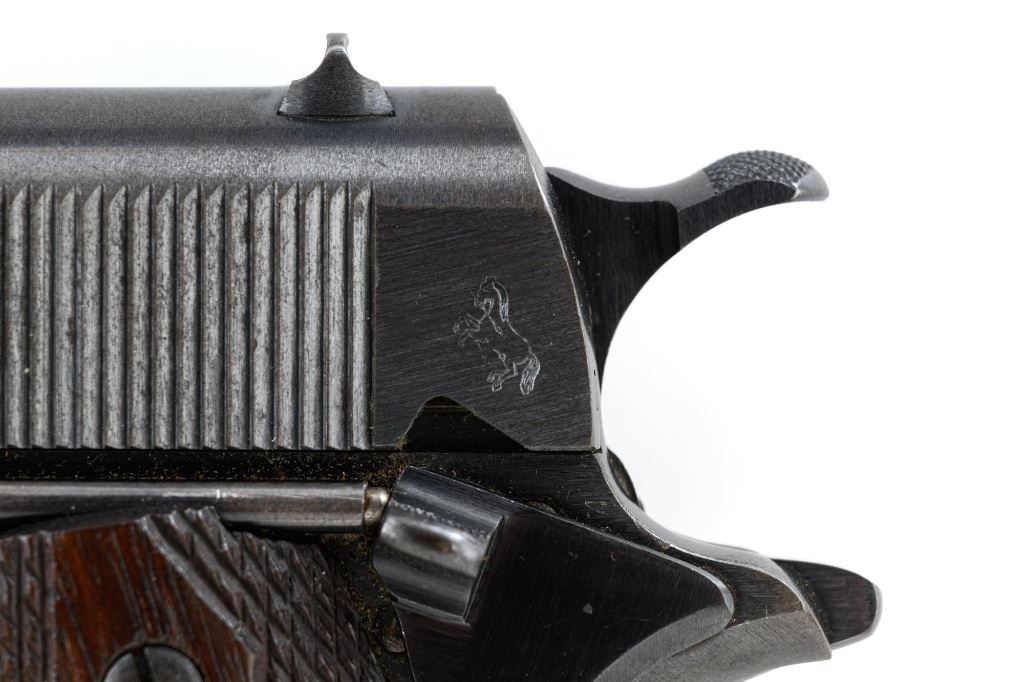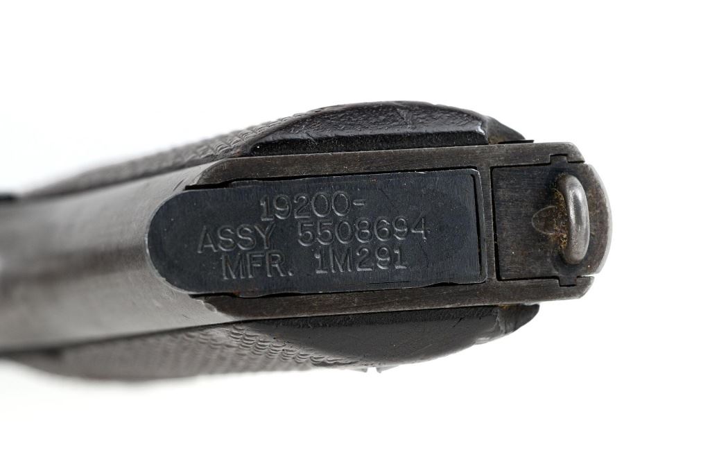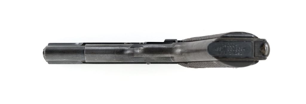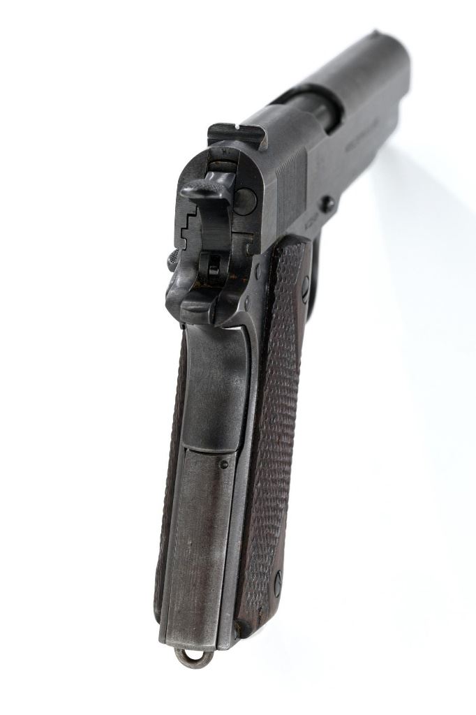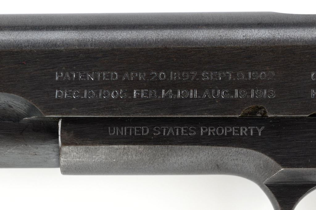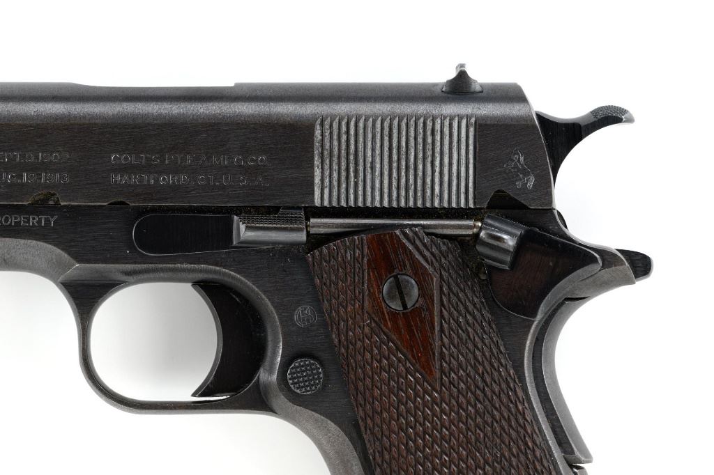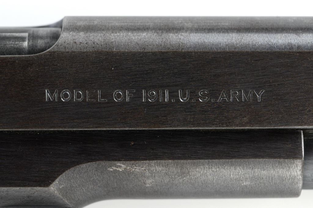 Colt Model 1911 U.S. Army Semi-Automatic Pistol, #225039, .45 ACP cal., 5" barrel, blued finish, checkered double diamond wood grips, with standard blade front sight and "U"-notched rear sight. Includes one circa-1970s magazine. Mfg'd 1918. Frame is marked "UNITED STATES PROPERTY" with "GHS" (Maj. Gilbert H. Stewart) inspection mark on the left side. Slide is marked with patent dates to Aug. 19, 1913, and Colt company markings on the left side. "(Rampant Colt)" logo at the rear is not circled. Right side of the slide is marked "MODEL OF 1911 U.S. ARMY". Barrel is marked "COLT.45 AUTO". Pistol is in very good overall condition, retaining approx. 75%-80% thinning and toning factory blue, with areas of mild frosting and freckling. Most of the wear is on the grip area and top of the slide. Grips are very good with a few light dents and handling marks. Action operates smoothly but the disconnector does not hold the hammer when slide is out of battery and the trigger is pulled. Bore is very good with sharp rifling. Est.: $2,000-$2,500. (C&R)