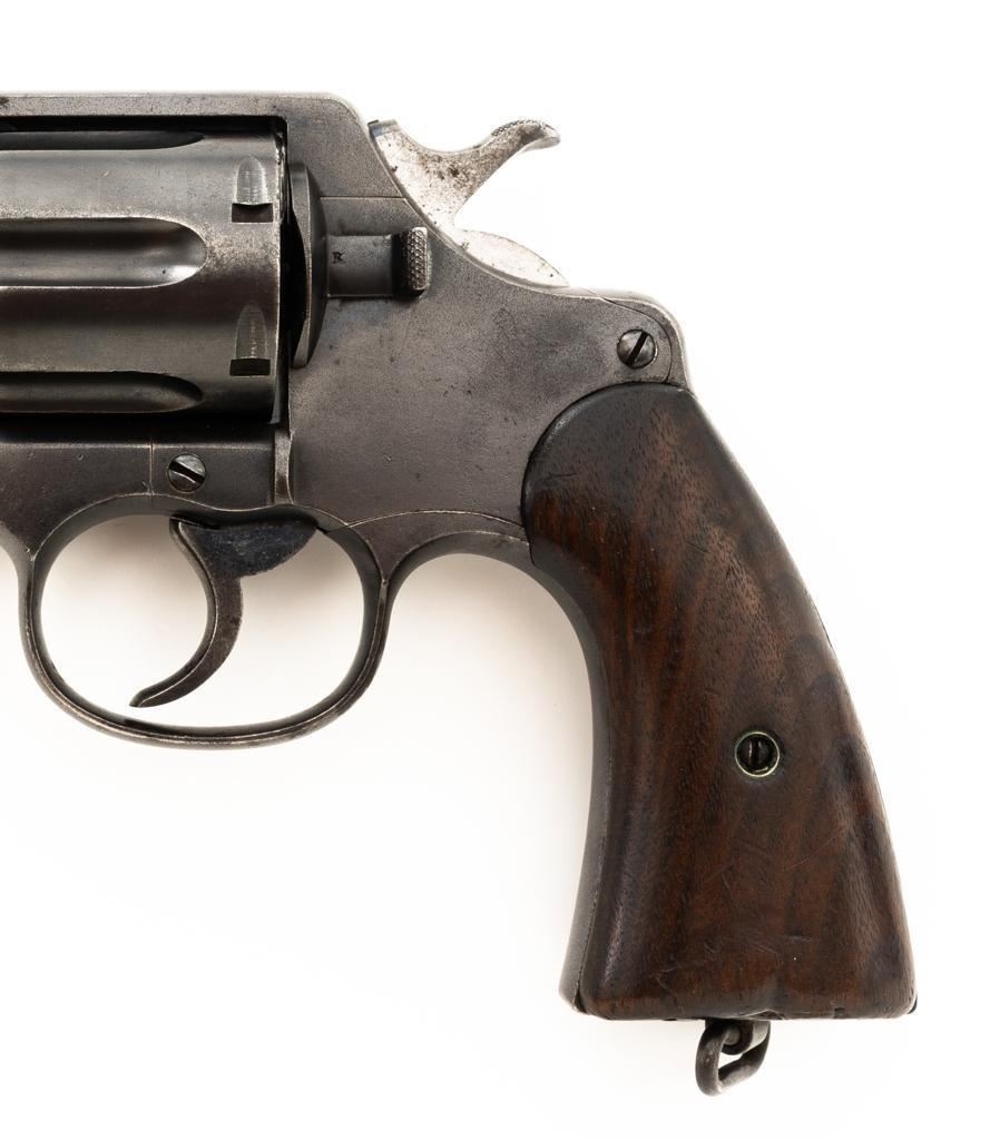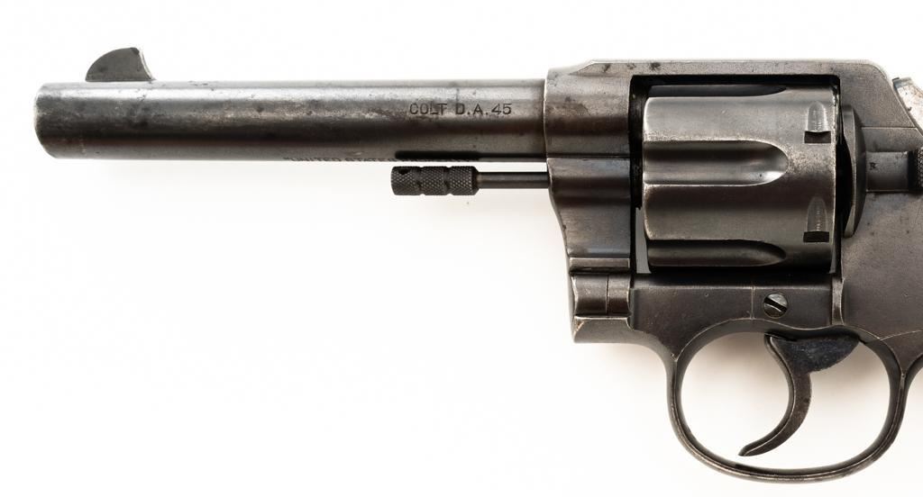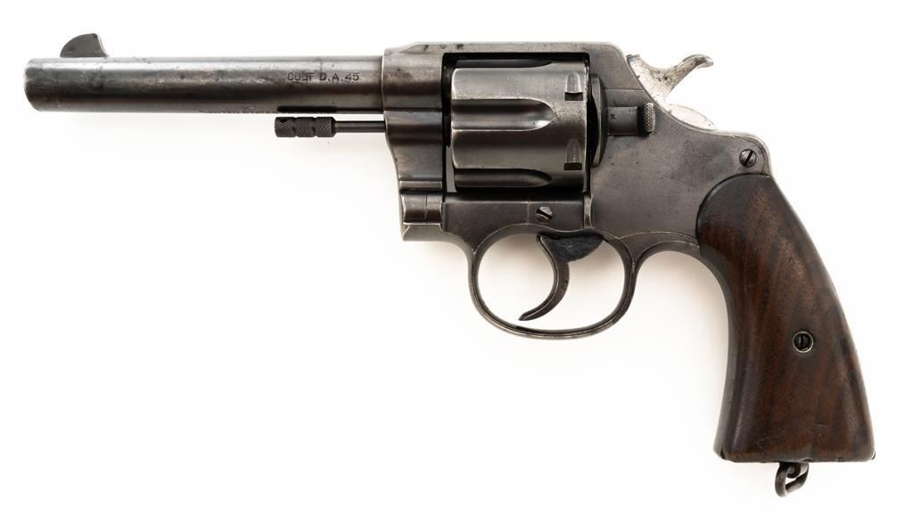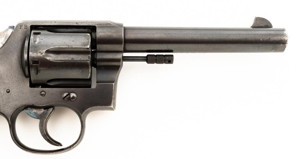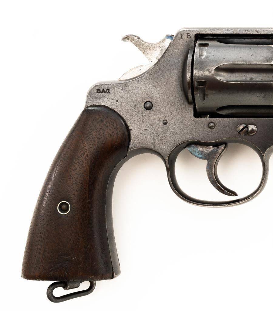 Colt New Service U. S. Army Model 1909 Double Action Revolver, #31214, .45 Colt cal., 5.5" barrel, blue finish, smooth walnut two-piece grips with lanyard ring, blade front and fixed "U"-notch rear sight, with a fire blue hammer and trigger. Marked with "R.A.C." (Rinaldo Carr) proofs at the right rear of the frame and rear of cylinder, "F.B." (Major Frank Baker) at the top right of the frame, "UNITED STATES PROPERTY" on the underside of the barrel. Butt is marked, "U.S. ARMY MODEL 1909". There is a partial "(Rampant Colt)" at the left rear of the frame. Mfgd 1911. Revolver is in very good overall condition, retaining approx. 80%-85% thinning factory finish, with scattered mild surface erosion, general handling marks. Hammer and trigger display muted fire blued finish, brighter on the trigger. Grips are in good condition, showing smoothing of the checkering, with impressions and a couple deeper dents on the left panel. Action functions well and locks up securely. Bore is very good, with light erosion and defined rifling. Est.: $800-$1,000. (C&R/PPT)