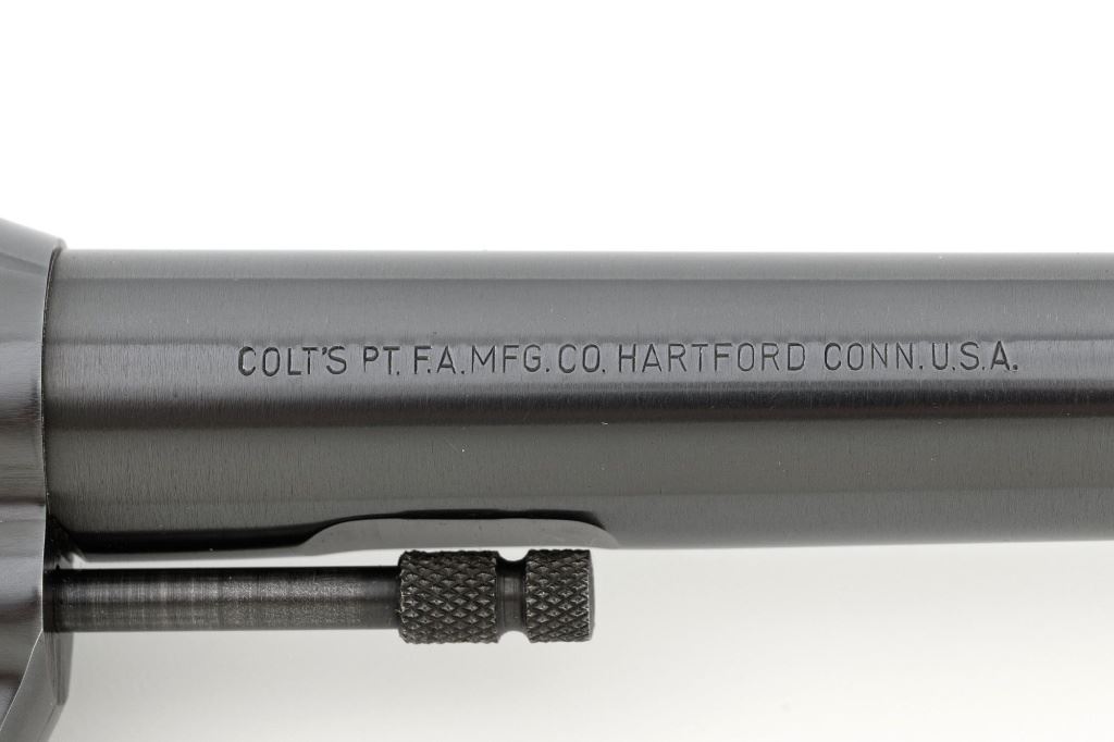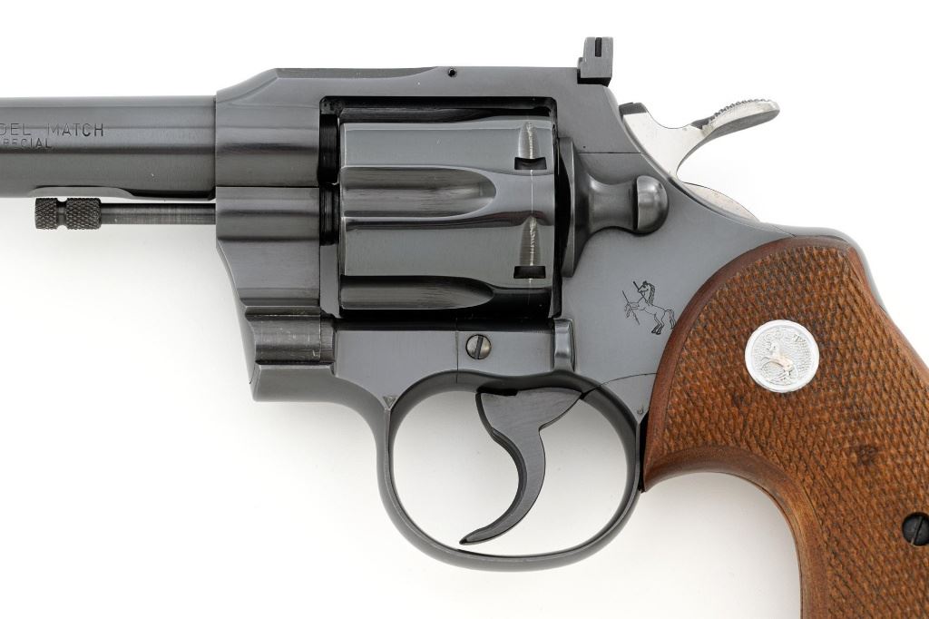 Colt Officers Model Match 5th Issue Double Action Revolver, #912798, .38 Spl. cal., 6" tapered heavy barrel, blue finish, checkered walnut two-piece target grips with Colt medallions, serrated ramped blade front and Accro micrometer adjustable rear sights, with wide target hammer, and factory ribbed trigger. Mfgd 1965. Revolver is in excellent overall condition, retaining approx. 97%-98% factory finish, with light wear at the muzzle and minor handling marks. Cylinder shows modest leading edgewear and a faint index line. Grips are in excellent condition with fine checkering detail and fit. Action is crisp and locks up securely. Bore is excellent, showing little use. Est.: $700-$900. (C&R)