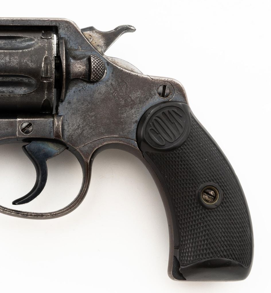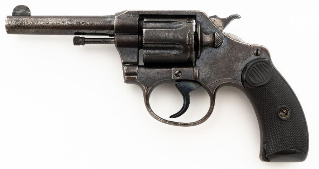 Colt Pocket Positive First Issue Double Action Revolver, #96413, .32 Police cal., 3.5" barrel, blued finish, factory checkered two-piece hard rubber Colt grips, fixed half-moon blade front sight, and notched rear sight. Standard markings for this model are correct. Mfgd 1920. Revolver is in good overall condition, as uncleaned, retaining approx. 35% original finish, balance gone to a dark brown patina, with scattered areas of pinprick pitting. Markings are clear. Grips show moderate handling wear and there is an old chip to the lower front bottom of the left panel. Action functions well. Bore with intermittent spots of mild erosion and very good, defined rifling. Est.: $150-$250. (C&R)