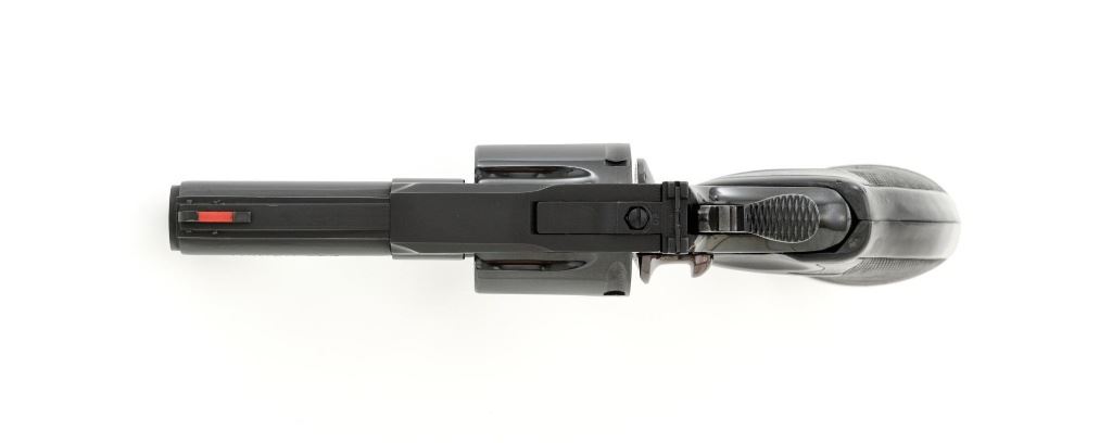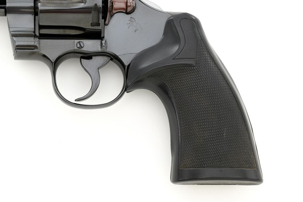 Colt Python Double Action Revolver with Replacement 3 Colt Barrel, #E78973, .357 Mag. cal., 3" barrel with ventilated rib, blue finish, checkered black rubber Pachmayr "Presentation" two-piece grips, ramped blade front sight with red insert, and adjustable square-notch rear sight. Mfgd 1974. Factory barrel was replaced with a 3" Colt barrel, as the 3" barrel was not an option in 1974. Revolver is in excellent overall condition as refinished, retaining approx. 98%-99% reblued finish, with only light handling marks. Cylinder release has gone to plum with age. Grips are excellent with sharp checkering and fit well. Action is crisp and functions smoothly. Bore is excellent, showing little use. Est.: $1,800-$2,400. (C&R/PPT)