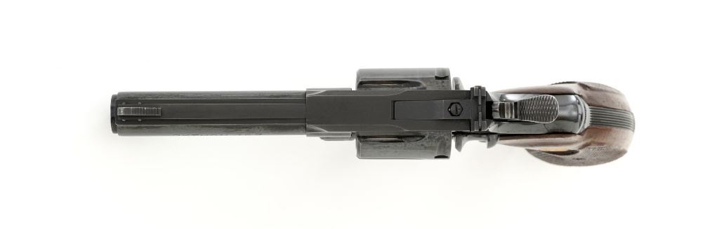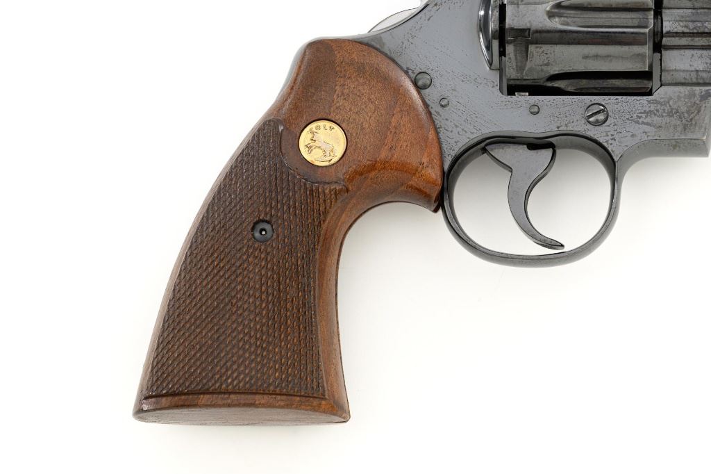 Colt Python Double Action Revolver, #E2988, .357 Mag. cal., 4" vent rib barrel, blue finish, checkered walnut two-piece grips with Colt medallions, ramped serrated blade front sight, and adjustable square-notch rear sight. Mfgd 1969. Revolver is in near excellent overall condition, retaining approx. 96%-97% factory blue finish, with light holster wear at the muzzle, intermittent light scratches, and handling marks on the barrel. Previous owner etched their personal identification number above and below the serial number on inside of frame, not visible when the cylinder is closed. Cylinder shows light leading edgewear, small marks, and a moderate index line. Factory lettering is clear. Grips are near excellent with sharp checkering and bright medallions. Action functions smoothly. Bore is bright with near excellent rifling. Est.: $2,000-$2,500. (C&R/PPT)