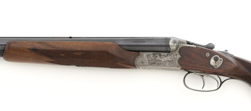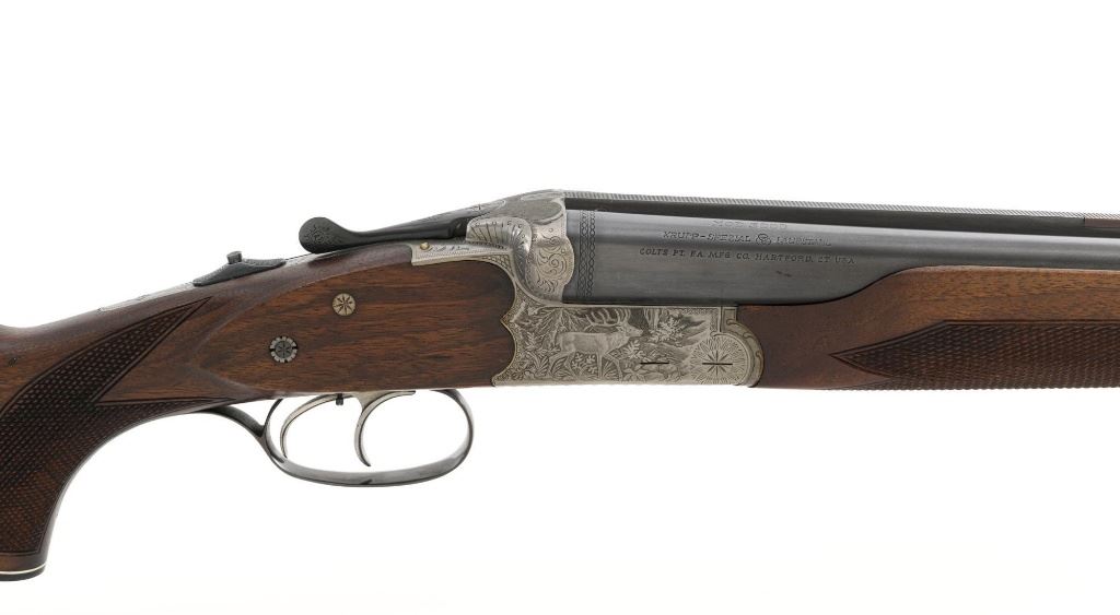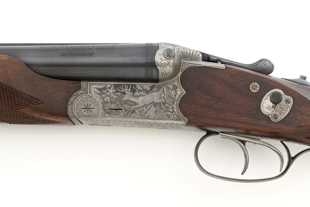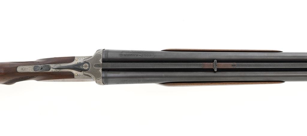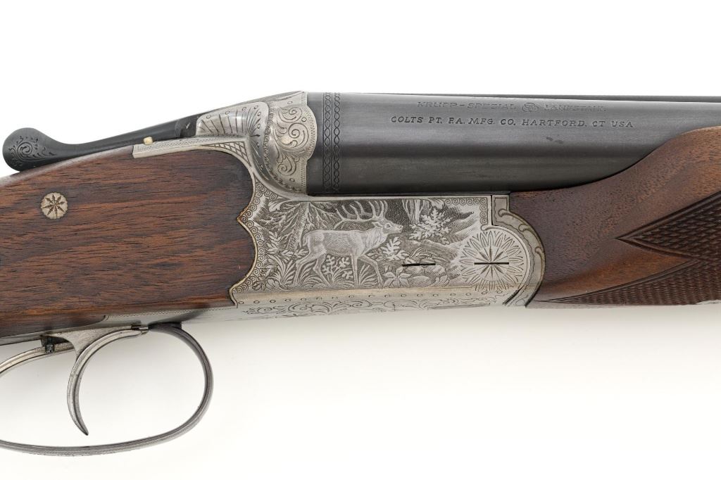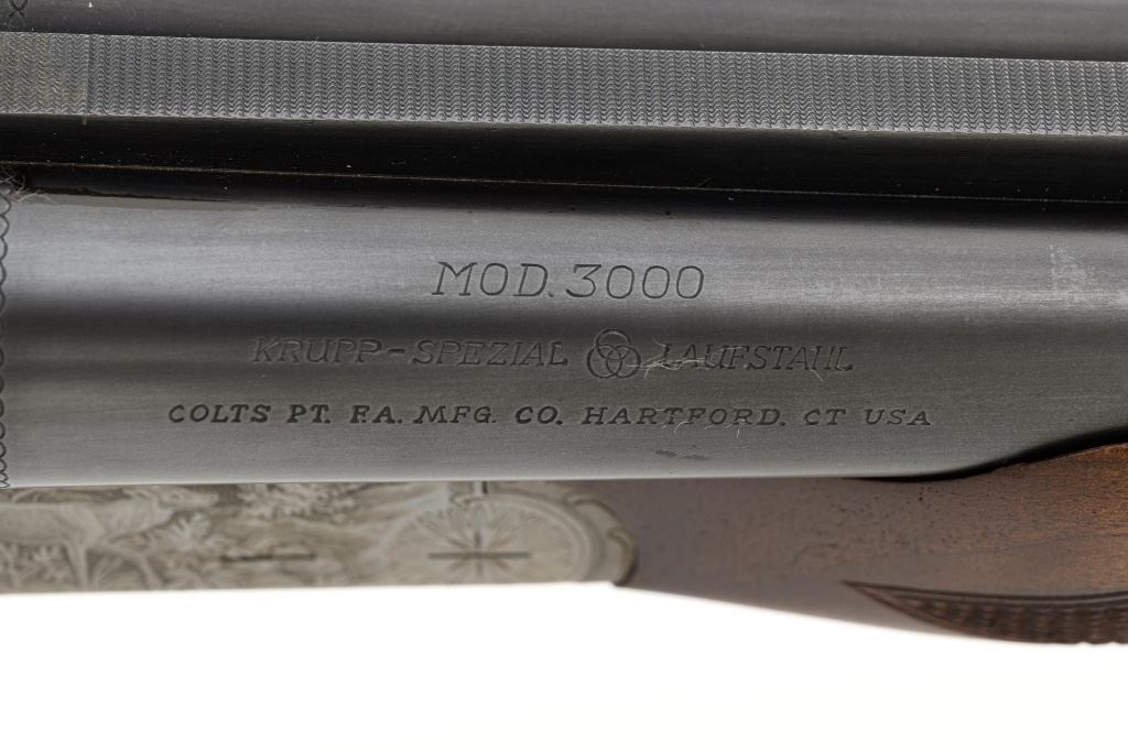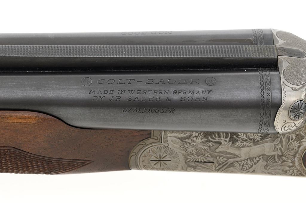 Colt-Sauer Model 3000 Drilling, #GG7743, 12ga./.30-06, 25" shotgun barrels are mounted with a hollow/solid rib to allow shots at birds on the wing, while a lower .30-06 single shot rifle barrel will allow taking of large mammals. Barrels are all Krupp fluid steel. Right hand barrel is marked "Colts PT. FA. MFG CO. Hartford, CT, USA". Shotgun Barrels have 2-3/4" chambers and are choked IM/Full. Action is an expansion of the normal double, with additional controls for the rifle barrel. Lockup is underlug with Greener crossbolt. There are other controls for rifle sight and shotgun cocking indicators. Receiver is finely engraved with game scenes, consisting of a standing bull elk on the right side and running buck on the left. Engraving extends onto the trigger guard and other small inlaid metal parts. Beavertail forend and pistol grip buttstock are satin finished walnut with grip cap and Sauer buttpad. LOP is 14-3/8". Mfgd in the 1980s. Condition is near excellent. Metal surfaces show a few light handling marks and areas of very light scratching. Stock and forend are also in near excellent condition with minor handling marks and a few small dents. Checking is sharp but the forearm does have a small chip on the left side, and a spot of discoloration just behind. Action functions smoothly. Shotgun barrels are bright. Rifle barrel is bright with well-defined rifling. Est.: $3,000-$4,000. (Modern)
