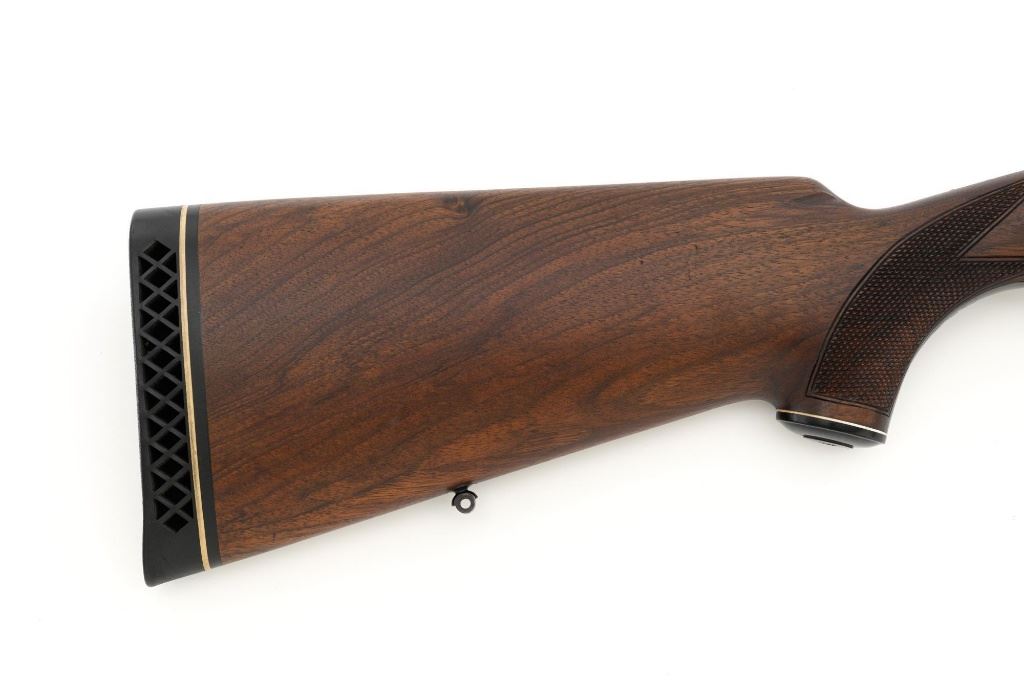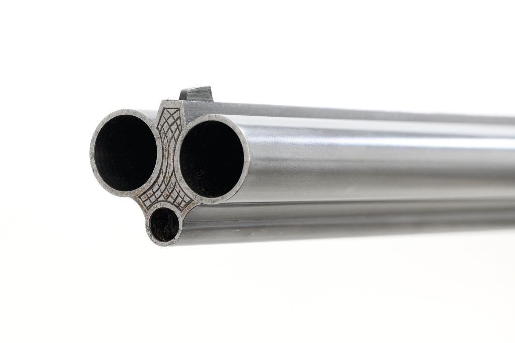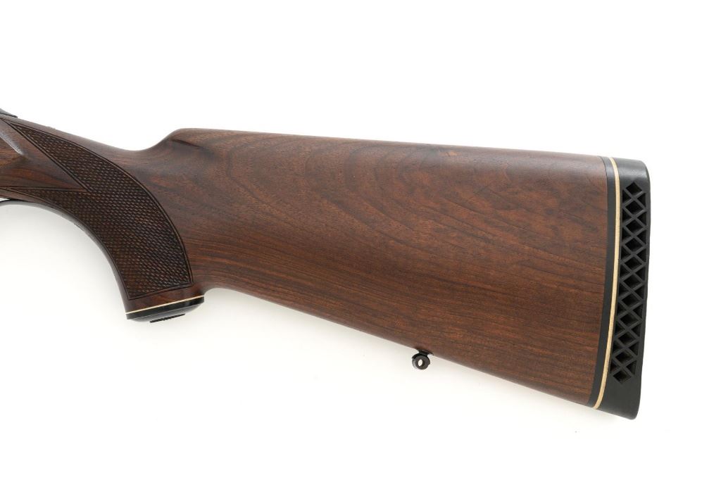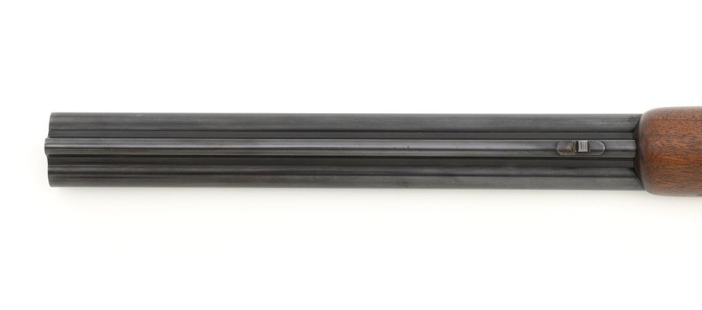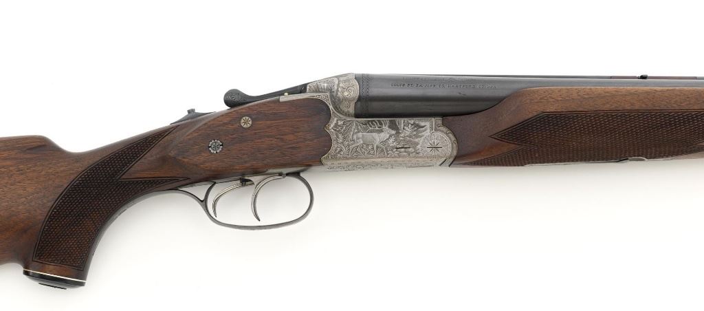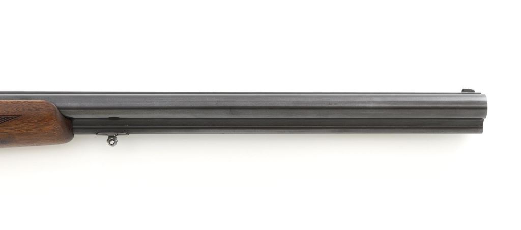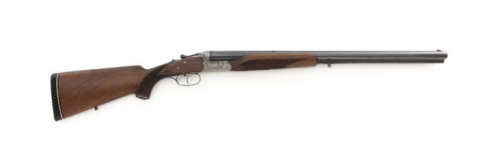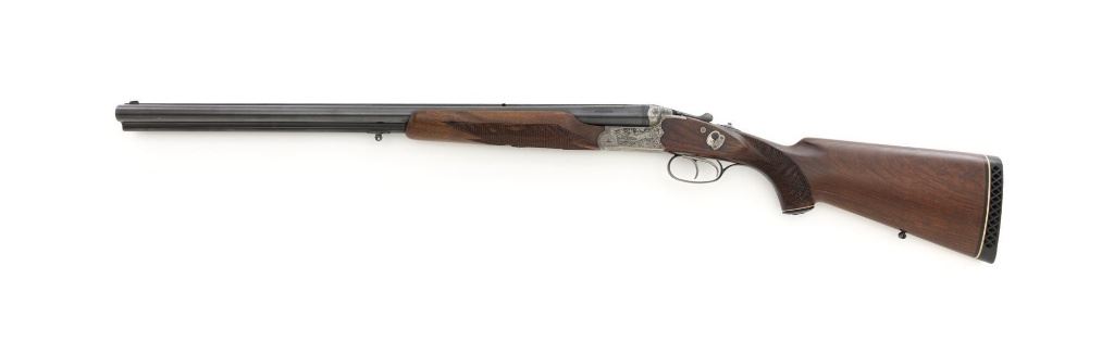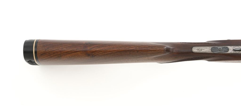 Colt-Sauer Model 3000 Drilling, #GG7743, 12ga./.30-06, 25" shotgun barrels are mounted with a hollow/solid rib to allow shots at birds on the wing, while a lower .30-06 single shot rifle barrel will allow taking of large mammals. Barrels are all Krupp fluid steel. Right hand barrel is marked "Colts PT. FA. MFG CO. Hartford, CT, USA". Shotgun Barrels have 2-3/4" chambers and are choked IM/Full. Action is an expansion of the normal double, with additional controls for the rifle barrel. Lockup is underlug with Greener crossbolt. There are other controls for rifle sight and shotgun cocking indicators. Receiver is finely engraved with game scenes, consisting of a standing bull elk on the right side and running buck on the left. Engraving extends onto the trigger guard and other small inlaid metal parts. Beavertail forend and pistol grip buttstock are satin finished walnut with grip cap and Sauer buttpad. LOP is 14-3/8". Mfgd in the 1980s. Condition is near excellent. Metal surfaces show a few light handling marks and areas of very light scratching. Stock and forend are also in near excellent condition with minor handling marks and a few small dents. Checking is sharp but the forearm does have a small chip on the left side, and a spot of discoloration just behind. Action functions smoothly. Shotgun barrels are bright. Rifle barrel is bright with well-defined rifling. Est.: $3,000-$4,000. (Modern)