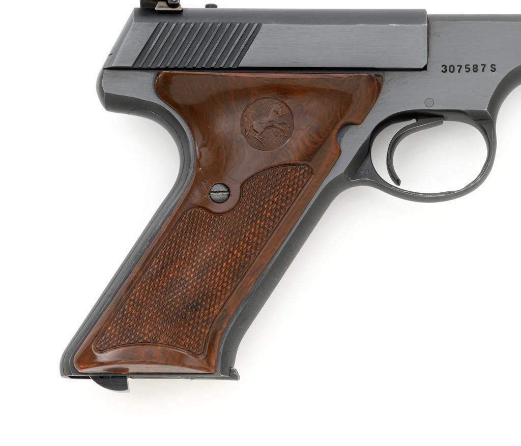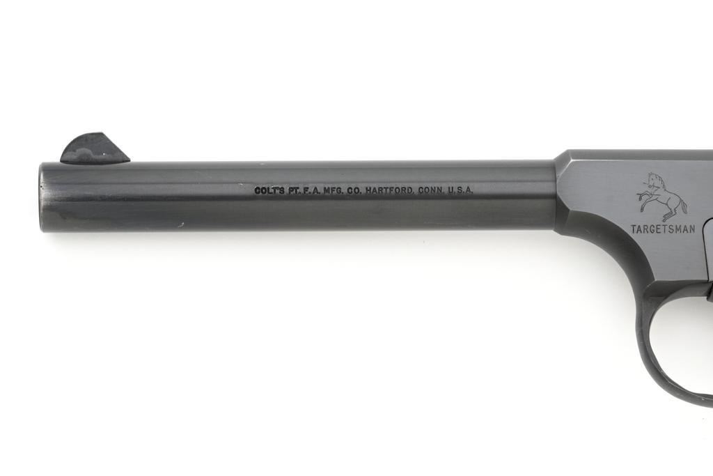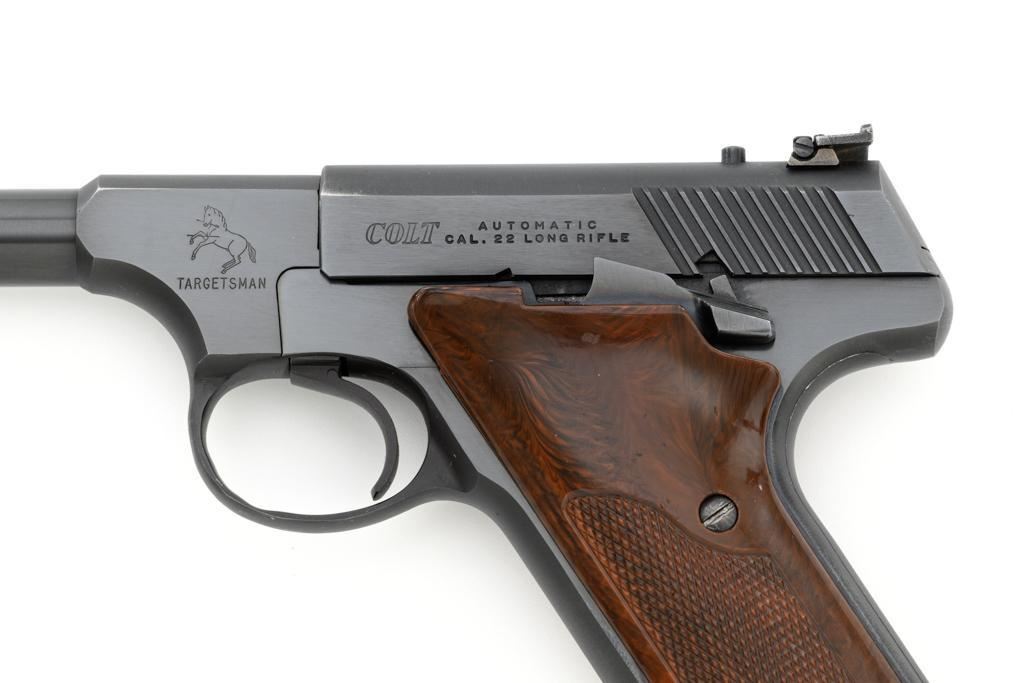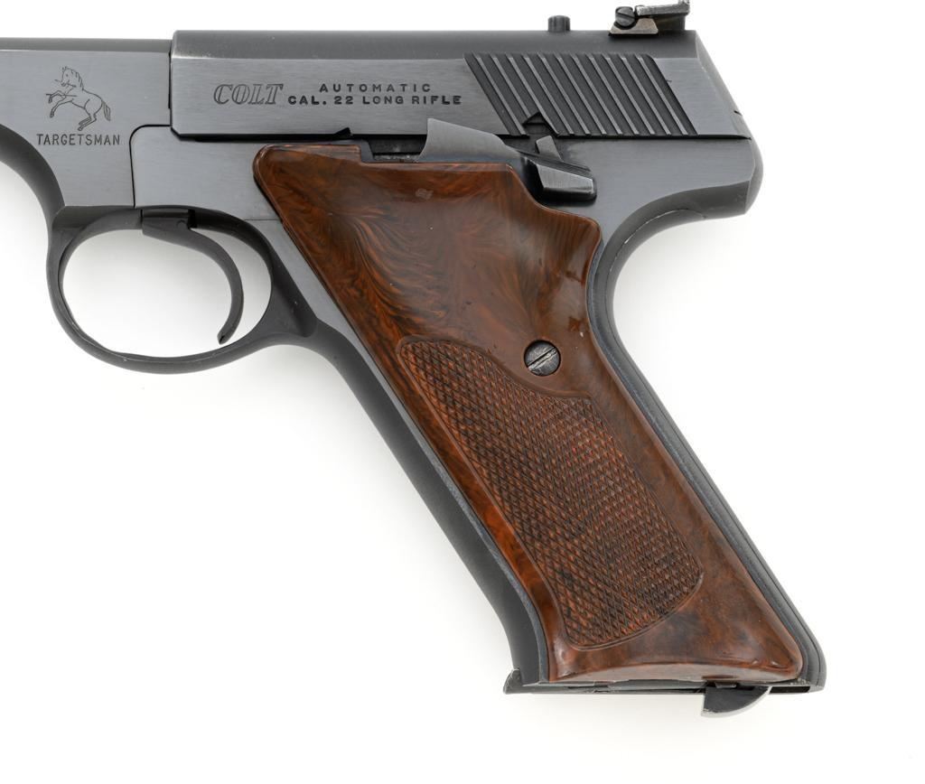 Colt Targetsman Semi-Automatic Pistol, #307587S, .22 LR cal., 6" barrel, blue finish, checkered Coltwood two-piece grips, serrated blade front sight, and adjustable square-notch rear sights, with one 10-round Colt magazine. Mfgd 1976. Pistol is in near excellent overall condition, retaining approx. 97%-98% factory blue, with light wear at the muzzle, and intermittent minor handling marks. Grips are near excellent with sharp checkering detail. Action functions smoothly. Bore is mirror bright with excellent rifling, showing little use. Est.: $400-$600. (Modern/PPT)