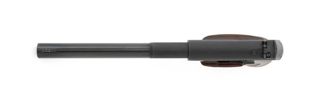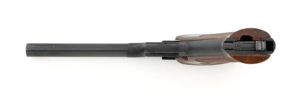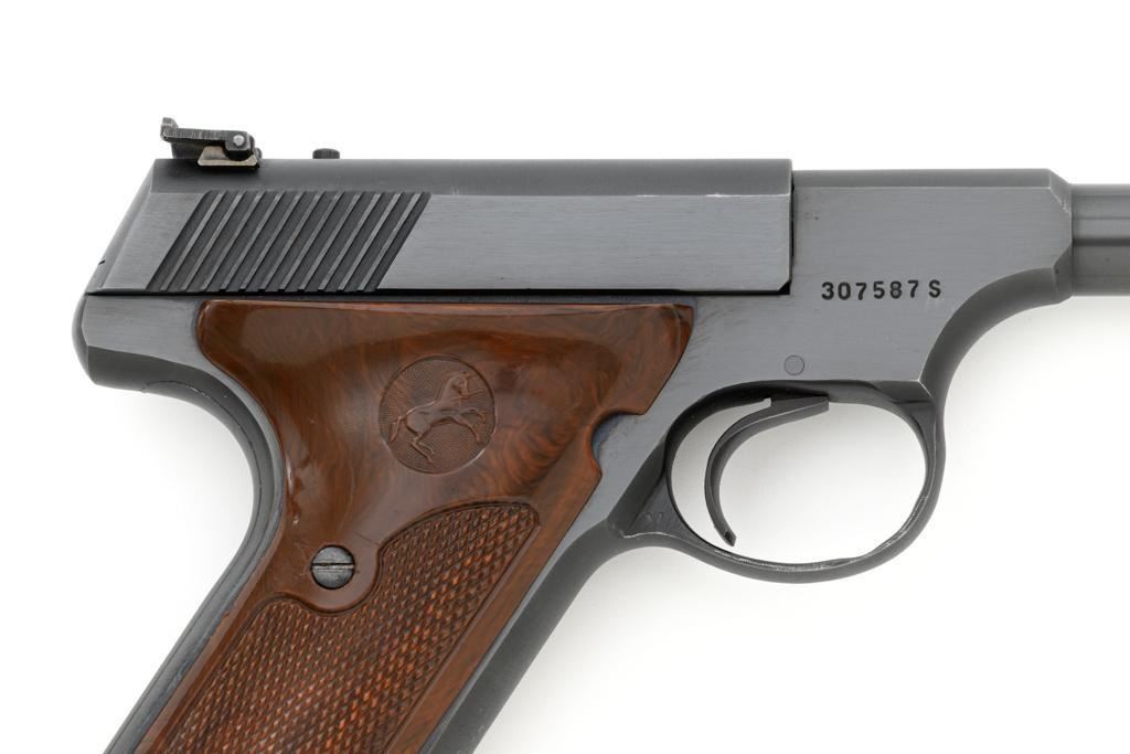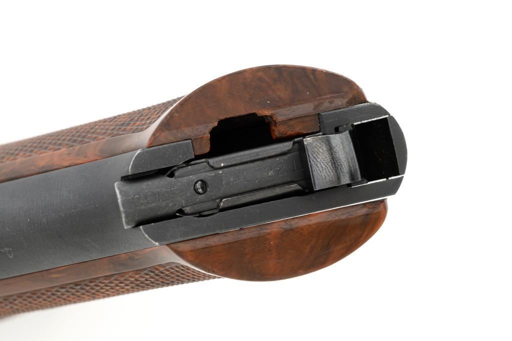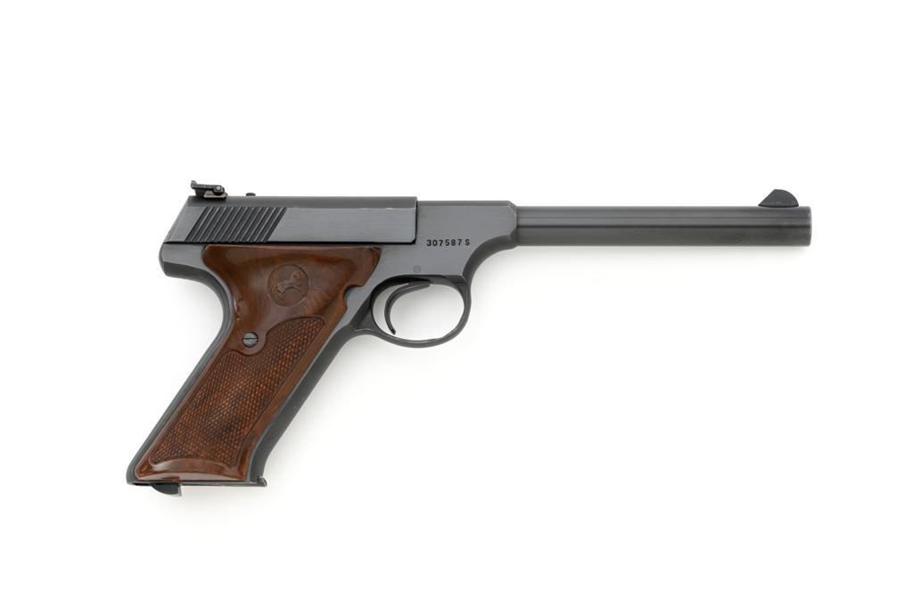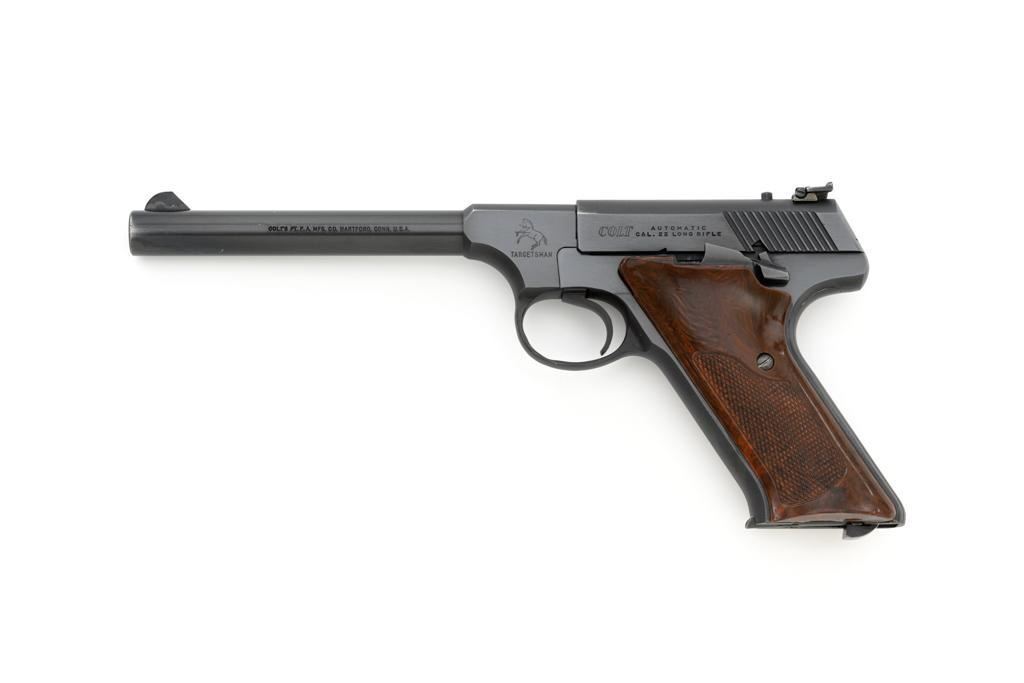 Colt Targetsman Semi-Automatic Pistol, #307587S, .22 LR cal., 6" barrel, blue finish, checkered Coltwood two-piece grips, serrated blade front sight, and adjustable square-notch rear sights, with one 10-round Colt magazine. Mfgd 1976. Pistol is in near excellent overall condition, retaining approx. 97%-98% factory blue, with light wear at the muzzle, and intermittent minor handling marks. Grips are near excellent with sharp checkering detail. Action functions smoothly. Bore is mirror bright with excellent rifling, showing little use. Est.: $400-$600. (Modern/PPT)
