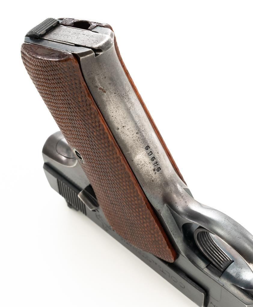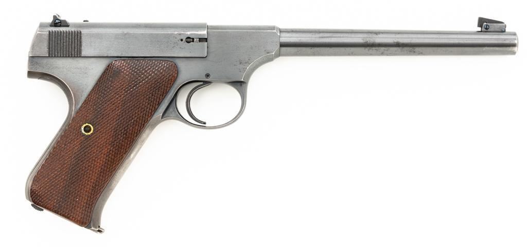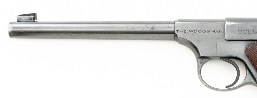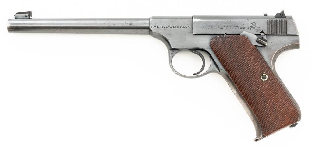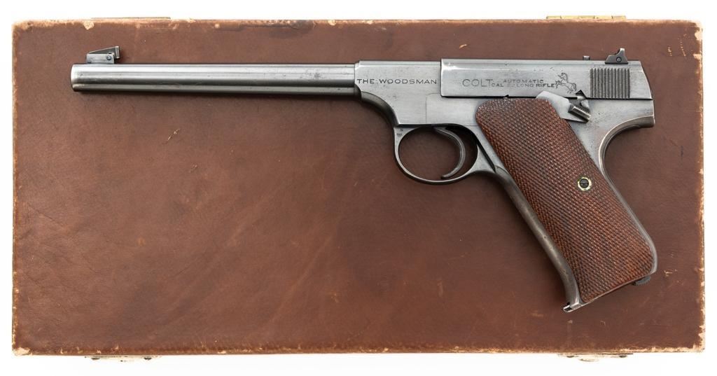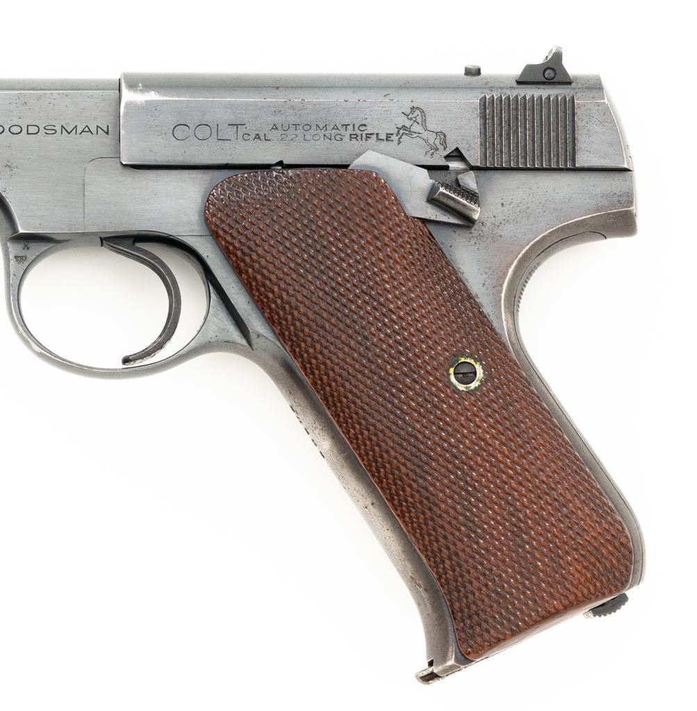 Colt Woodsman 1st Series Semi-Automatic Pistol, #94969, .22 LR cal., 6.6" barrel, blue finish, checkered walnut two-piece grips, pinned blade front sight, drift adjustable square-notch rear sight, with one correct 10-round magazine, marked "COLT WOODSMAN / CAL.22 L.R." on the base. Includes a custom, period leatherette covered wooden case with black felt interior, including bore brush, tool and an additional later 10-round blue steel magazine, marked "COLT / CAL. 22 L.R." on the base. Mfgd 1935. Pistol is in fine overall condition, retaining approx. 94%-95% factory blue, with edgewear on the frame and slide, front and backstrap drifting to gray. Grips are fine, with sharp checkering detail, and an added coat of varnish. Action functions smoothly. Bore is bright with well-defined rifling. Case is in very good condition with exposed edges and corners, showing wear and age on the exterior. Interior with impressions and light soiling. Est.: $600-$800. (C&R/PPT)