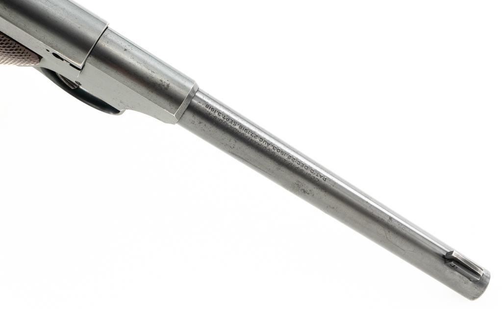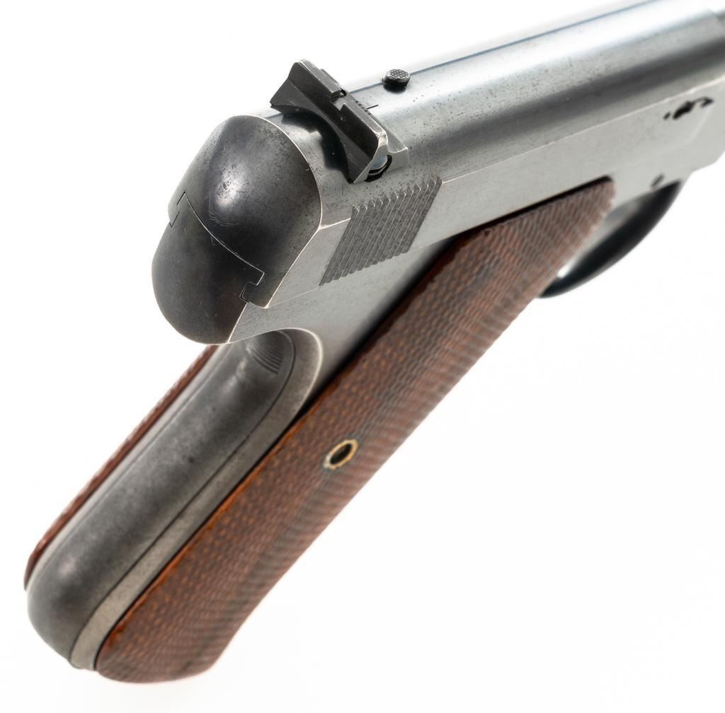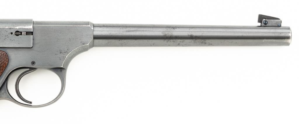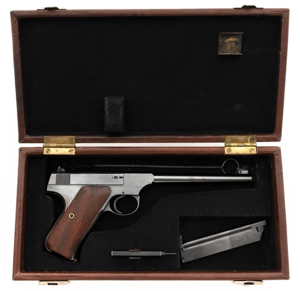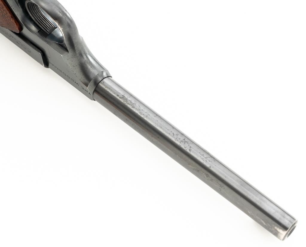 Colt Woodsman 1st Series Semi-Automatic Pistol, #94969, .22 LR cal., 6.6" barrel, blue finish, checkered walnut two-piece grips, pinned blade front sight, drift adjustable square-notch rear sight, with one correct 10-round magazine, marked "COLT WOODSMAN / CAL.22 L.R." on the base. Includes a custom, period leatherette covered wooden case with black felt interior, including bore brush, tool and an additional later 10-round blue steel magazine, marked "COLT / CAL. 22 L.R." on the base. Mfgd 1935. Pistol is in fine overall condition, retaining approx. 94%-95% factory blue, with edgewear on the frame and slide, front and backstrap drifting to gray. Grips are fine, with sharp checkering detail, and an added coat of varnish. Action functions smoothly. Bore is bright with well-defined rifling. Case is in very good condition with exposed edges and corners, showing wear and age on the exterior. Interior with impressions and light soiling. Est.: $600-$800. (C&R/PPT)