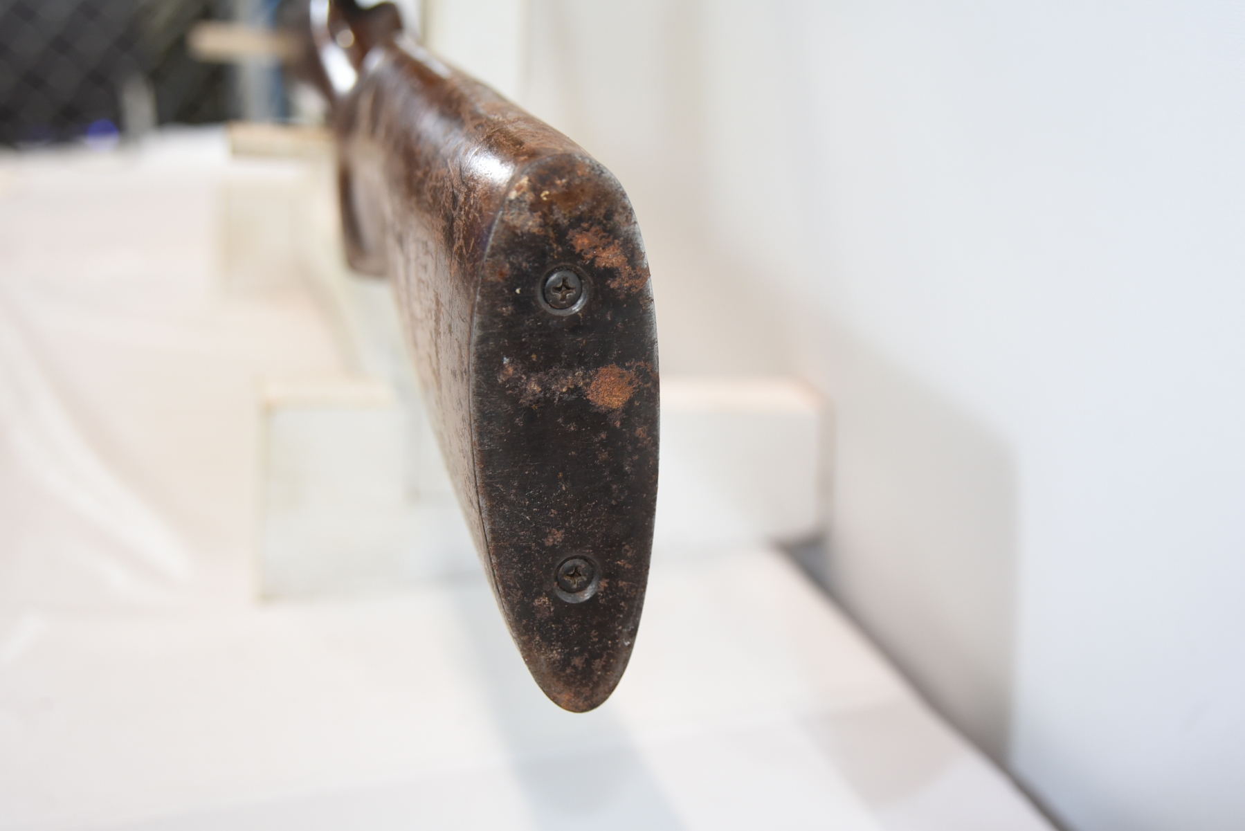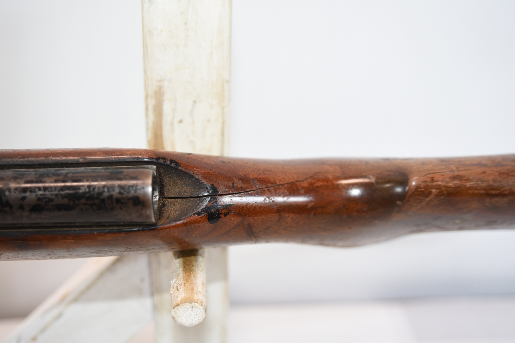 Wood stock shows scratches, stock is also from another model of Cooey, scuffs, finish wear, a crack on the upper grip area, and a chip in the mounting receiver screw area; condition is less than fair.
