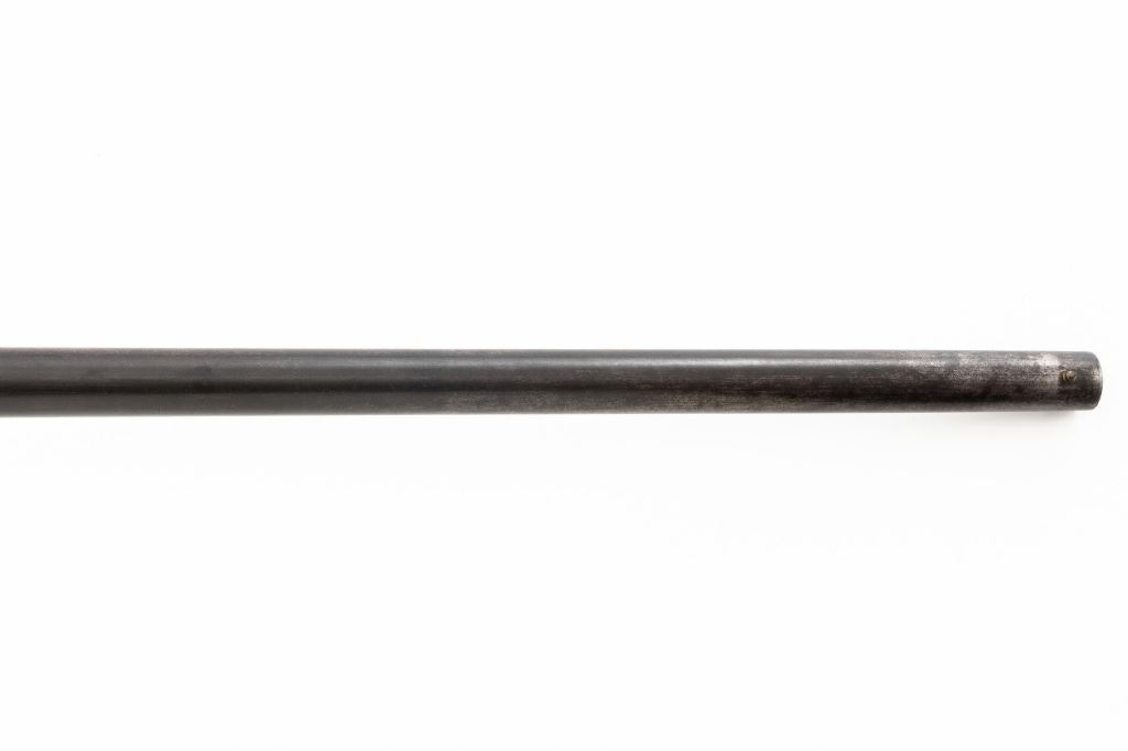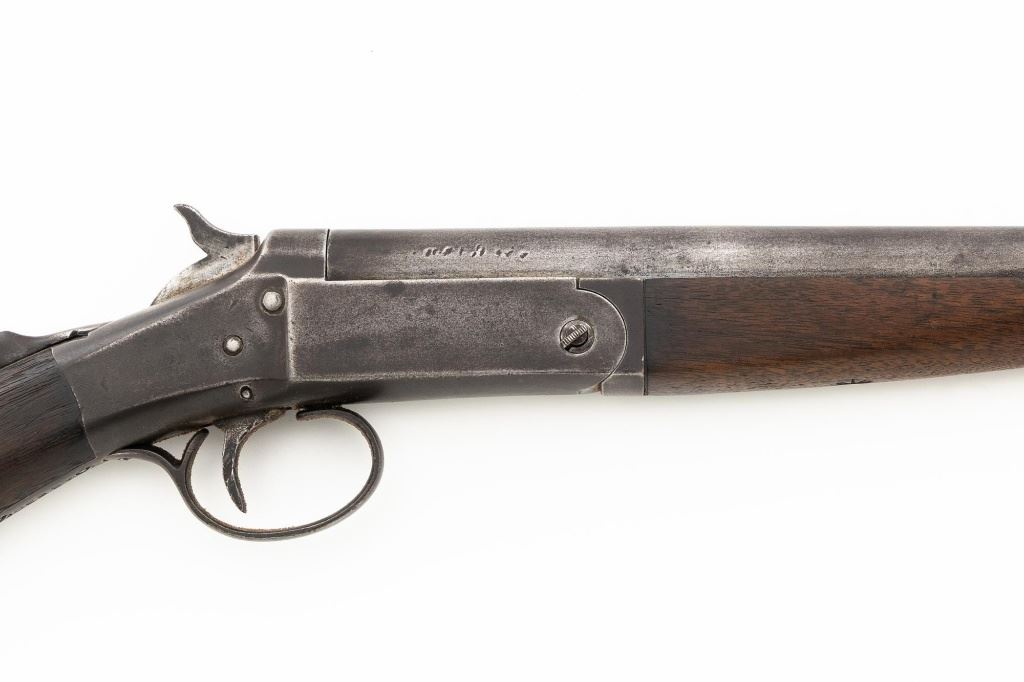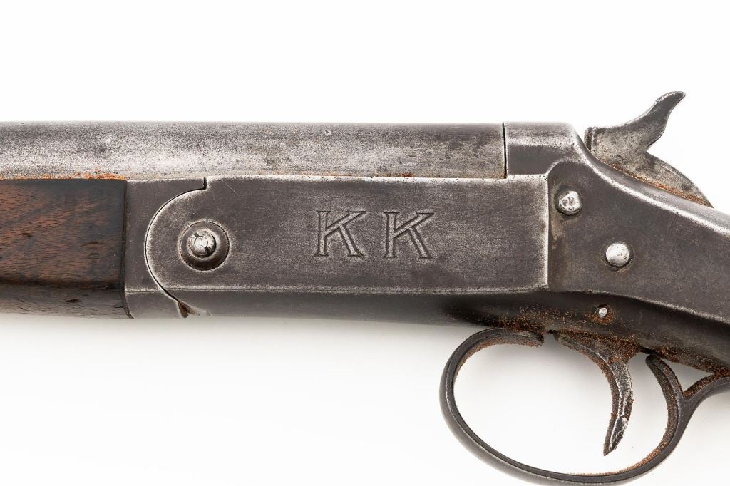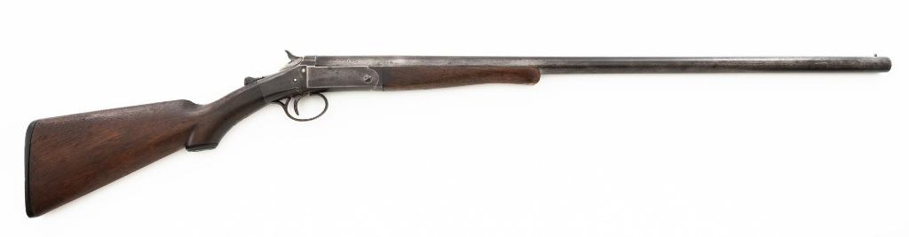 Crescent Firearms Kleen Kutter Single Shot Shotgun, #A2530, 12 ga., 30" barrel, blue finish, smooth walnut pistol grip stock and Schnabel forend, hard rubber Simmons Hardware grip cap, brass bead front sight, exposed hammer, and tang safety. Left side of the receiver is marked "KK". Mfgd circa 1920s. Shotgun is in good overall condition, with the metal surfaces going to gray patina, with indentations and light surface erosion along the barrel. Receiver shows edgewear and some erosion. Factory markings are clear. Stock with general indentations and scrapes, ending with a hard rubber Simmons buttplate, providing a 14.1" LOP. Action functions well and locks up securely. Bore is good with minor erosion. Est.: $100-$200. (C&R)